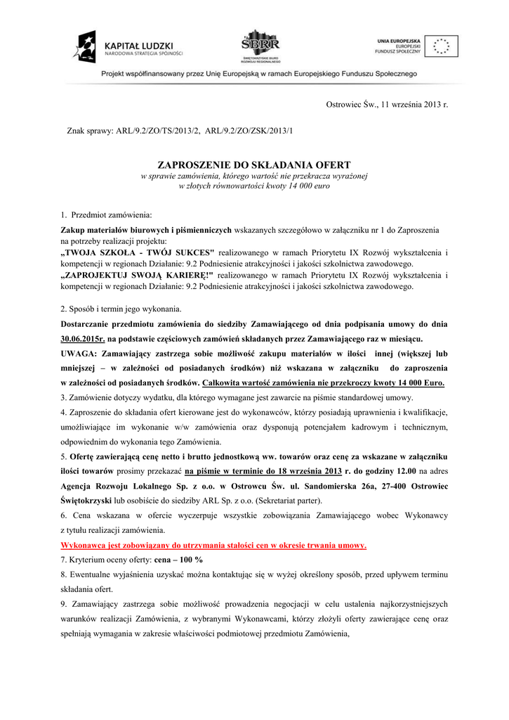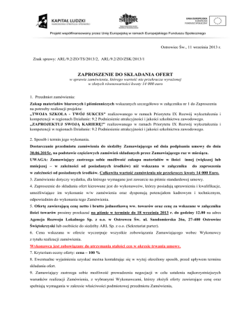 Ostrowiec Św., 11 września 2013 r. Znak sprawy: ARL/9.2/ZO/TS/2013/2, ARL/9.2/ZO/ZSK/2013/1 ZAPROSZENIE DO SKŁADANIA OFERT w sprawie zamówienia, którego wartość nie przekracza wyrażonej w złotych równowartości kwoty 14 000 euro 1. Przedmiot zamówienia: Zakup materiałów biurowych i piśmienniczych wskazanych szczegółowo w załączniku nr 1 do Zaproszenia na potrzeby realizacji projektu: „TWOJA SZKOŁA - TWÓJ SUKCES" realizowanego w ramach Priorytetu IX Rozwój wykształcenia i kompetencji w regionach Działanie: 9.2 Podniesienie atrakcyjności i jakości szkolnictwa zawodowego. „ZAPROJEKTUJ SWOJĄ KARIERĘ!" realizowanego w ramach Priorytetu IX Rozwój wykształcenia i kompetencji w regionach Działanie: 9.2 Podniesienie atrakcyjności i jakości szkolnictwa zawodowego. 2. Sposób i termin jego wykonania. Dostarczanie przedmiotu zamówienia do siedziby Zamawiającego od dnia podpisania umowy do dnia 30.06.2015r. na podstawie częściowych zamówień składanych przez Zamawiającego raz w miesiącu. UWAGA: Zamawiający zastrzega sobie możliwość zakupu materiałów w ilości innej (większej lub mniejszej – w zależności od posiadanych środków) niż wskazana w załączniku do zaproszenia w zależności od posiadanych środków. Całkowita wartość zamówienia nie przekroczy kwoty 14 000 Euro. 3. Zamówienie dotyczy wydatku, dla którego wymagane jest zawarcie na piśmie standardowej umowy. 4. Zaproszenie do składania ofert kierowane jest do wykonawców, którzy posiadają uprawnienia i kwalifikacje, umożliwiające im wykonanie w/w zamówienia oraz dysponują potencjałem kadrowym i technicznym, odpowiednim do wykonania tego Zamówienia. 5. Ofertę zawierającą cenę netto i brutto jednostkową ww. towarów oraz cenę za wskazane w załączniku ilości towarów prosimy przekazać na piśmie w terminie do 18 września 2013 r. do godziny 12.00 na adres Agencja Rozwoju Lokalnego Sp. z o.o. w Ostrowcu Św. ul. Sandomierska 26a, 27-400 Ostrowiec Świętokrzyski lub osobiście do siedziby ARL Sp. z o.o. (Sekretariat parter). 6. Cena wskazana w ofercie wyczerpuje wszystkie zobowiązania Zamawiającego wobec Wykonawcy z tytułu realizacji zamówienia. Wykonawca jest zobowiązany do utrzymania stałości cen w okresie trwania umowy. 7. Kryterium oceny oferty: cena – 100 % 8. Ewentualne wyjaśnienia uzyskać można kontaktując się w wyżej określony sposób, przed upływem terminu składania ofert. 9. Zamawiający zastrzega sobie możliwość prowadzenia negocjacji w celu ustalenia najkorzystniejszych warunków realizacji Zamówienia, z wybranymi Wykonawcami, którzy złożyli oferty zawierające cenę oraz spełniają wymagania w zakresie właściwości podmiotowej przedmiotu Zamówienia, 10. Realizacja zamówienia zostanie zlecona Wykonawcy, który zaoferował ostatecznie najkorzystniejsze warunki realizacji Zamówienia i przyjął wymagania określone w zaproszeniu do składania ofert oraz zgodził się na zawarcie pisemnej umowy. 11. Zamawiający zastrzega możliwość udzielenia kolejnego zamówienia do wysokości 50% wartości zamówienia określonego w umowie z Wykonawcą w tym samym roku kalendarzowym, jeżeli zachodzi konieczność udzielenia zamówienia tożsamego z uprzednio udzielonym zamówieniem, a udzielenie zamówienia w ten sposób jest z korzyścią dla Zamawiającego. Prezes Zarządu ARL Sp. z o.o. Magdalena Salwerowicz Załącznik nr 1 do Zaproszenia Lp. 1 2 3 4 5 6 7 8 9 10 Nazwa J.m Brulion A4 96K Kratka sztuka w grubej okładce Długopis automatyczny INKJOYsztuka niebieski, czarny Teczka kartonowa na rzep A4 VauPe (z sztuka tektury pokrytej folią polipropylenową) Długopis jednorazowy z cienką końcówką sztuka (BIC Orange) Długopis Cello Maxritter z sztuka wymiennym wkładem - różne kolory Dziurkacz biurowy metalowy z metalową podstawką i sztuka uchwytem (do 25 kartek) Etykieta samoprzylepna, A4 Opakowanie (opakowanie/100 szt.) IGEPA Folia Bezbarwna 150 MIC, 100 szt/op. opakowanie (okładki do bindowania-przód) Folia do faxu – Panasonic KX-FC228 sztuka oryginalna KX-FA52A Folia do laminowania PE/A4 100 MIC St. Bł. sztuka Antyst.(100 szt.) Ilość sztuk nie mniej niż 50 50 50 14 14 2 4 4 4 4 Cena netto za sztukę Cena brutto za sztukę Cena netto za całość Cena brutto za całość 11 12 13 14 15 16 17 18 19 20 21 22 23 24 25 26 27 Gumka do ścierania dwuczęściowa Pelikan AC30 Karteczki indeksujące 20 x 50 mm, 4 x 50 szt. 3M Karteczki samoprzylepne – notes 76x76, 450 arkuszy w opakowaniu, mix kolor Klipy biurowe 19mm (op/12szt.) Klipy biurowe 25mm (op/12szt.) koperta A4 plastikowa na zatrzask Korektor w płynie z aplikatorem (20ml) Tippex Korektor w taśmie 10M Tippex Kostka kolor 85*85 10 kolor koszulki A4, 100 sztuk w op. 50mic Koszulki na płyty z europerforacją (op./10 szt.) Koszulki na dokumenty A4 groszkowe (op./100 szt) 50mic Listwy wsuwane 9 mm, (op./50szt) Marker do płyt CD / DVD 1mm (czarny) Edding M Marker suchościeralny do tablicy z gabką, 4 kolory+gabka Pentel Masa mocująca kolorowa 57G Nożyczki asymetryczne z uchwytem z sztuka 6 sztuka 8 sztuka 8 sztuka 8 sztuka 8 sztuka 8 sztuka 6 sztuka 8 sztuka 8 opakowanie 10 opakowanie 8 Opakowanie 4 opakowanie 4 sztuka 8 sztuka 8 sztuka 2 sztuka 2 28 29 30 31 32 33 34 35 36 37 38 39 tworzywa 21 cm Donau Ofertówki krystaliczne Esselte A4/80 mic "L" (op/100szt.) Okładki nabłyszczane A4/250g - kolor (op/100szt.) Ołówek grafitowy z gumką Pelican Papier do Flipcharta 50 kartek gładki 65x100 cm Papier ksero kolor A4 80g/m2 (500 ark.) Papier Xero A4 Colorit 160g Maestro Color (ryza - 250ark.) Papier xero biały A4/80g (op./5ryz) białość 166 Maestro Extra Płyty CD-R 700MB/80 MIN (op./50 szt) Verbatim Płyty DVD 4,7 GB (op./25szt.) Verbatim Przekładki do segregatora A4 (kartonowe z laminowanymi indeksami) 12 szt. w opakowaniu Przekładki rozdzielające do segregatorów 1/3 A4 (op. 100 szt.) Pudło archiwizacyjne zbiorcze (na segregatory A4) otwierane z przodu