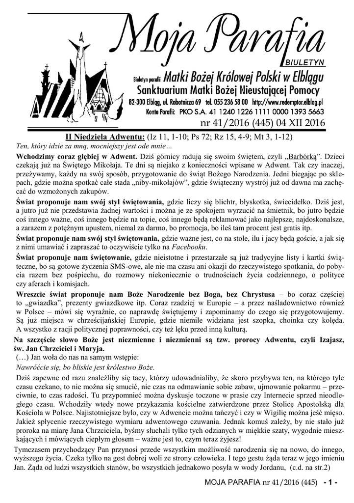 nr 41/2016 (445) 04 XII 2016 I II Niedziela Adwentu: (Iz 11, 1-10; Ps 72; Rz 15, 4-9; Mt 3, 1-12) Ten, który idzie za mną, mocniejszy jest ode mnie… Wchodzimy coraz głębiej w Adwent. Dziś górnicy radują się swoim świętem, czyli „Barbórką”. Dzieci czekają już na Świętego Mikołaja. Te dni są niejako z konieczności wpisane w Adwent. Tak czy inaczej, przeżywamy, każdy na swój sposób, przygotowanie do świąt Bożego Narodzenia. Jedni biegając po sklepach, gdzie można spotkać całe stada „niby-mikołajów”, gdzie świąteczny wystrój już od dawna ma zachęcać do wzmożonych zakupów. Świat proponuje nam swój styl świętowania, gdzie liczy się blichtr, błyskotka, świecidełko. Dziś jest, a jutro już nie przedstawia żadnej wartości i można je ze spokojem wyrzucić na śmietnik, bo jutro będzie coś innego ważne, coś innego będzie na topie, coś innego będą reklamować jako najlepsze, najdoskonalsze, a zarazem z potężnym upustem, niemal za darmo, bo promocja, bo ileś tam procent jest gratis itp. Świat proponuje nam swój styl świętowania, gdzie ważne jest, co na stole, ilu i jacy będą goście, a jak się z nimi umawiać i zapraszać to oczywiście tylko na Facebooku. Świat proponuje nam świętowanie, gdzie nieistotne i przestarzałe są już tradycyjne listy i kartki świąteczne, bo są gotowe życzenia SMS-owe, ale nie ma czasu ani okazji do rzeczywistego spotkania, do pobycia razem bez pośpiechu, do rozmowy niekoniecznie o trudnościach życia codziennego, o polityce czy aferach i komisjach. Wreszcie świat proponuje nam Boże Narodzenie bez Boga, bez Chrystusa – bo coraz częściej to „gwiazdka”, prezenty gwiazdkowe itp. Coraz rzadziej w Europie – a przez naśladownictwo również w Polsce – mówi się wyraźnie, co naprawdę świętujemy i zapominamy do czego się przygotowujemy. Są już miejsca w chrześcijańskiej Europie, gdzie niemile widziana jest szopka, choinka czy kolęda. A wszystko z racji politycznej poprawności, czy też lęku przed inną kulturą. Na szczęście słowo Boże jest niezmienne i niezmienni są tzw. prorocy Adwentu, czyli Izajasz, św. Jan Chrzciciel i Maryja. (…) Jan woła do nas na samym wstępie: Nawróćcie się, bo bliskie jest królestwo Boże. Dziś zapewne od razu znaleźliby się tacy, którzy udowadnialiby, że skoro przybywa ten, na którego tyle czasu czekano, to nie można się smucić, nie czas na odmawianie sobie zabaw, ujmowanie pokarmu – przeciwnie, to czas radości. Tu przypomnieć można dyskusje toczone w prasie czy Internecie sprzed nieodległego czasu. Wchodziły wtedy nowe przykazania kościelne zatwierdzone przez Stolicę Apostolską dla Kościoła w Polsce. Najistotniejsze było, czy w Adwencie można tańczyć i czy w Wigilię można jeść mięso. Jakież spłycenie rzeczywistego wymiaru adwentowego czuwania. Jednak komuś zależy, by nie stało już proroka na miarę Jana Chrzciciela, byśmy słuchali tylko tych odzianych w miękkie szaty, wygodnie mieszkających i mówiących ciepłym głosem – ważne jest to, czym teraz żyjesz! Tymczasem przychodzący Pan przynosi przede wszystkim możliwość narodzenia się na nowo, do innego, wyższego życia. Czeka tylko na gest dobrej woli ze strony człowieka. I tego gestu żąda teraz w jego imieniu Jan. Żąda od ludzi wszystkich stanów, bo wszystkich jednakowo posyła w wody Jordanu, (c.d. na str.2) MOJA PARAFIA nr 41/2016 (445) - 1 - PROGRAM REKOLEKCJI ADWENTOWYCH 10 –14.12.2016 r. 10 grudzień (sobota) godz. 1800 – Msza św. i kazanie rekolekcyjne 11 grudzień (niedziela) 00 30 00 30 00 30 godz. 7 , 8 , 10 , 11 , 13 , 16 , 1830 – Msza św. z kazaniem rekolekcyjnym 12 grudzień (poniedziałek) godz. 600 – Roraty z krótkim kazaniem rekolekcyjnym godz. 1000, 1630, 1930 – Msza św. z kazaniem rekolekcyjnym Rekolekcje adwentowe dla dzieci – Msza św. o godz. 1800 13 grudzień (wtorek) godz. 600 – Roraty z krótkim kazaniem rekolekcyjnym godz. 1000, 1630, 1930 – Msza św. z kazaniem rekolekcyjnym Rekolekcje adwentowe dla dzieci – Msza św. o godz. 1800 godz. 1730 – Nowenna Nieustanna do Matki Bożej Nieustającej Pomocy 14 grudzień (środa) 00 godz. 6 – Roraty z krótkim kazaniem rekolekcyjnym godz. 1000, 1630, 1930 – Msza św. z kazaniem rekolekcyjnym Rekolekcje adwentowe dla dzieci – Msza św. o godz. 1800 Spowiedź św. Poniedziałek, wtorek i środa – pół godziny przed rozpoczęciem Mszy św. Rekolekcje prowadzi Ks. dr Łukasz Łaszkiewicz, wykładowca WSD w Paradyżu (c.d. ze str. 1)by przez symboliczny gest obmycia z win, przygotować ich serca na przyjęcie Tego, który wkrótce chrzcił będzie Duchem Świętym i ogniem. Przygotowanie drogi Panu i prostowanie ścieżek to nic innego jak zerwanie z grzechem. I tego żąda twardo i nieustępliwie Jan nad Jordanem. Może warto w tym kontekście spojrzeć na nasz Adwent. Jak go przeżywamy? Czy widzimy tylko wieniec adwentowy, roratnie świece, tęskne, chwytające za serce pieśni: Archanioł Boży Gabriel, Spuście nam na ziemskie niwy czy też Oto Pan Bóg przyjdzie. Jakże często nasz Adwent nas już niczym nie straszy, niczego nie żąda, pozwala sercu spać w dawnym brudzie. Jednak taki Adwent, który nie przeprowadzi przez nawrócenie, pokutę i konfesjonał, nie jest chrześcijańskim Adwentem. I nie wprowadzi w Boże Narodzenie, choćby była i Wigilia, i choinka, i kolędy, i prezenty, i goście! A przecież warto pamiętać – Ten, który idzie za mną, mocniejszy jest ode mnie… (…) O. Marian Krakowski CSsR, Duszpasterz w Parafii Św. Józefa i Sanktuarium Matki Bożej Nieustającej Pomocy w Toruniu http://www.slowo.redemptor.pl/pl/4617/8426/ii-niedziela-adwentu.html MOJA PARAFIA nr 41/2016 (445) Do użytku wewnętrznego - 2 - INTENCJE MSZALNE Iz 35, 1-10; Ps 85; Łk 5, 17-26 Poniedziałek 05.12 6:00 8:00 18:00 Karmel 1. O błog. Boże w dniu urodzin Henryki i Stanisława oraz za zm. Agnieszka, Stanisław, Eu
