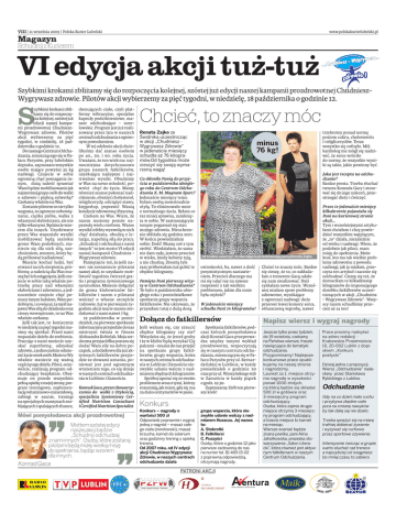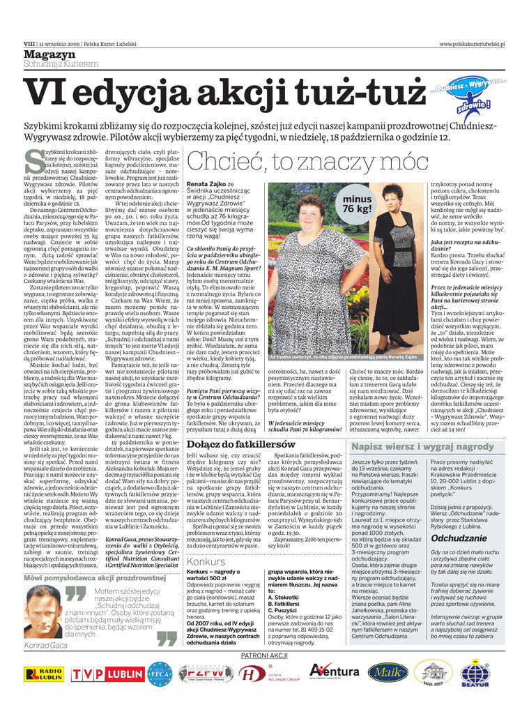 VIII | 11 września 2009 | Polska Kurier Lubelski www.polskakurierlubelski.pl Magazyn Schudnij zKurierem VI edycja akcji tuż-tuż Szybkimi krokami zbliżamy się do rozpoczęcia kolejnej, szóstej już edycji naszej kampanii prozdrowotnej ChudnieszWygrywasz zdrowie. Pilotów akcji wybierzemy za pięć tygodni, w niedzielę, 18 października o godzinie 12. S zybkimi krokami zbliżamy się do rozpoczęcia kolejnej, szóstej już edycji naszej kampanii prozdrowotnej ChudnieszWygrywasz zdrowie. Pilotów akcji wybierzemy za pięć tygodni, w niedzielę, 18 października o godzinie 12. DonaszegoCentrumOdchudzania, mieszczącego się w Pałacu Parysów, przy lubelskim deptaku, zapraszam wszystkie osoby mające powyżej 35 kg nadwagi. Czujecie w sobie ogromną chęć pomagania innym, dużą radość sprawiać Wam będzie mobilizowanie jak najszerszej grupy osób dowalki o zdrowie i piękną sylwetkę? Czekamy właśnie na Was. Zostanie pilotem to nie tylko wygrana, to ogromne zobowiązanie, ciężka próba, walka z własnymi słabościami, ale nie tylko własnymi. Będziecie wzorem dla innych. Uzyskiwane przez Was wspaniałe wyniki mobilizować będą szerokie grono Wam podobnych, staniecie się dla nich siłą, natchnieniem, wzorem, który będą próbować naśladować. Musicie kochać ludzi, być otwarci na ich cierpienia, problemy, a radością dla Was musząbyćichosiągnięcia.Jeśliczujecie w sobie taką właśnie potrzebę pracy nad własnymi słabościami i zdrowiem, a jednocześnie czujecie chęć pomocyinnymludziom,Wampodobnym, i co więcej, ta myśl napawa Was siłą dodziałania oraz cieszy wewnętrznie, to na Was właśnie czekamy. Jeśli tak jest, to koniecznie w niedzielę za pięć tygodni musimy się spotkać. Przed nami wspaniałe dzieło do zrobienia. Pracując z nami możecie uzyskać superformę, odzyskać zdrowie,ajednocześnieodmienićżyciesetekosób.MożetoWy właśnie staniecie się ważną częściątego dzieła.Piloci,oczywiście, realizują program odchudzający bezpłatnie. Obejmuje on przede wszystkim pełnąopiekęzmojejstrony,program treningowy, suplementacjęwitaminowo-minerałową, zabiegi w saunie, treningi na specjalnych maszynach rozbijających i spalających tłuszcz, drenujących ciało, czyli platformy wibracyjne, specjalne kapsuły podciśnieniowe, masaże odchudzające - norelowskie. Program jest już realizowany przez lata w naszych centrachodchudzaniazogromnym powodzeniem. W tej odsłonie akcji chcielibyśmy dać szanse osobom po 40., 50. i 60. roku życia. Uważam, że ten wiek ma najmocniejsza dotychczasowo grupa naszych fatkillersów, uzyskująca najlepsze i najtrwalsze wyniki. Obudzimy w Was na nowo młodość, powróci chęć do życia. Mamy również szanse pokonać nadciśnienie, obniżyć cholesterol, trójglicerydy, odciążyć stawy, kręgosłup, poprawić Waszą kondycje zdrowotną i fizyczną. Czekam na Was. Wiem, że razem możemy pomóc naprawdę wielu osobom. Wasze wyniki i efekty wyzwolą w nich chęć działania, obudzą z letargu, napełnią siłą do pracy. „Schudnij i odchudzaj z nami innych” to jest motto VI edycji naszej kampanii Chudniesz Wygrywasz zdrowie. Pamiętajcie też, że jeśli nawet nie zostaniecie pilotami naszej akcji, to uzyskacie możliwość tygodnia ćwiczeń gratis i programu żywieniowego na ten okres. Możecie dołączyć do grona klubowiczów fatkillersów i razem z pilotami walczyć o własne szczęście i zdrowie. Już w pierwszym tygodniu akcji macie szanse zredukować z nami nawet 7 kg. 19 października w poniedziałek, na pierwsze spotkanie informacyjne przyjedzie do nas mistrzyni świata w fitness Aleksandra Kobielak. Moja serdeczna przyjaciółka postara się dodać Wam siły na dobry początek, a dodatkowo dla już aktywnych fatkillersów przyjedzie ze słowami uznania, ponieważ jest pod ogromnym wrażeniem tego, co się dzieje w naszych centrach odchudzania w Lublinie i Zamościu. KonradGaca,prezesStowarzyszenia do walki z Otyłością, specjalista żywieniowy Certified Nutrition Consultant i Certified Nutrition Specialist Mówi pomysłodawca akcji prozdrowotnej ’’ Mottem szóstej edycji naszej akcji będzie „Schudnij i odchudzaj z nami innych”. Osoby, które zostaną pilotami będą miały wielką misję do spełnienia, będąc wzorem dla innych. Konrad Gaca ’’ Chcieć, to znaczy móc Renata Zajko ze Świdnika uczestnicząc w akcji „Chudniesz Wygrywasz Zdrowie” w jedenaście miesięcy schudła aż 76 kilogramów.Od tygodnia może cieszyć się swoją wymarzoną wagą! Co skłoniło Panią do przyjścia w październiku ubiegłego roku do Centrum Odchudzania K. M. Magnum Sport? Jedenaście miesięcy temu byłam osobą monstrualnie otyłą. To eliminowało mnie z normalnego życia. Byłam co raz mniej sprawna, zamknięta w sobie. W zastraszającym tempie pogarszał się stan mojego zdrowia. Nieuchronnie zbliżała się godzina zero. W końcu powiedziałam sobie: Dość! Muszę coś z tym zrobić. Wiedziałam, że sama nie dam rady, jestem przecież w wieku, kiedy kobiety tyją, a nie chudną. Zresztą tyle razy próbowałam już gubić te zbędne kilogramy. Pamięta Pani pierwszą wizytę w Centrum Odchudzania? To było 6 października ubiegłego roku i poniedziałkowe spotkanie grupy wsparcia fatkillersów. Nie ukrywam, że przyszłam tutaj z dużą dozą minus 76 kg! Jaka jest recepta na odchudzanie? Bardzo prosta. Trzeba słuchać trenera Konrada Gacy i stosować się do jego zaleceń, przestrzegać diety i ćwiczyć. Aż trudno uwierzyć, że oba zdjęcia przedstawiają panią Renatę Zajko ostrożności, ba, nawet z dość pesymistycznym nastawieniem. Przecież dlaczego ma mi się udać raz na zawsze rozprawić z tak wielkim problemem, jakim dla mnie była otyłość? W jedenaście miesięcy schudła Pani 76 kilogramów! Dołącz do fatkillersów Jeśli wahasz się, czy zrzucić zbędne kilogramy czy nie? Wstydzisz się, że jesteś gruby i że w klubie będą wytykać Cię 
