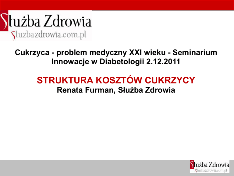 Cukrzyca - problem medyczny XXI wieku - Seminarium Innowacje w Diabetologii 2.12.2011 STRUKTURA KOSZTÓW CUKRZYCY Renata Furman, Służba Zdrowia Cukrzyca pochłania około 15% wydatków na ochronę zdrowia w większości rozwiniętych krajów świata1. 1. IDF http://www.diabetesatlas.com/content/europe, lipiec 2011. Koszty cukrzycy Europa Wydatki roczne (USD) na głowę mieszkańca z tytułu prewencji diagnostyki i leczenia cukrzycy w wybranych państwach Unii Europejskiej2 2. Health expenditure for diabetes, 2010 and 2030 – European Region. Diabetes Atlas, IDF, http://www.diabetesatlas.com/content/economic-impactsdiabetes, 2011.Expenditure data are in 2005 USD and derived from the World Health Statistics 2008, http://www.who.int/whosis/whostat/2008/en/index.html. Koszty cukrzycy w Polsce analiza przeprowadzona w oparciu o dane NFZ i ZUS3 3. Raport przygotowany przez Akademię Leona Koźmińskiego, Warszawa 2011. Koszty cukrzycy w Polsce3 Analiza kosztów bezpośrednich Koszty świadczeń zdrowotnych (leczenie szpitalne i opieka specjalistyczna) z powodu cukrzycy w roku 2009 były ponad dwukrotnie większe w stosunku do roku 2004. •W przypadku cukrzycy typu 1 tak duży wzrost kosztów spowodowany był ponad 80% wzrostem średniego kosztu świadczenia, co było w głównej mierze spowodowane wprowadzeniem w tym okresie refundacji pomp insulinowych i osprzętu do pomp dla dzieci. •Wzrost kosztów cukrzycy typu 2 był spowodowany głównie wzrostem epidemiologicznym, gdyż średni koszt świadczenia w roku 2009 był większy niż świadczenie w 2004 roku tylko o 30%. •Zarówno w przypadku typu 1, jak i typu 2 cukrzycy główną składową kosztów stanowią świadczenia szpitalne. •W 2009 roku średni koszt świadczenia zdrowotnego udzielonego z powodu cukrzycy pacjentowi z rozpoznaną cukrzycą typu 2 wyniósł w Polsce 414 PLN, a z rozpoznaną cukrzycą typu 1 − 926 PLN. • 3. Raport przygotowany przez Akademię Leona Koźmińskiego, Warszawa 2011. Koszty cukrzycy w Polsce3 Analiza kosztów bezpośrednich Wartość świadczeń udzielonych z powodu cukrzycy typu 1 i typu 2 w latach 2004-2009 (bez kosztów podstawowej opieki zdrowotnej, POZ) 3. Raport przygotowany przez Akademię Leona Koźmińskiego, Warszawa 2011. Koszty cukrzycy w Polsce3 Analiza kosztów refundacji leków stosowanych w leczeniu cukrzycy Koszt refundacji leków rósł w niższym tempie niż koszt świadczeń zdrowotnych • Koszty płatnika z tytułu refundacji leków przeciwcukrzycowych wzrosły w latach 2005 - 2009 okresie o 26%. • *brak danych za 2004 rok dla refundacji leków 3. Raport przygotowany przez Akademię Leona Koźmińskiego, Warszawa 2011. Koszty cukrzycy w Polsce3 Analiza kosztów refundacji leków stosowanych w leczeniu cukrzycy Koszt refundacji leków stosowanych w terapii cukrzycy w latach 2005-2009 3. Raport przygotowany przez Akademię Leona Koźmińskiego, Warszawa 2011. Koszty cukrzycy w Polsce Koszty leczenia powikłań cukrzycy Baza danych NFZ od 2008 roku umożliwiła również wyodrębnienie kosztów leczenia powikłań cukrzycy (bez refundacji leków). W 2009 roku wyniosły one 1 743 mln PLN i były prawie 5-krotnie większe niż koszty leczenia samej cukrzycy. • W porównaniu z rokiem 2008 nastąpił wzrost o 40%. Największy udział w kosztach leczenia powikłań cukrzycy mają choroby serca. • 3. Raport przygotowany przez Akademię Leona Koźmińskiego, Warszawa 2011. Koszty cukrzycy w Polsce Koszty leczenia powikłań cukrzycy Struktura kosztów świadczeń udzielonych z powodu powikłań cukrzycy w 2009 roku 3. Raport przygotowany przez Akademię Leona Koźmińskiego, Warszawa 2011. Koszty cukrzycy w Polsce Koszty pośrednie W związku z wprowadzonymi rozwiązaniami systemowymi liczba przyznawanych rent z roku na rok spada. Liczba orzeczeń o niezdolności do pracy zmalała także w przypadku cukrzycy. Analizując dane za lata 2004-2009, obserwujemy jednak, że tempo spadku w przypadku orzeczeń niezdolności do pracy wśród osób chorych na cukrzycę jest mniejsze niż dla całej populacji, • Dodatkowo w przypadku cukrzycy typu 1 zaobserwowano wzrost w roku 2009 w stosunku do roku 2008. • W analizowanych latach zarówno dla cukrzycy, jak i jej powikłań obserwujemy wzrost przyznawanych świadczeń rehabilitacyjnych i zasiłków chorobowych. • 3. Raport przygotowany przez Akademię Leona Koźmińskiego, Warszawa 2011. Koszty cukrzycy w Polsce koszty pośrednie W 2009 roku 35 160 osób pobierało rentę z tytułu niezdolności do pracy i rentę socjalną z powodu cukrzycy. • Koszty pośrednie z powodu niezdolności do pracy w 2009 roku wyniosły łącznie ponad 2,5 mld PLN (łącznie koszt cukrzycy i powikłań) • • Koszty absencji chorobowej wyniosły ponad 300 mln PLN (łącznie koszt cukrzycy i powikłań) Koszty pośrednie stanowią prawie 50% kosztów cukrzycy. • 3. Raport przygotowany przez Akademię Leona Koźmińskiego, Warszawa 2011. Koszty cukrzycy w Polsce3 Struktura kosztów całkowitych Struktura całkowitych cukrzycy w Polsce w 2009 roku 3. Raport przygotowany przez Akademię Leona Koźmińskiego, Warszawa 2011. Wydatki społeczne Wydatki społeczne związane z niezdolnością do pracy i absencją chorobową Spowodowaną cukrzycą oraz powikłaniami cukrzycy w 2009 roku Z perspektywy społecznej całkowity koszt cukrzycy w Polsce wynosi około 6 mld PLN rocznie. 4 3. Poster publication: ISPOR 14th Annual European Congress, Madrid, Spain 2011.