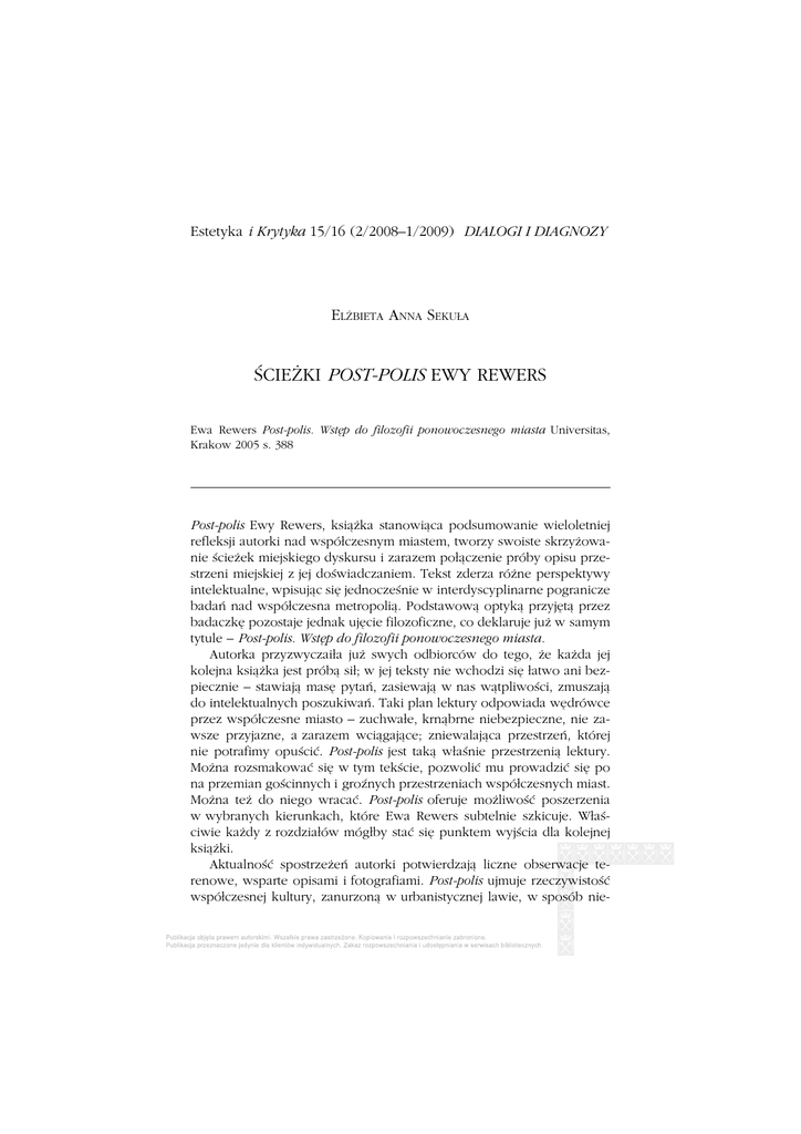 Estetyka i Krytyka 15/16 (2/2008–1/2009) DIALOGI I DIAGNOZY ELŻBIETA ANNA SEKUŁA ŚCIEŻKI POST-POLIS EWY REWERS Ewa Rewers Post-polis. Wstęp do filozofii ponowoczesnego miasta Universitas, Krakow 2005 s. 388 Post-polis Ewy Rewers, książka stanowiąca podsumowanie wieloletniej refleksji autorki nad współczesnym miastem, tworzy swoiste skrzyżowanie ścieżek miejskiego dyskursu i zarazem połączenie próby opisu przestrzeni miejskiej z jej doświadczaniem. Tekst zderza różne perspektywy intelektualne, wpisując się jednocześnie w interdyscyplinarne pogranicze badań nad współczesna metropolią. Podstawową optyką przyjętą przez badaczkę pozostaje jednak ujęcie filozoficzne, co deklaruje już w samym tytule – Post-polis. Wstęp do filozofii ponowoczesnego miasta. Autorka przyzwyczaiła już swych odbiorców do tego, że każda jej kolejna książka jest próbą sił; w jej teksty nie wchodzi się łatwo ani bezpiecznie – stawiają masę pytań, zasiewają w nas wątpliwości, zmuszają do intelektualnych poszukiwań. Taki plan lektury odpowiada wędrówce przez współczesne miasto – zuchwałe, krnąbrne niebezpieczne, nie zawsze przyjazne, a zarazem wciągające; zniewalająca przestrzeń, której nie potrafimy opuścić. Post-polis jest taką właśnie przestrzenią lektury. Można rozsmakować się w tym tekście, pozwolić mu prowadzić się po na przemian gościnnych i groźnych przestrzeniach współczesnych miast. Można też do niego wracać. Post-polis oferuje możliwość poszerzenia w wybranych kierunkach, które Ewa Rewers subtelnie szkicuje. Właściwie każdy z rozdziałów mógłby stać się punktem wyjścia dla kolejnej książki. Aktualność spostrzeżeń autorki potwierdzają liczne obserwacje terenowe, wsparte opisami i fotografiami. Post-polis ujmuje rzeczywistość współczesnej kultury, zanurzoną w urbanistycznej lawie, w sposób niePubl i kacj aobj ęt apr awem aut or ski mi .Wszel ki epr awazast r zeżone.Kopi owani eir ozpowszechni ani ezabr oni one. Publ i kacj apr zeznaczonej edyni edl akl i ent ów i ndywi dual nych.Zakazr ozpowszechni ani aiudost ępni ani aw ser wi sachbi bl i ot ecznych. Ścieżki post-polis Ewy Rewers 327 standardowy – jest próbą oddania „teoretycznego doświadczenia” miasta. Oznacza to, że książka referuje, a często tylko subtelnie zahacza o klasyczne i najnowsze perspektywy badawcze przyjęte wobec zurbanizowanej przestrzeni kultury. Tekst zawiera sygnały, które czytelnik może odnieść do swojego obszaru zainteresowań i podążyć określonym tropem, a jednocześnie wskazuje konkretne przykłady, wzorcowe rozwiązania, realnie istniejące w przestrzeni obiekty, do których badaczka odnosi swą teoretyczną refleksję. Wielorakie, symultaniczne, łączące się we wskazanych punktach styku „sieciowe” doświadczanie miasta pokazuje nowe formy uczestnictwa jego użytkowników w przestrzeni post-polis. Ewa Rewers dzieli materiał na dwie partie (krytyczne miejskie ontologie i zarys tożsamości post-polis), zastrzegając jednocześnie, że badanie i opis może składać się z trzech elementów – etapy te obejmują fenomenologię, aporetykę i teorię. Sama jednak wyraźnie eksponuje dwie pierwsze fazy (a zwłaszcza próby wskazania nierozwiązywalnych sprzeczności), świadomie rezygnując z budowania jednolitej teorii, ponieważ z perspektywy autorki nie jest to ani możliwe, ani konieczne. Autorka interesująco wiąże kwestię doświadczania i odbioru miasta z centralną problematyką badań nad współczesną kulturą, czyniąc te kwestie w zasadzie nierozłącznymi, jako że w jej rozumieniu ta ostatnia jest właśnie kulturą przede wszystkim miejską. Porusza także wielowymiarowe związki między ciałem ludzkim a miejską mapą. Wątek analogii między ciałem miasta a ciałem człowieka przewija się przez cały tekst, powracając w rozmaitych konfiguracjach, wśród których najistotniejsze są chyba: forma i struktura, ruch, zmysłowość i rytm. Kultura gładkiego ciała objawia się w reklamie kremu (obecnej także w miejskim pejzażu wprost, na billboardach) i w kamienicznej fasadzie ze szklanej tafli. Wreszcie, w finale swego tekstu autorka dokonuje pogłębionej analizy dwu – jej zdaniem – podstawowych dzisiaj strategii radzenia sobie z problemem narastającego doznania nierzeczywistości oraz trudności w opisie świata i identyfikacji swojego w nim miejsca – ironii i ekstazy. Obie te formy radzenia sobie z tym, co nas otacza, Ewa Rewers umieszcza w dekoracjach miejskich, pokazując zarówno ich skuteczność, jak i słabości. W moim przekonaniu jednak (i tutaj wyszłabym właśnie od ostatniej partii tekstu poświęconej owym strategiom) centralną kwestią Post-polis pozostaje pytanie, które mniej i bardziej bezpośrednio przewija się przez całą książkę, o związek naukowych prób opisu, analizy, nazywania miejskości, doświadczania miasta oraz łączność tej sytuacji ze stanem odczuwania jednostki w ponowoczesnej kulturze, z rzeczywistym statusem i świadomością uczestników miejskiego spektaklu. Czy obserwacje socjologów, filozofów i antropologów, projekty i plany architektów i ur- Publ i kacj aobj ęt apr awem aut or ski mi .Wszel ki epr awazast r zeżone.Kopi owani eir ozpowszechni ani ezabr oni one. Publ i kacj apr zeznaczonej edyni edl akl i ent ów i ndywi dual nych.Zakazr ozpowszechni ani aiudost ępni ani aw ser wi sachbi bl i ot ecznych. 328 Elżbieta Anna Sekuła banistów, normy wprowadzane przez prawników i regulacje urzędnicze, wreszcie propozycje inwestorów pozostają w rzeczywistej komunikacji z oczekiwaniami, potrzebami i marzeniami człowieka uwikłanego w post-polis? Czy przynajmniej spotykają się z jego zrozumieniem? Post-polis mówiąc o mieście, opowiada zarazem o naszej kulturowej rzeczywistości. Porusza wiele problemów zahaczających o inne tereny i dziedziny, przekracza granice ustanowione między dyscyplinami i s