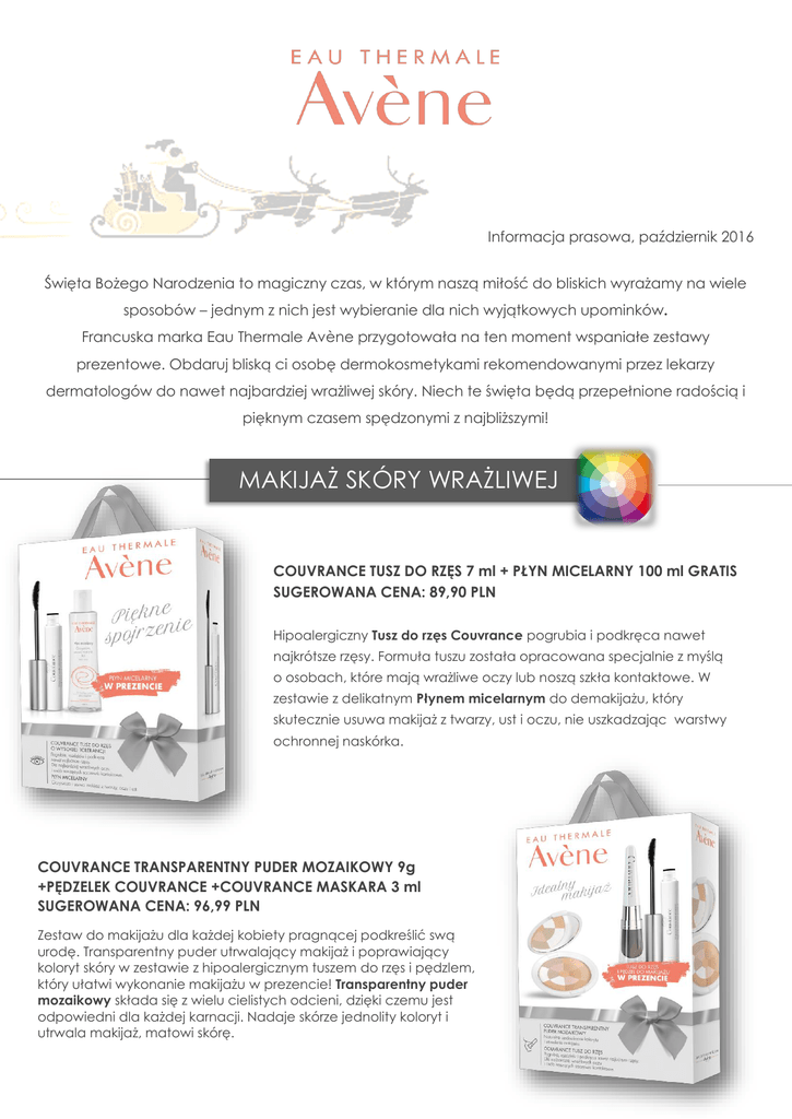 Informacja prasowa, październik 2016 Święta Bożego Narodzenia to magiczny czas, w którym naszą miłość do bliskich wyrażamy na wiele sposobów – jednym z nich jest wybieranie dla nich wyjątkowych upominków. Francuska marka Eau Thermale Avène przygotowała na ten moment wspaniałe zestawy prezentowe. Obdaruj bliską ci osobę dermokosmetykami rekomendowanymi przez lekarzy dermatologów do nawet najbardziej wrażliwej skóry. Niech te święta będą przepełnione radością i pięknym czasem spędzonymi z najbliższymi! MAKIJAŻ SKÓRY WRAŻLIWEJ COUVRANCE TUSZ DO RZĘS 7 ml + PŁYN MICELARNY 100 ml GRATIS SUGEROWANA CENA: 89,90 PLN Hipoalergiczny Tusz do rzęs Couvrance pogrubia i podkręca nawet najkrótsze rzęsy. Formuła tuszu została opracowana specjalnie z myślą o osobach, które mają wrażliwe oczy lub noszą szkła kontaktowe. W zestawie z delikatnym Płynem micelarnym do demakijażu, który skutecznie usuwa makijaż z twarzy, ust i oczu, nie uszkadzając warstwy ochronnej naskórka. COUVRANCE TRANSPARENTNY PUDER MOZAIKOWY 9g +PĘDZELEK COUVRANCE +COUVRANCE MASKARA 3 ml SUGEROWANA CENA: 96,99 PLN Zestaw do makijażu dla każdej kobiety pragnącej podkreślić swą urodę. Transparentny puder utrwalający makijaż i poprawiający koloryt skóry w zestawie z hipoalergicznym tuszem do rzęs i pędzlem, który ułatwi wykonanie makijażu w prezencie! Transparentny puder mozaikowy składa się z wielu cielistych odcieni, dzięki czemu jest odpowiedni dla każdej karnacji. Nadaje skórze jednolity koloryt i utrwala makijaż, matowi skórę.