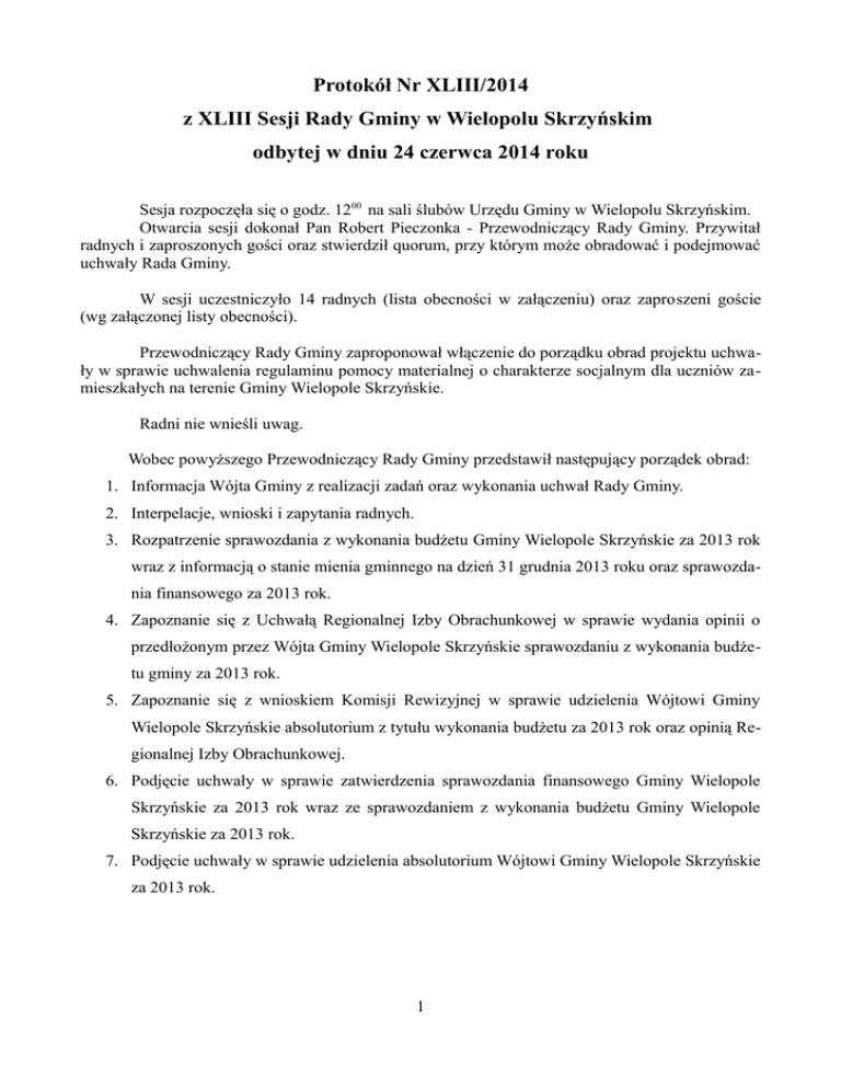Protokół Nr XLIII/2014 z XLIII Sesji Rady Gminy w Wielopolu Skrzyńskim odbytej w dniu 24 czerwca 2014 roku Sesja rozpoczęła się o godz. 1200 na sali ślubów Urzędu Gminy w Wielopolu Skrzyńskim. Otwarcia sesji dokonał Pan Robert Pieczonka - Przewodniczący Rady Gminy. Przywitał radnych i zaproszonych gości oraz stwierdził quorum, przy którym może obradować i podejmować uchwały Rada Gminy. W sesji uczestniczyło 14 radnych (lista obecności w załączeniu) oraz zaproszeni goście (wg załączonej listy obecności). Przewodniczący Rady Gminy zaproponował włączenie do porządku obrad projektu uchwały w sprawie uchwalenia regulaminu pomocy materialnej o charakterze socjalnym dla uczniów zamieszkałych na terenie Gminy Wielopole Skrzyńskie. Radni nie wnieśli uwag. Wobec powyższego Przewodniczący Rady Gminy przedstawił następujący porządek obrad: 1. Informacja Wójta Gminy z realizacji zadań oraz wykonania uchwał Rady Gminy. 2. Interpelacje, wnioski i zapytania radnych. 3. Rozpatrzenie sprawozdania z wykonania budżetu Gminy Wielopole Skrzyńskie za 2013 rok wraz z informacją o stanie mienia gminnego na dzień 31 grudnia 2013 roku oraz sprawozdania finansowego za 2013 rok. 4. Zapoznanie się z Uchwałą Regionalnej Izby Obrachunkowej w sprawie wydania opinii o przedłożonym przez Wójta Gminy Wielopole Skrzyńskie sprawozdaniu z wykonania budżetu gminy za 2013 rok. 5. Zapoznanie się z wnioskiem Komisji Rewizyjnej w sprawie udzielenia Wójtowi Gminy Wielopole Skrzyńskie absolutorium z tytułu wykonania budżetu za 2013 rok oraz opinią Regionalnej Izby Obrachunkowej. 6. Podjęcie uchwały w sprawie zatwierdzenia sprawozdania finansowego Gminy Wielopole Skrzyńskie za 2013 rok wraz ze sprawozdaniem z wykonania budżetu Gminy Wielopole Skrzyńskie za 2013 rok. 7. Podjęcie uchwały w sprawie udzielenia absolutorium Wójtowi Gminy Wielopole Skrzyńskie za 2013 rok. 1 8. Rozpatrzenie projektów i podjęcie uchwał: 1) w sprawie zmiany w podziale gminy Wielopole Skrzyńskie na okręgi wyborcze, ustalenia ich granic i numerów oraz liczby radnych wybieranych w każdym okręgu wyborczym, 2) w sprawie uchwalenia regulaminu pomocy materialnej o charakterze socjalnym dla uczniów zamieszkałych na terenie Gminy Wielopole Skrzyńskie, 3) w sprawie zmiany Uchwały Nr XLII/236/2014 Rady Gminy w Wielopolu Skrzyńskim z dnia 6 maja 2014 roku w sprawie wprowadzenia zmian budżetu gminy na 2014 rok, 4) w sprawie zmiany Uchwały Nr XL/222/2014 Rady Gminy w Wielopolu Skrzyńskim z dnia 29 stycznia 2014 roku w sprawie budżetu Gminy Wielopole Skrzyńskie na 2014 rok, 5) w sprawie wprowadzenia zmian budżetu gminy na 2014 rok. 9. Sprawy różne. 10. Przyjęcie protokołu z obrad poprzedniej sesji. 11. Zamknięcie Sesji. Radni przyjęli do realizacji zaproponowany porządek obrad. 1. Informacja Wójta Gminy z realizacji zadań oraz wykonania uchwał Rady Gminy. Pan Czesław Leja – Wójt Gminy Wielopole Skrzyńskie przedstawił informacje z realizacji zadań w okresie międzysesyjnym: • Chodnik w Wielopolu Skrzyńskim będzie budowany na odcinku długości 95 m za 66.000 zł. Zadanie to będzie wykonywał Pan Marcin Jezior. Prace rozpoczną się 15 lipca 2014 r. • Pani Dudek z Dębicy rozpoczęła składowanie kruszywa na placu u Pana Godka. Nie należy mieć obaw, że plac ten będzie sprzyjał szczególnemu traktowaniu Brzezin, bo wszystkie decyzje dotyczące miejsca wywożenia kamienia wydawane są przez nas. Każdy transport jest rejestrowany i podpisywany przez odbiorcę. Nie ma i nie było nadużyć w tym zakresie, chociaż były głosy, że kruszywo poprzednim razem było wywożone nocą, aby ukryć miejsce wywożenia. • Zostanie przygotowany wykaz dróg, gdzie obecna partia kruszywa trafi w oparciu o zgłoszenia jakie napłynęły do Urzędu Gminy. Będzie można się przyjrzeć i ewentualnie uzupełnić listę. • Inwestycje przy Szkole Podstawowej w Brzezinach i na stadionie w Wielopolu Skrzyńskim postępują zgodnie z harmonogramem. Prace w Brzezinach chcemy zakończyć w sierpniu, natomiast prace w Wielopolu Skrzyńskim we wrześniu. • Pod koniec tego tygodnia będą miały miejsce dwa wydarzenia o charakterze kulturalnym: Dni Wielopola oraz Spotkanie Integracyjne Seniorów w Broniszowie. • Dzisiaj na WTZ odbywa się Powiatowy Piknik na rozpoczęcie lata. • W ostatnią niedzielę Pan Andrzej Róg zorganizował wspólnie ze swoimi współpracownikami wycieczkę w Bieszczady. • Jesteśmy w trakcie remontów dróg. W tej chwili wykonujemy prace głównie na terenie Glinika i będziemy przechodzić po kolei do następnych miejscowości. Wykonujemy prace najpotrzebniejsze i najpilniejsze, bo środków na takie działanie jest niewiele. 2 Pan Czesław Leja – Wójt Gminy zwrócił uwagę, że dzisiejsza sesja ma na celu przyglądnięcie się co wydarzyło się w ubiegłym roku, jak realizowany był budżet i jakie są efekty wspólnego działania. Wszystkie czynności zostały wypunktowane i ocenione przez Komisję Rewizyjną i RIO. Efekty tych czynności będą zaprezentowane i w oparciu o nie radni będą mogli podjąć decyzję co do udzielenia absolutorium Wójtowi, co za tym idzie całemu Urzędowi Gminy. Pytania i uwagi. Pan Jan Bokota – radny, sołtys sołectwa Glinik złożył podziękowania za pamięć i życzenia imieninowe. Zapytał o rozpoczęcie prac przy budowie hali sportowej w Gliniku. Poprosił, aby radni otrzymali informację odnośnie kamienia, na jaką drogę zostanie przeznaczony. Ponadto poprosił o przeprowadzenie remontu mostu w Gliniku koło GS. • • • Pan Czesław Leja – Wójt Gminy udzielił informacji na zadane pytania. Na obecnym etapie prac przy budowie hali sportowej w Gliniku są do wykonania następujące czynności: należy przeprojektować fragment umocnień, po to aby obniżyć koszty, zmienić kosztorys, ogłosić przetarg i podpisać umowę z wykonawcą. Trzeba wywieźć zbędny grunt i wykonać umocnienie pl