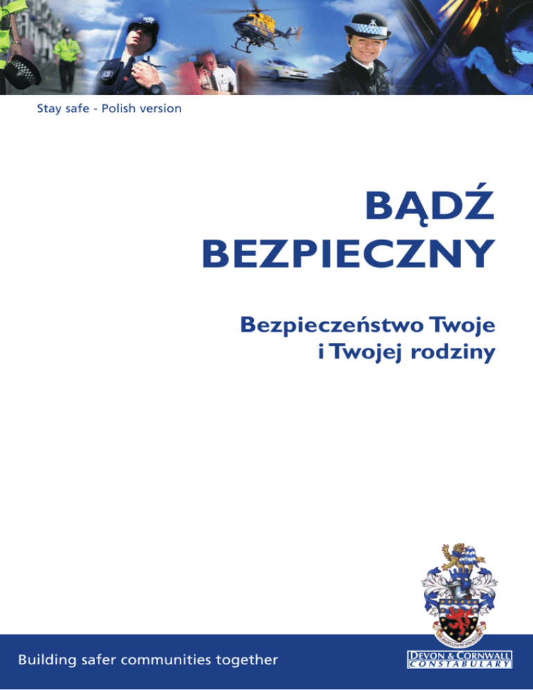 Stay safe - Polish version BĄDŹ BEZPIECZNY Bezpieczeństwo Twoje i Twojej rodziny Building safer communities together BEZPIECZNE MIESZKANIE Wszyscy chcemy czuć się bezpiecznie we własnym domu. Oto kilka prostych, praktycznych wskazówek, które zagwarantują Ci poczucie bezpieczeństwa. Sprawdź drzwi i zamki Drzwi należy wyposażyć w dobre zamki. Mocuje się je zazwyczaj na wysokości jednej trzeciej od szczytu drzwi oraz na wysokości jednej trzeciej od dołu. Aby zapewnić maksymalne zabezpieczenie zawsze zamykaj drzwi na oba zamki. Zainstaluj w drzwiach łańcuch i wizjer. Korzystaj z nich, zanim otworzysz drzwi, aby upewnić się, kto za nimi stoi. Zabezpiecz okna przy użyciu zapadek Włamywacze często dostają się do domu przez otwarte okna.Wychodząc z domu nie zapominaj o zamknięciu wszystkich okien. Można także zainstalować specjalne blokady i zapadki, aby uniemożliwić włamywaczom zbicie szyby i otworzenie okna od środka. Okna mieszkań w blokach są wyposażone w zapadki zabezpieczające. Zapadki można zwolnić, aby umyć okna, ale należy je zawsze z powrotem zamocować. Porady w tej sprawie można uzyskać w lokalnym wydziale mieszkaniowym. Dbaj o dobry stan budynku W trosce o bezpieczeństwo mieszkańców należy zgłaszać wszystkie przypadki uszkodzonych lub rozbitych lamp i dopilnowywać, aby zostały naprawione. Informuj dozorcę o uszkodzonym mieniu lub zauważonych przypadkach wandalizmu po to, aby można było zawiadomić policję i nie dopuścić do nasilenia się problemu. Zawsze zamykaj drzwi pożarowe Drzwi pożarowe uniemożliwiają rozprzestrzenianie się ognia i powinny być przez cały czas zamknięte.W blokach mieszkalnych z tylnych drzwi pożarowych wolno korzystać wyłącznie w nagłych wypadkach. Drzwi pożarowe uniemożliwiają także osobom niepowołanym wejście do budynku bez wiedzy dozorcy. Korzystaj z domofonu w bezpieczny sposób Mieszkania w blokach są często wyposażone w domofony w celu uniemożliwienia wstępu do budynku osobom niepowołanym. • Zawsze żądaj okazania dowodu tożsamości od nieznajomych osób, zanim wpuścisz je do mieszkania.W razie wątpliwości nie wpuszczaj ich do domu. • Nie wpuszczaj osób dzwoniących na Twój domofon, jeżeli nie przychodzą do Ciebie, nawet jeżeli powiedzą, do kogo idą. Powiedz, aby zadzwoniły do mieszkania, które chcą odwiedzić. • Wchodząc i wychodząc z budynku zawsze zamykaj za sobą drzwi, aby uniemożliwić wstęp osobom niepowołanym. • Jeżeli nie masz telefonu, a chcesz wezwać policję, skontaktuj się z sąsiadem, który zadzwoni pod numer 999. • W nagłych wypadkach spróbuj wezwać pomoc naciskając przycisk alarmowy w windzie. JAK CHRONIĆ SWOJĄ RODZINĘ Przypadki brutalnych napaści są na szczęście rzadkie.Warto jednak pamiętać o kilku podstawowych zasadach, które zapewnią Tobie i Twojej rodzinie bezpieczeństwo w domu i na ulicy. W domu Zadbaj o odpowiednie zabezpieczenia mieszkania. Zawsze zamykaj drzwi i okna. Jeżeli po powrocie do domu zaobserwujesz ślady włamania - nie wchodź do środka, ponieważ włamywacz możne nadal tam przebywać. Natychmiast wezwij policję. Czekaj na przybycie policji przed budynkiem. Jeśli w Twoim bloku jest dozorca lub pracownik ochrony poproś go aby wezwał policję. Bezpieczeństwo poza domem • Bądź czujny i zwracaj uwagę na to, co się wokół ciebie dzieje. • Nigdy nie chodź na skróty nieoświetlonymi bocznymi uliczkami lub przez odludne okolice. • Idąc zawsze bądź zwrócony przodem w kierunku ruchu ulicznego, aby nie mógł niespodziewanie zatrzymać się za tobą żaden samochód. • Jeżeli zatrzyma się koło ciebie podejrzany samochód, krzycz wzywając pomocy i uciekaj w przeciwnym kierunku. • Nie akceptuj propozycji podwiezienia ze strony nieznajomych osób; nie korzystaj z „okazji”. • Pozakrywaj kosztowną biżuterię. • Torebkę trzymaj przy sobie, tak aby zamknięcie było blisko ciała – jeżeli ktoś ją schwyci, puść ją, gdyż w przeciwnym razie możesz doznać obrażeń. Klucze do mieszkania trzymaj w kieszeni. • Jeżeli wydaje ci się, że ktoś za tobą idzie, przejdź dla pewności na drugą stronę ulicy. Jeżeli rzeczywiście ktoś za tobą idzie pobiegnij do najbliższego miejsca, w którym przebywają inni ludzie i wezwij policję. Jak mężczyźni mogą pomóc kobietom Mężczyźni mogą czasem w sposób nieświadomy i niezamierzony wzbudzić niepokój kobiet. Kobiety mogą czuć się niepewnie, gdy znajdą się gdzieś same, szczególnie po zmierzchu, w odludnym miejscu lub w zamkniętej przestrzeni (np. w autobusie czy pociągu).W takich sytuacjach mężczyźni powinni postępować w następujący sposób: • idąc w tym samym kierunku co kobieta, nie idź za nią, żeby jej nie przestraszyć; przejdź na drugą stronę ulicy, aby ją uspokoić; • nie zagaduj kobiety czekającej na autobus na odludnym przystanku; ona nie wie, jakie są Twoje intencje; • pamiętaj, że kobieta może czuć się zagrożona nawet przez sposób, w jaki na nią spoglądasz, gdy wydaje Ci się atrakcyjna. Mężczyźni powinni odprowadzać znajome kobiety do domu. Przed rozstaniem mężczyzna powinien zaczekać, aż kobieta znajdzie się w środku. Jak postępować w razie napadu Zastanów się nad tym, jak byś postąpił(a) w razie napadu. Możesz próbować się bronić lub iść na rękę napastnikom i czekać na okazję do ucieczki. Gdy ktoś Cię atakuje krzycz, wzywając pomocy. Jeżeli padniesz ofiarą napadu lub napaści seksualnej natychmiast wezwij policję. Bardzo często sprawcą jest osoba znana ofierze. Napaść stanowi bardzo poważne przestępstwo niezależnie od tego, czy sprawca znany był ofierze. Po napaści staraj się nie myć ani nie kąpać, dopóki lekarz policyjny nie dokona obdukcji. Jeżeli się umyjesz, zniszczysz istotne materiały dowodowe. Jeżeli sprawcą przemocy jest członek rodziny, sąd może udzielić ofierze pomocy, nawet je