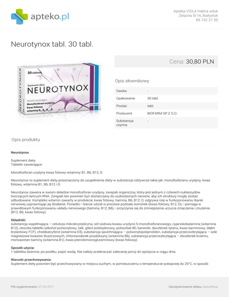 Apteka VIOLA Halina wiluk Żelazna 9/14, Białystok 85 742 27 35 Neurotynox tabl. 30 tabl. Cena: 30,80 PLN Opis słownikowy Dawka - Opakowanie 30 tabl. Postać tabl. Producent BIOFARM SP.Z O.O. Substancja czynna - Opis produktu Neurotynox Suplement diety Tabletki zawierające: Monofosforan urydyny kwas foliowy witaminy B1, B6, B12, D Neurotynox to suplement diety przeznaczony do uzupełnienia diety w substancje odżywcze takie jak: monofosforanu urydyny, kwas foliowy, witamina B1, B6, B12 i D. Neurotynox zawiera w swoim składzie monofosforan urydyny, związek organiczny, który jest jednym z czterech nukleozydów tworzących łańcuch RNA. Związek ten powinien być dostarczany do uszkodzonych nerwów, aby ich struktury mogły zostać odbudowane. Kompleks witamin zawarty w produkcie, kwas foliowy, tiamina, B6, B12, D, odgrywa rolę w funkcjonowaniu tkanki nerwowej usprawniając jej działanie. Ponadto:—bierze udział w procesie podziału komórek (kwas foliowy, B12, D),—pomaga w prawidłowym funkcjonowaniu układu nerwowego (tiamina, B12, B6),—przyczynia się do zmniejszenia uczucia zmęczenia i znużenia (B12, B6, kwas foliowy). Składniki: substancja wypełniająca – celuloza mikrokrystaliczna, sól sodowa kwasu urydyno 5-monofosforanowego, cyjanokobalamina (witamina B12), otoczka tabletki (alkohol poliwinylowy, talk, glikol polietylenowy, polisorbat 80, barwniki: dwutlenek tytanu, kwas karminowy, błękit brylantowy FCF), cholekalcyferol (witamina D3), substancja spulchniająca – poliwinylopolipirolidon, substancja przeciwzbrylająca – sole magnezowe kwasów tłuszczowych, chlorowodorek pirydoksyny (witamina B6), substancja przeciwzbrylająca – dwutlenek krzemu, monoazotan tiaminy (witamina B1), kwas pteroilomonoglutaminowy (kwas foliowy). Sposób użycia: 1 tabletka dziennie, po posiłku, popić wodą. Nie należy przekraczać zalecanej porcji do spożycia w ciągu dnia. Warunki przechowywania: Suplement diety powinien być przechowywany w miejscu suchym, w pomieszczeniu o temperaturze pokojowej do 25°C, w sposób Plik wygenerowano: 07-03-2017 Oprogramowanie sklepu: AptusShop Apteka VIOLA Halina wiluk Żelazna 9/14, Białystok 85 742 27 35 niedostępny dla małych dzieci. Liczba sztuk: 30 tabletek Zawartość netto: 9,6 g Nr partii: Najlepiej spożyć przed końcem: Data minimalnej trwałości podana na boku opakowania. Kobiety w ciąży oraz karmiące piersią przed zastosowaniem powinny skonsultować się z lekarzem. Suplement diety nie może być przyjmowany przez osoby uczulone na składniki tabletki, dzieci oraz chorych z niedokrwistością Addisona – Biermera. Suplement diety nie może być stosowany jako substytut zróżnicowanej diety. Należy prowadzić zdrowy tryb życia i stosować zróżnicowaną dietę dostarczającą organizmowi wystarczającej ilości składników odżywczych. Korzystne działanie produktu występuje przy spożyciu 1 tabletki dziennie. Plik wygenerowano: 07-03-2017 Powered by TCPDF (www.tcpdf.org) Oprogramowanie sklepu: AptusShop