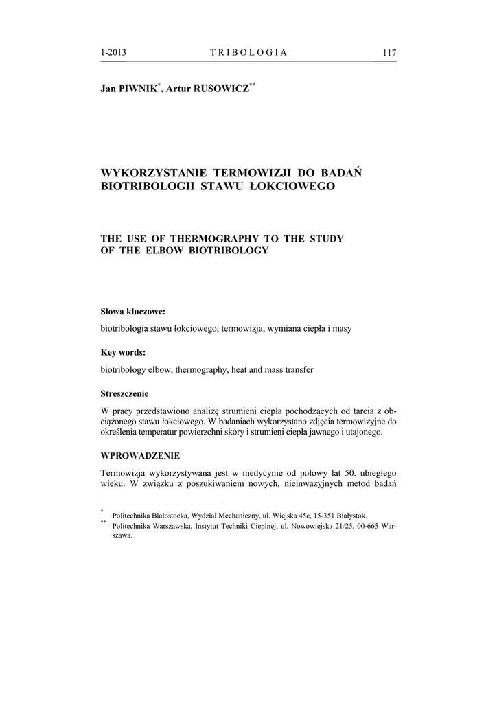 1-2013 TRIBOLOGIA 117 Jan PIWNIK*, Artur RUSOWICZ** WYKORZYSTANIE TERMOWIZJI DO BADAŃ BIOTRIBOLOGII STAWU ŁOKCIOWEGO THE USE OF THERMOGRAPHY TO THE STUDY OF THE ELBOW BIOTRIBOLOGY Słowa kluczowe: biotribologia stawu łokciowego, termowizja, wymiana ciepła i masy Key words: biotribology elbow, thermography, heat and mass transfer Streszczenie W pracy przedstawiono analizę strumieni ciepła pochodzących od tarcia z obciążonego stawu łokciowego. W badaniach wykorzystano zdjęcia termowizyjne do określenia temperatur powierzchni skóry i strumieni ciepła jawnego i utajonego. WPROWADZENIE Termowizja wykorzystywana jest w medycynie od połowy lat 50. ubiegłego wieku. W związku z poszukiwaniem nowych, nieinwazyjnych metod badań * ** Politechnika Białostocka, Wydział Mechaniczny, ul. Wiejska 45c, 15-351 Białystok. Politechnika Warszawska, Instytut Techniki Cieplnej, ul. Nowowiejska 21/25, 00-665 Warszawa. 118 TRIBOLOGIA 1-2013 medycznych rozwija się cały czas [L. 13]. Początkowo skupiano się na fizjologicznych zmianach pochodzących m.in. od złamań, oparzeń, nowotworów, chłoniaków, czerniaków, raka prostaty, raka piersi, zapaleń dermatologicznych skóry, reumatologicznych zapaleń stawów, cukrzycy i związanych z nimi patologii, zakrzepicy żył głębokich, chorób wątroby, zakażeń bakteryjnych itp. [L. 9, 12]. Warunki te są często związane z lokalnym rozszerzenie naczyń krwionośnych, hipertermią, hyperperfuzją, hypermetabolizmem i hyperunaczynieniem, w których źródła ciepła generują wyższe temperatury [L. 1, 6]. Obecnie coraz szersze zastosowania pojawiają się przy analizie pracy poszczególnych elementów ciała, badane na potrzeby biotechnologii wykorzystywanych w rehabilitacji i sporcie [L. 14]. Stąd potrzeba analizy obciążeń występujących w badanych strukturach, tarcie, jakie się pojawia w stawach, a w konsekwencji lokalnie jest wydzielane ciepło. Przy obciążeniu w wyniku tarcia energia mechaniczna zamieniana jest na ciepło [L. 8]. W połączeniu elementów kostnych ciała człowieka wyróżnia się trzy podstawowe struktury: włókniste, chrzęstne oraz maziowe (synowialne) [L. 4]. Stawy typu maziowego umożliwiają realizację relatywnie dużych wzajemnych ruchów poszczególnych kości. W pracy skupiono się na stawie łokciowym, który jest stawem złożonym typy maziowego, zaprezentowanym na Rys. 1. Składa się on z trzech stawów anatomicznie złączonych z sobą i objętych wspólną torebka stawową. Stawy te to ramiennopromieniowy, ramienno-łokciowy i promieniowo-łokciowy bliższy. Staw ramienno-łokciowy jest stawem zawiasowym, ramienno-promieniowy jest to staw kulisty, obydwa te narządy ruchu współpracują ze sobą wykonując zginanie i prostowanie ręki w stawie łokciowym. Staw promieniowo-łokciowy bliższy jest stawem obrotowym, czynnościowo niezależnym od poprzednich. Staw ten wspólnie ze stawem promieniowo-łokciowym dalszym oddalonym o długość kości przedramienia, umożliwia ruchy nawracania i odwracania przedramienia wraz z ręką [L. 7]. BADANIA TERMOWIZYJNE Badaniu poddany został staw łokciowy u dorosłego, zdrowego mężczyzny w wieku 25 lat, wadze 98 kg i wzroście 184 cm. Głównym celem badań jest ustalenie wpływu zmian obciążeń na rozkład temperatury powierzchniowej stawu [L. 3]. Proces jego nagrzewania się zależy przede wszystkim od rodzaju i intensywności ćwiczeń. W celu wywołania zmian temperatury badany obiekt wykonywał ćwiczenia fizyczne – leżenie przodem, ręce oparte obok klatki piersiowej, a następnie uniesienie prostego tułowia, tzw. pompki. Po każdej serii obciążeń wykonywane były zdjęcia termowizyjne stawu z trzech stron: z przodu, boku oraz tyłu. Pierwszą serię zdjęć stawu zarejestrowano bez obciążenia, a następne po kolejnych etapach cyklu rozgrzewającego. Kamera ustawiona była w odległości około metra od obiektu, na tym samym poziomie. 1-2013 TRIBOLOGIA 119 Rys. 1. Elementy kostne tworzące staw łokciowy i strumienie ciepła analizowane w bilansie Fig. 1. Bones elements forming the elbow joint and heat fluxes analyzed in the balance Badanie polegało na rejestracji rozkładu pól temperatury na powierzchni stawu łokciowego z wykorzystaniem kamery termowizyjnej firmy FLIR ThermaCam P10. Czułość kamery termowizyjnej używanej podczas badań wynosiła 0,08 K. Oznacza to, że można rozróżnić punkty na ciele różniące się temperaturą o 0,08 K. Niestety nie wyraża się to dokładnością pomiaru, który osiąga 2% przy zakresie pomiarowym -10 ÷ +55°C. Kamera ThermaCAM P10 jest urządzeniem najnowszej generacji posiadającym wieloelementowe detektory podczerwieni, dzięki którym wyeliminowany został skomplikowany mechaniczno-optyczny zespół przeszukiwania obrazu. W matrycy tej kamery (320 × 240) jest 76800 pojedynczych detektorów (pikseli). Każdy piksel może być odczytywany 50 razy na sekundę przez układ odczytowy. Zakres widmowy promieniowania podczerwonego wynosi 7,5–13 µm (tzw. termowizja długofalowa) [L. 15]. Badania prowadzono w pomieszczeniu o temperaturze otoczenia 18°C i wilgotności względnej 50%. Na Rys. 2 zaprezentowano termogram stawu łokciowego przed wykonywaniem ćwiczeń, bez obciążenia. W celu lepszego zobrazowania zmian temperatury na termogramach zaznaczono charakterystyczne punkty P1, P2, P3, względem których określano temperaturę. Wynosiła ona w odpowiednio w punktach P1= 33,7°C, P2 = 33,4°C, P3 = 33,8°C. Następnie zaprezentowano na Rys. 3 termogram przedstawiający przednią stronę stawu łokciowego po wykonaniu 120 „pompek”. W analogicznych punktach P1, P2 i P3 zarejestrowano temperatury 36,9°C, 36,7°C i 36,7°C. Wzrost temperatury wystąpił w punktach P1, P2, P3 o 3,2°C, 3,3°C i 2,9°C. 120 TRIBOLOGIA Rys. 2. Termogram – widok części przedniej stawu, bez obciążeń Fig. 2. Thermogram – a view of the front of the pond, without the load Rys. 3. Termogram – widok 