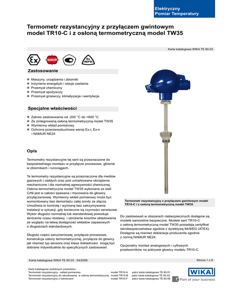 Elektryczny Pomiar Temperatury Termometr rezystancyjny z przyłączem gwintowym model TR10-C i z osłoną termometryczną model TW35 Karta katalogowa WIKA TE 60.03 Zastosowanie Maszyny, urządzenia i zbiorniki Inżynieria energetyki i stacje zasilania Przemysł chemiczny Przemysł spożywczy Przemysł grzewczy, klimatyzacja i wentylacja Specjalne właściwości Zakres zastosowania od -200 °C do +600 °C Ze zintegrowaną osłoną termometryczną model TW35 Wymienny wkład pomiarowy Ochrona przeciwwybuchowa wersji Ex-i, Ex-n i NAMUR NE24 Opis Termometry rezystancyjne tej serii są przeznaczone do bezpośredniego montażu w przyłącze procesowe, głównie w zbiornikach i rurociągach. Te termometry rezystancyjne są przeznaczone dla mediów gazowych i ciekłych oraz pod umiarkowane obciążenia mechaniczne i dla normalnej agresywności chemicznej. Osłona termometryczna model TW35 wykonana ze stali CrNi jest w całości spawana i mocowana do głowicy przyłączeniowej. Wymienny wkład pomiarowy może być Termometr rezystancyjny z przyłączem gwintowym model wymontowany bez demontażu całej sondy ze złącza. TR10-C i z osłoną termometryczną model TW35 Umożliwia to kontrolę i wymianę bez zatrzymywania instalacji w sytuacji, gdy konieczne są czynności serwisowe. Wybór długości normalnej lub standardowej powoduje Do zastosowań w obszarach niebezpiecznych dostępne są skrócenie czasu dostawy i obniżenie kosztów składowania modele samoistnie bezpieczne. Modele serii TR10-C ze względu na łatwą dostępność wkładów zapasowych z osłoną termometryczną model TW35 posiadają certyfikat o długościach standardowych. iskrobezpieczeństwa zgodnie z dyrektywą 94/9/EG (ATEX). Dostępne są również deklaracje producenta zgodnie Długość części zanurzeniowej, przyłącze procesowe, z normą NAMUR NE24. konstrukcja osłony termometrycznej, przyłącze do głowicy jak również typ sensora oraz klasa dokładności mogą być Opcjonalny montaż analogowych i cyfrowych dobrane indywidualnie do specyficznych zastosowań. przetworników na pokrywie głowicy modelu TR10-C. Strona 1 z 6 Karta katalogowa WIKA TE 60.03 · 04/2008 Karty katalogowe podobnych produktów: Termometr rezystancyjny - wkład pomiarowy model TR10-A Termometr rezystancyjny do wbudowania w osłonę termometryczną model TR10-B Termometr rezystancyjny z kołnierzem model TR10-F patrz karta katalogowa TE 60.01 patrz karta katalogowa TE 60.02 patrz karta katalogowa TE 60.06 Sensor Sensor znajduję się w wymmiennym wkładzie pomiarowym który jest utrzymywany przez sprężynę. Sposób przyłączenie sensora 2 - przewodowy: błąd w rezystancji przewodu 3 - przewodowy: w przypadku kabli o długości ok. 30 m lub więcej mogą wystąpić błędy pomiaru 4 - przewodowy: wewnętrzna rezystancja kabla podłączonych przwodów jest nieistotna Błąd graniczny sensora Klasa B wg DIN EN 60 751 Klasa A wg DIN EN 60 751 (-50 °C ... +450 °C) A DIN B w 0 °C Temperatura Podstawowa Błąd graniczny DIN EN 60 751 (ITS 90) wartość Klasa A Klasa B °C Ω °C Ω °C Ω -200 -100 -50 0 50 100 200 300 400 500 600 18,52 60,26 80,31 100 119,40 138,51 175,86 212,05 247,09 280,98 313,71 ± 0,55 ± 0,35 ± 0,25 ± 0,15 ± 0,25 ± 0,35 ± 0,55 ± 0,75 ± 0,95 ± 1,15 ± 1,35 ± 0,24 ± 0,14 ± 0,10 ± 0,06 ± 0,10 ± 0,13 ± 0,2 ± 0,27 ± 0,33 ± 0,38 ± 0,43 ± 1,3 ± 0,8 ± 0,55 ± 0,3 ± 0,55 ± 0,8 ± 1,3 ± 1,8 ± 2,3 ± 2,8 ± 3,3 ± 0,56 ± 0,32 ± 0,22 ± 0,12 ± 0,21 ± 0,30 ± 0,48 ± 0,64 ± 0,79 ± 0,93 ± 1,06 1,75 °C Ω w B a as Kl B A lasa K 1,0 A B 0,15 + 0,002 0,3 + 0,005 0 Klasa wΩ C w° AwΩ 1,0 Błąd w Ω sa Kla 1,5 0,5 |t| |t| 1,25 2,0 Błąd graniczny w °C 1,5 2,5 Klasa °C 3,5 3,0 Błąd w °C Podstawowe wartości i błędy graniczne Podstawowe wartości i błędy graniczne platynowych rezystorów pomiarowych przedstawione są w DIN EN 60 751. Wartość nominalna czujników Pt 100 wynosi 100 Ω przy 0°C. Współczynnik temperatury α można prosto określić jako znajdujący się w zakresie od 0oC do 100oC przy: α = 3.85 10-3 °C-1 Zależność między temperaturą i opornością elektryczną opisana jest za pomocą wielomianów przedstawionych w DIN EN 60 751. Ponadto, norma ta przedstawia podstawowe wartości w krokach °C. 3163 008.01 Kombinacja 2 - przewodowa nie ma sensu w klasie A i A DIN B ponieważ rezystancja przewodu czujnika mieści się poza skalą dokładności sensora. 0,75 0,5 0,25 1) 1) I t I oznacza wartość temperatury w °C bez uwzględnienia znaku -200 -100 0 100 200 300 400 0 500 °C 600 Temperatura w °C Części TR10-C 3175431.01 Gwinty cylindryczne i stożkowe patrz strona 4. Legenda: Główka przyłączeniowa Szyjka przedłużeniowa Przyłącz procesowe Wkład pomiarowy Przetwornik (opcjonalnie) Osłona termometryczna TW35 NL Długość nominalna l5 Długość wkładu wymiennego U1 Długość zanurzeniowa F1 Ø osłony termometrycznej MH Długość szyjki M Długość przedłużeniowa szyjki Strona 2 z 6 Karta katalogowa WIKA TE 60.03 · 04/2008 Główki przyłączeniowe BS BSZ BSZ-K Typ Materiał BS BSZ BSZ-K BSZ-H BSZ-HK BSS BSS-H BVA aluminium aluminium plastik aluminium plastik aluminium aluminium stal CrNi BSZ-H BSZ-HK Wejście kabla Stopień ochrony obudowy M 20 x 1,5 1) M 20 x 1,5 1) M 20 x 1,5 1) M 20 x 1,5 1) M 20 x 1,5 1) M 20 x 1,5 1) M 20 x 1,5 1) M 20 x 1,5 1) IP65 IP65 IP65 IP65 IP65 IP65 IP65 IP65 BSS BSS-H BVA Pokrywa Wykończenie powierzchni pokrywa z dwoma wkrętami pokrywa uchylna ze śrubą pokrywa uchylna ze śrubą pokrywa uchylna ze śrubą pokrywa uchylna ze śrubą pokrywa uchylna z zatrzaskiem pokrywa uchylna z zatrzaskiem pokrywa przykręcana niebieskie, malowane2) niebieskie, malowane2) czarne niebieskie, malowane2) czarne niebieskie, malowane2) niebieskie, malowane2) naturalne 1) Standard 2) RAL5022 Główka przyłączeniowa z cyfrowym wyświetlaczem (opcjonalnie) Ten termometr może być opcjonalnie stosowany z cyfrowym wyświetlaczem DIH 10. Za