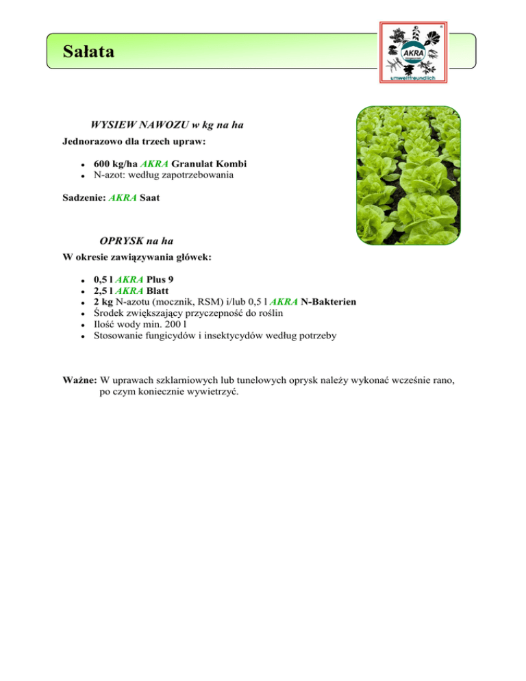 Sałata WYSIEW NAWOZU w kg na ha Jednorazowo dla trzech upraw: 600 kg/ha AKRA Granulat Kombi N-azot: według zapotrzebowania Sadzenie: AKRA Saat OPRYSK na ha W okresie zawiązywania główek: 0,5 l AKRA Plus 9 2,5 l AKRA Blatt 2 kg N-azotu (mocznik, RSM) i/lub 0,5 l AKRA N-Bakterien Środek zwiększający przyczepność do roślin Ilość wody min. 200 l Stosowanie fungicydów i insektycydów według potrzeby Ważne: W uprawach szklarniowych lub tunelowych oprysk należy wykonać wcześnie rano, po czym koniecznie wywietrzyć.