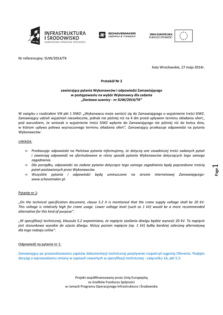 Nr referencyjny: SUW/2014/TK Katy Wrocławskie, 27 maja 2014r. Protokół Nr 2 zawierający pytania Wykonawców i odpowiedzi Zamawiającego w postępowaniu na wybór Wykonawcy dla zadania „Dostawa suwnicy - nr SUW/2014/TK” W związku z rozdziałem VIII pkt 1 SIWZ- „Wykonawca może zwrócić się do Zamawiającego o wyjaśnienie treści SIWZ. Zamawiający udzieli wyjaśnień niezwłocznie, jednak nie później niż na 4 dni przed upływem terminu składania ofert., pod warunkiem, że wniosek o wyjaśnienie treści SIWZ wpłynie do Zamawiającego nie później niż do końca dnia, w którym upływa połowa wyznaczonego terminu składania ofert”, Zamawiający przekazuje odpowiedzi na pytania Wykonawców: • • Przekazując odpowiedzi na Państwa pytania informujemy, że dotyczą one zasadniczej treści zadanych pytań i zawierają odpowiedź na sformułowane w różny sposób pytania Wykonawców dotyczących tego samego zagadnienia. Dla porządku, odpowiedzi na zadane pytania dotyczące tego samego zagadnienia będą poprzedzone treścią pytań postawionych przez Wykonawców. Wszystkie pytania i odpowiedzi będą umieszczone na stronie internetowej Zamawiającegowww.schavemaker.pl. Pytanie nr 1: „On the technical specification document, clause 5.2 it is mentioned that the crane supply voltage shall be 20 kV. This voltage is relatively high for crane usage. Lower voltage level (such as 1 kV) would be a more recommended alternative for this kind of purpose”. „W specyfikacji technicznej, klauzula 5.2 wspomniano, że napięcie zasilania dźwigu będzie wynosić 20 kV. To napięcie jest stosunkowo wysokie do użycia dźwigu. Niższy poziom napięcia (np. 1 kV) byłby bardziej zalecaną alternatywą dla tego rodzaju celów”. Odpowiedź na pytanie nr 1: Zamawiający po przeanalizowaniu zapisów dokumentacji technicznej pozytywnie rozpatrzył sugestię Oferenta. Podjęto decyzję o wprowadzeniu zmiany w zapisach zawartych w specyfikacji technicznej - załączniku 1A, pkt 5.2: Projekt współfinansowany przez Unię Europejską ze środków Funduszu Spójności w ramach Programu Operacyjnego Infrastruktura i Środowisko Page • 1 UWAGA: ZAPIS PRZED ZMIANĄ: Main Power Equipment The crane shall be powered by electrical supply through a cable reel assembly. The scope of supply shall include the cable reel assembly complete with the cable. Ground equipment such as cableways or electrical connection boxes are in the contractor’s scope of supply. The crane shall allow +/-5% of voltage fluctuation of the power supply. Re-generation of power shall take place when the load is lowered, supplying power back to the network. Supply Voltage: 20 kV Supply cable length: Operational length 350meters The cable reel shall have an elevated location to prevent ground level collisions. There shall be an automatic shutdown from over-tension and slack of the supply cable. The supply cable shall be a flexible power cable. ZAPIS PO ZMIANIE: Main Power Equipment The crane shall be powered by electrical supply through a cable reel assembly. The scope of supply shall include the cable reel assembly complete with the cable. Ground equipment such as cableways or electrical connection boxes are in the contractor’s scope of supply. Projekt współfinansowany przez Unię Europejską ze środków Funduszu Spójności w ramach Programu Operacyjnego Infrastruktura i Środowisko Page Supply Voltage: 1 kV Supply cable length: Operational length 350meters The cable reel shall have an elevated location to prevent ground level collisions. There shall be an automatic shutdown from over-tension and slack of the supply cable. The supply cable shall be a flexible power cable. 2 The crane shall allow +/-5% of voltage fluctuation of the power supply. Re-generation of power shall take place when the load is lowered, supplying power back to the network.