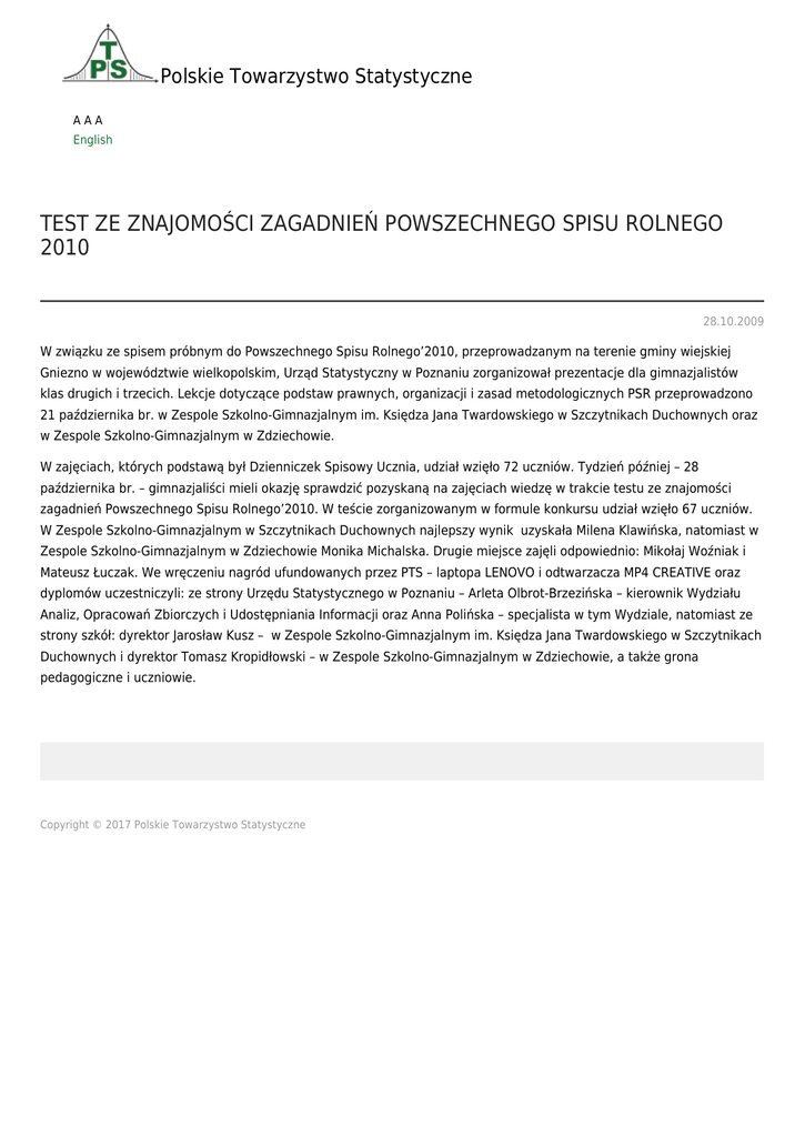 Polskie Towarzystwo Statystyczne AAA English TEST ZE ZNAJOMOŚCI ZAGADNIEŃ POWSZECHNEGO SPISU ROLNEGO 2010 28.10.2009 W związku ze spisem próbnym do Powszechnego Spisu Rolnego’2010, przeprowadzanym na terenie gminy wiejskiej Gniezno w województwie wielkopolskim, Urząd Statystyczny w Poznaniu zorganizował prezentacje dla gimnazjalistów klas drugich i trzecich. Lekcje dotyczące podstaw prawnych, organizacji i zasad metodologicznych PSR przeprowadzono 21 października br. w Zespole Szkolno-Gimnazjalnym im. Księdza Jana Twardowskiego w Szczytnikach Duchownych oraz w Zespole Szkolno-Gimnazjalnym w Zdziechowie. W zajęciach, których podstawą był Dzienniczek Spisowy Ucznia, udział wzięło 72 uczniów. Tydzień później – 28 października br. – gimnazjaliści mieli okazję sprawdzić pozyskaną na zajęciach wiedzę w trakcie testu ze znajomości zagadnień Powszechnego Spisu Rolnego’2010. W teście zorganizowanym w formule konkursu udział wzięło 67 uczniów. W Zespole Szkolno-Gimnazjalnym w Szczytnikach Duchownych najlepszy wynik uzyskała Milena Klawińska, natomiast w Zespole Szkolno-Gimnazjalnym w Zdziechowie Monika Michalska. Drugie miejsce zajęli odpowiednio: Mikołaj Woźniak i Mateusz Łuczak. We wręczeniu nagród ufundowanych przez PTS – laptopa LENOVO i odtwarzacza MP4 CREATIVE oraz dyplomów uczestniczyli: ze strony Urzędu Statystycznego w Poznaniu – Arleta Olbrot-Brzezińska – kierownik Wydziału Analiz, Opracowań Zbiorczych i Udostępniania Informacji oraz Anna Polińska – specjalista w tym Wydziale, natomiast ze strony szkół: dyrektor Jarosław Kusz – w Zespole Szkolno-Gimnazjalnym im. Księdza Jana Twardowskiego w Szczytnikach Duchownych i dyrektor Tomasz Kropidłowski – w Zespole Szkolno-Gimnazjalnym w Zdziechowie, a także grona pedagogiczne i uczniowie. Do góry Copyright © 2017 Polskie Towarzystwo Statystyczne