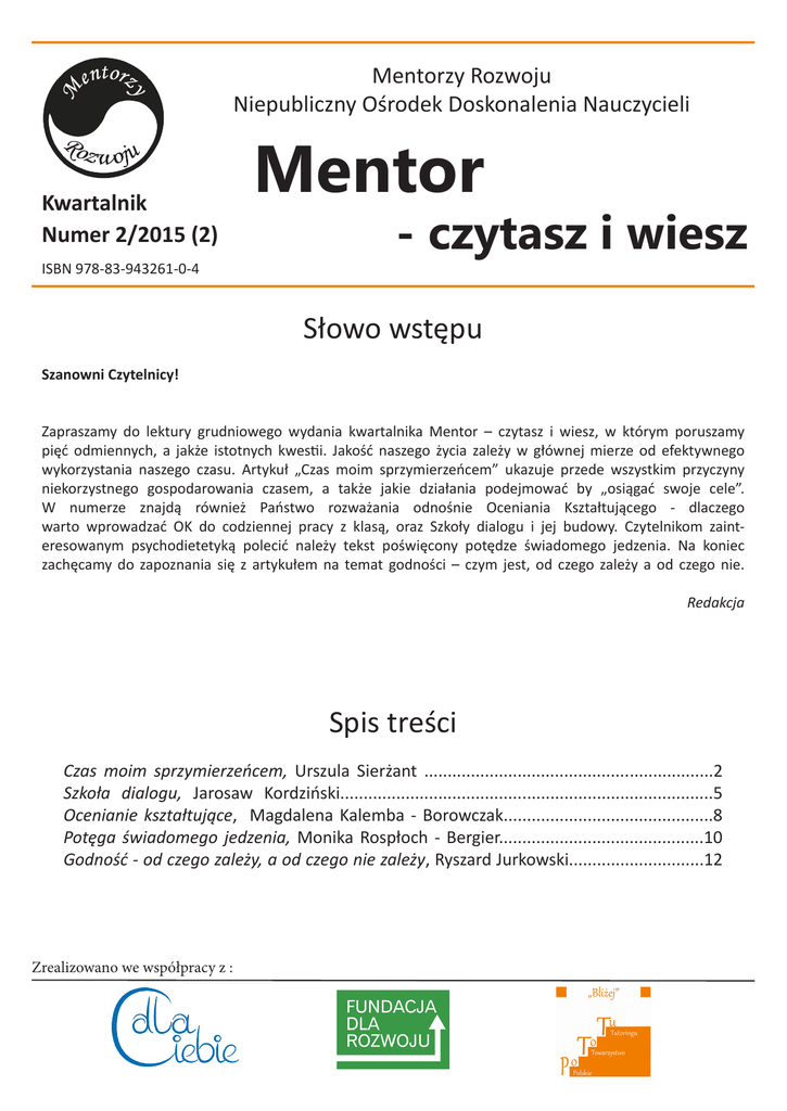Mentorzy Rozwoju Niepubliczny Ośrodek Doskonalenia Nauczycieli Mentor Kwartalnik Numer 2/2015 (2) ISBN 978-83-943261-0-4 - czytasz i wiesz Słowo wstępu Szanowni Czytelnicy! Zapraszamy do lektury grudniowego wydania kwartalnika Mentor – czytasz i wiesz, w którym poruszamy pięć odmiennych, a jakże istotnych kwestii. Jakość naszego życia zależy w głównej mierze od efektywnego wykorzystania naszego czasu. Artykuł „Czas moim sprzymierzeńcem” ukazuje przede wszystkim przyczyny niekorzystnego gospodarowania czasem, a także jakie działania podejmować by „osiągać swoje cele”. W numerze znajdą również Państwo rozważania odnośnie Oceniania Kształtującego - dlaczego warto wprowadzać OK do codziennej pracy z klasą, oraz Szkoły dialogu i jej budowy. Czytelnikom zainteresowanym psychodietetyką polecić należy tekst poświęcony potędze świadomego jedzenia. Na koniec zachęcamy do zapoznania się z artykułem na temat godności – czym jest, od czego zależy a od czego nie. Redakcja Spis treści Czas moim sprzymierzeńcem, Urszula Sierżant ..............................................................2 Szkoła dialogu, Jarosaw Kordziński................................................................................5 Ocenianie kształtujące, Magdalena Kalemba - Borowczak.............................................8 Potęga świadomego jedzenia, Monika Rospłoch - Bergier............................................10 Godność - od czego zależy, a od czego nie zależy, Ryszard Jurkowski.............................12 Zrealizowano we współpracy z : 2 Urszula Sierżant, Czas moim sprzymierzeńcem, Mentor - czytasz i wiesz, Nr 2/2015 (2) Czas moim sprzymierzeńcem Urszula Sierżant Każdy z nas ma taką samą ilość czasu. Miesiąc, tydzień, doba, minuta trwa tyle samo dla ucznia, biznesmena, dla lekarza i emeryta. I nawet technologia XXI wieku nie potrafi wydłużyć czy skrócić minuty, godziny, doby. Czas jest nie do kupienia, biegnie niezależnie od zasobów jakimi dysponuje człowiek. Ten, który przeszedł, minął bezpowrotnie. Każda minuta staje się wspomnieniem, przeszłością i nie możemy cofnąć zdarzeń. Mówimy - stało się, nadrobić stracony czas, zmarnowany czas – często wiąże to się z krytycznymi sądami, poczuciem straty, żalem czy nudą. Ponieważ nie możemy odzyskać czasu, który przeciekł nam przez palce, warto zastanowić się, jak zmienić własne zachowania w przyszłości, by był on naszym sprzymierzeńcem w osiąganiu planowanych celów. Odmierzamy czas w różny sposób - za pomocą położenia słońca, klepsydry, zegara, wydarzeń w naszym życiu, itd. Według naszego subiektywnego odczucia minuta minucie jest nierówna, czas mija wolniej lub szybciej. Kiedy czekamy na wizytę u lekarza, dłuży się nam. Spędzony na przyjemnej zabawie, interesującej rozmowie, upływa szybciutko. W obecnej dobie, obserwujemy przyspieszenie tempa życia, mamy łącza satelitarne, komputery, internet, środki szybkiej komunikacji, ale ludzie nie nadążają, nie „wyrabiają się” w czasie. Gonią czas starsi i młodzi. Wielokrotnie brakuje nam czasu na kontakty z najbliższymi. Jak często mówimy: Nie mam teraz czasu, później, Jak tylko znajdę wolną chwilkę? Piętrząca się liczba zadań do wykonania niesie stres, alienację, poczucie niezadowolenia. Możemy więc śmiało powiedzieć, że czas jest wartością nie do przecenienia, w pewnych sytuacjach wartością niezastąpioną. Od efektywnego wykorzystania naszego czasu zależy więc jakość naszego życia! Wykorzystanie czasu to indywidualne wybory każdego z nas! Wchodzący w dorosłość młodzi ludzie muszą zmierzyć się z inną rzeczywistością niż ta, w której żyli ich rodzice. Ci, którzy rozwijają własne zainteresowania, są kreatywni, osiągają dobre wyniki w nauce, uczą się języków obcych, sprawnie posługują się technologiami, potrafią pozyskiwać i selekcjonować informacje, potrafią zaprezentować własne osiągnięcia, nawiązywać kontakty i współpracować w zespole, mają większe szanse na sukces w dorosłym życiu. Osiągnięcie tych założeń to proces wieloetapowy. Musi być zaplanowany w czasie im wcześniej rozpoczęty, tym więcej przyniesie korzyści w bliższej i dalszej przyszłości. Dlatego warto zweryfikować powiedzenia, jakie często wygłaszają rodzice: Ona jest jeszcze taka młoda - po co jej to teraz?, Zdąży się jeszcze nauczyć, Ja w jego wieku też nie planowałem przyszłości, Niech się cieszy młodością – jeszcze się w życiu napracuje. Takie stwierdzenia są akceptacją tego, aby dzieci, młodzież odsuwały zdobywanie wiedzy i umiejętności w bliżej nieokreślonym czasie, zdawały się na przypadkowość zdarzeń, czekania na to, co los przyniesie. Tymczasem, jeżeli młody człowiek nie podjął np. nauki języków obcych to później, starając się wyrównać braki, będzie musiał włożyć więcej wysiłku i pieniędzy, by dorównać wymogom współczesnego rynku pracy. Pierwszym sprawdzianem efektywnie wykorzystanego czasu jest egzamin gimnazjalny – testy wiedzy i umiejętności. Umiejętności takie jak wykorzystanie wiedzy, selekcja informacji, zrozumienie czytanego tekstu itd., kształtuje się w toku wieloletniego treningu. c.d. str. 3 3 Urszula Sierżant, Czas moim sprzymierzeńcem, Mentor - czytasz i wiesz, Nr 2/2015 (2) Każdy z nas, zapytany, czy wie jak planować swój czas, odpowie, że oczywiście robi to każdego dnia, po czym trudno jest mu przypomnieć sobie, na co przeznaczył czas wczoraj czy kilka dni temu. Nie potrafimy się z niego rozliczyć. Dzieje się tak najczęściej z powodu tzw. pułapek czasowych. Oto niektóre z nich: • Odwlekanie – odkładanie realizacji niektórych czynności na później, co skutkuje spiętrzeniem spraw i konieczność realizacji nie zawsze lubianych zadań na raz. • Perfekcjonizm – zbytnia drobiazgowość sprawia, że do n