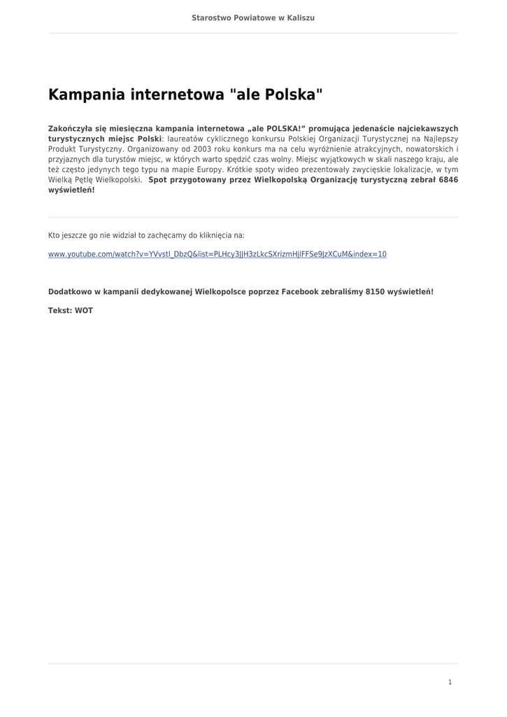 Starostwo Powiatowe w Kaliszu Kampania internetowa "ale Polska" Zakończyła się miesięczna kampania internetowa „ale POLSKA!” promująca jedenaście najciekawszych turystycznych miejsc Polski: laureatów cyklicznego konkursu Polskiej Organizacji Turystycznej na Najlepszy Produkt Turystyczny. Organizowany od 2003 roku konkurs ma na celu wyróżnienie atrakcyjnych, nowatorskich i przyjaznych dla turystów miejsc, w których warto spędzić czas wolny. Miejsc wyjątkowych w skali naszego kraju, ale też często jedynych tego typu na mapie Europy. Krótkie spoty wideo prezentowały zwycięskie lokalizacje, w tym Wielką Pętlę Wielkopolski. Spot przygotowany przez Wielkopolską Organizację turystyczną zebrał 6846 wyświetleń! Kto jeszcze go nie widział to zachęcamy do kliknięcia na: www.youtube.com/watch?v=YVvstI_DbzQ&list=PLHcy3JJH3zLkcSXrizmHjlFFSe9JzXCuM&index=10 Dodatkowo w kampanii dedykowanej Wielkopolsce poprzez Facebook zebraliśmy 8150 wyświetleń! Tekst: WOT 1