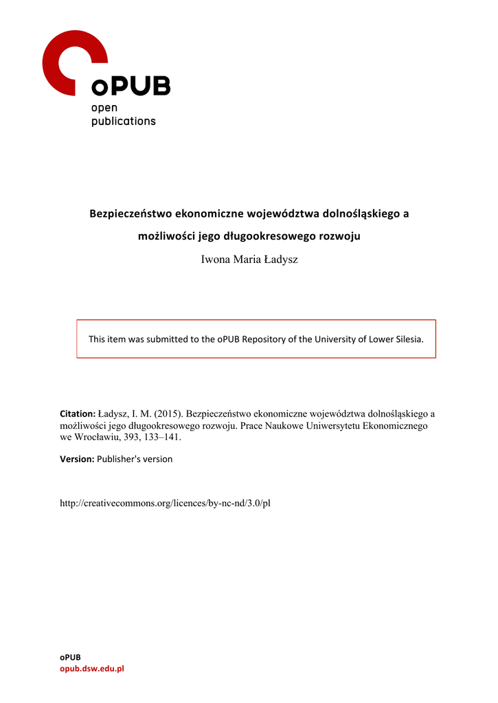 Bezpieczeństwoekonomicznewojewództwadolnośląskiegoa możliwościjegodługookresowegorozwoju Iwona Maria Ładysz ThisitemwassubmittedtotheoPUBRepositoryoftheUniversityofLowerSilesia. Citation:Ładysz, I. M. (2015). Bezpieczeństwo ekonomiczne województwa dolnośląskiego a możliwości jego długookresowego rozwoju. Prace Naukowe Uniwersytetu Ekonomicznego we Wrocławiu, 393, 133–141. Version:Publisher'sversion http://creativecommons.org/licences/by-nc-nd/3.0/pl oPUB opub.dsw.edu.pl PRACE NAUKOWE UNIWERSYTETU EKONOMICZNEGO WE WROCŁAWIU RESEARCH PAPERS OF WROCŁAW UNIVERSITY OF ECONOMICS nr 393 ● 2015 Problemy rozwoju regionalnego i lokalnego ISSN 1899-3192 e-ISSN 2392-0041 Iwona Maria Ładysz Dolnośląska Szkoła Wyższa – Wydział Nauk Społecznych i Dziennikarstwa e-mail: [email protected] BEZPIECZEŃSTWO EKONOMICZNE WOJEWÓDZTWA DOLNOŚLĄSKIEGO A MOŻLIWOŚCI JEGO DŁUGOOKRESOWEGO ROZWOJU1 ECONOMIC SECURITY OF THE LOWER SILESIAN VOIVODESHIP AND CAPABILITIES OF ITS LONG-TERM DEVELOPMENT DOI: 10.15611/pn.2015.393.13 Streszczenie: We współczesnej gospodarce zwiększa się znaczenie poszczególnych regionów. W województwie dolnośląskim przyjęto strategiczne podejście do rozwoju gospodarczego przy zapewnieniu bezpieczeństwa ekonomicznego regionu. Działanie to pozwala ukierunkować zmiany zachodzące w gospodarce i określić stopień realizacji założonych celów. Dla osiągnięcia zamierzeń konieczny jest bieżący monitoring stopnia realizacji celów, pozwalający sprawdzić, czy pojawiają się sygnały o zagrożeniu gospodarczym. Celem artykułu jest przedstawienie sposobu postrzegania bezpieczeństwa ekonomicznego Polski w programach rozwojowych na przykładzie województwa dolnośląskiego oraz wybranych wyznaczników rozwoju gospodarczego regionu, które wpływają na jego bezpieczeństwo ekonomiczne. Słowa kluczowe: bezpieczeństwo ekonomiczne, rozwój, region, strategia, program. Summary: In the contemporary economy there is growing importance of individual regions. The Lower Silesian Voivodeship has adopted a strategic approach to economic development, whilst ensuring the economic security of the region. This action allows to direct changes taking place in the economy and determine the level of implementation of intended objectives. A necessary measure for achieving the objectives would be ongoing monitoring of the level of implementation of intended actions, which will allow to check if there are any signals of risks to the economy. The purpose of the article will be to present the way of perceiving the economic security of Poland in development programmes on the example of the Lower Silesian Voivodeship and selected determinants of economic development of the region, which influence its economic security. Keywords: economic security, development, region, programme. 1 Praca dofinansowana ze środków Wydziału Nauk Społecznych i Dziennikarstwa Dolnośląskiej Szkoły Wyższej w roku 2014 jako projekt badawczy. 134 Iwona Maria Ładysz 1. Wstęp We współczesnej gospodarce zauważyć można zmniejszenie roli państwa w gospodarce przy jednoczesnym zwiększeniu znaczenia regionów, które wykazują większą elastyczność w zakresie dostosowań do zmiennego otoczenia niż inne jednostki przestrzenne. Zjawisko regionalizacji, czyli upodmiotowienia społeczności lokalnych oraz regionalnych, powoduje zmiany w sposobie gospodarowania przestrzenią regionów. Regiony stały się podmiotami procesów gospodarczych, które wyznaczają priorytety prowadzonej polityki, przedstawiając i realizując interesy danych wspólnot, którą reprezentują. W związku z tym regiony powinny posiadać swoistą zdolność do neutralizowania zagrożeń płynących z otoczenia zewnętrznego lub uwarunkowań wewnętrznych, która pozytywnie wpływa na ich konkurencyjność. W tym ujęciu można powiedzieć, że regiony rzadko są bezpieczne, gdyż pojawiają się cały czas różnego typu zagrożenia o charakterze gospodarczym, społecznym, politycznym, militarnym i inne. Dlatego też samo bezpieczeństwo ekonomiczne może zarówno bezpośrednio, jak i pośrednio wpływać na bezpieczeństwo narodowe. Jest ono jednym z warunków rozwoju regionów, a co za tym idzie – wzrostu konkurencyjności i zależy w znacznym stopniu od rozpoznania determinant efektywności i skuteczności jego kształtowania. Celem artykułu jest przedstawienie sposobu postrzegania bezpieczeństwa ekonomicznego Polski w programach rozwojowych na przykładzie województwa dolnośląskiego oraz wybranych wyznaczników rozwoju gospodarczego regionu, które wpływają na jego bezpieczeństwo ekonomiczne. 2.Postrzeganie bezpieczeństwa ekonomicznego Polski i jej regionów w programach rozwojowych Bezpieczeństwo ekonomiczne stało się jednym z celów polityki państwa i regionów. Można powiedzieć, że obejmuje ono co najmniej zapewnianie stanu spokojnego, niczym niezakłóconego funkcjonowania gospodarki lub poprawę istniejącej sytuacji. Odnosi się ono zarówno do podmiotów państwowych, jak i prywatnych, jakkolwiek jest różnie rozumiane. Można powiedzieć, że bezpieczeństwo ekonomiczne jest wypadkową czynników rozwoju gospodarczego i barier ograniczających stan gospodarki i jej struktur, a także stanu stosunków gospodarczych, zdolnych do skutecznego przeciwstawienia się negatywnym oddziaływaniom zewnętrznym, osłabiającym rozwój gospodarczy, stabilność systemu społeczno-politycznego oraz zdolność obronną. Ustawa z dnia 6 grudnia 2006 r. o zasadach prowadzenia polityki rozwoju [Dz.U. 2006 nr 227 poz. 1658 ze zm.] wprowadziła nowe podejście strategiczne do planowania rozwoju gospodarczego. Kwestia bezpieczeństwa Rzeczypospolitej Polskiej i jej regionów nabrała nowego znaczenia z chwilą przyjęcia przez Radę Bezpieczeństwo ekonomiczne województwa dolnośląskiego... 135 Ministrów Długookresowej Strategii Rozwoju Kraju. Polska 2030. Trzecia Fala Nowoczesności [M.P. 2013,