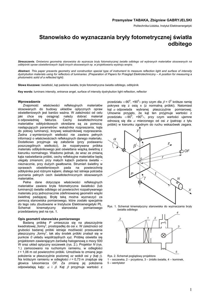 Przemysław TABAKA, Zbigniew GABRYJELSKI Politechnika Łódzka, Instytut Elektroenergetyki Stanowisko do wyznaczania bryły fotometrycznej światła odbitego Streszczenie. Omówiono geometrię stanowiska do wyznacza bryły fotometrycznej światła odbitego od wybranych materiałów stosowanych na odbłyśniki opraw oświetleniowych bądź innych stosowanych np. w projektowaniu wystroju wnętrz. Abstract. This paper presents geometry and construction special type of instrument to measure reflection light and surface of intensity dystrybution materials using for reflectors of luminaries. (Preparation of Papers for Przegląd Elektrotechniczny – A position for measuring a photometric solid of a reflected light). Słowa kluczowe: światłość, kąt padania światła, bryła fotometryczna światła odbitego, odbłyśnik Key words: luminars intensity, entrance angel, surface of intensity dystrybution light reflection, reflector Wprowadzenie Znajomość właściwości refleksyjnych materiałów stosowanych do budowy układów optycznych opraw oświetleniowych jest bardzo ważna. W zależności od celu jaki chce się osiągnąć należy dobrać materiał o odpowiedniej fakturze. Cechy światłotechniczne materiałów odbłyśnikowych określane są za pomocą: następujących parametrów: wskaźnika rozpraszania, kąta do połowy luminancji, krzywej wskaźnikowej rozpraszania. Żadna z wymienionych wielkości nie zawiera pełnych informacji o właściwościach refleksyjnych danego materiału. Dodatkowo przyjmuje się założenie (przy podawaniu poszczególnych wielkości), że rozpatrywana próbka materiału odbłyśnikowego jest oświetlana wiązką świetlną z kierunku normalnego. Wiadomo jednak, że wraz ze zmianą kąta naświetlania próbki, cechy refleksyjne materiałów będą ulegały zmianom; przy małych kątach padania światła – nieznacznie, przy dużych gwałtownie. Strumień świetlny w oprawach oświetleniowych pada na powierzchnię odbłyśnika pod różnymi kątami, dlatego też istnieje potrzeba poznania pełnych cech światłotechnicznych stosowanych materiałów. Pełne dane dotyczące właściwości refleksyjnych materiałów zawiera bryła fotometryczna światłości (lub luminancji) światła odbitego od powierzchni rozpatrywanego materiału przy jednoznacznie zdefiniowanej geometrii wiązki świetlnej padającej. Bryłę taką można wyznaczyć za pomocą stanowiska pomiarowego, które zostało specjalnie do tego celu zbudowane w Instytucie Elektroenergetyki PŁ. Schemat kinematyczny stanowiska pomiarowego przedstawiony jest na rys. 1. Opis geometrii stanowiska pomiarowego Badaną próbkę P umieszcza się na płaszczyźnie kwadratowej „formy”, prostopadłej do osi x. W zależności od grubości badanej próbki istnieje możliwość przesuwania płaszczyzny „formy”, tak aby środek próbki znalazł się w punkcie 0 układu współrzędnych xyz. Próbkę oświetla się projektorem zawierającym żarówkę halogenową o mocy 500 W oraz układ optyczny soczewek (rys. 2.). Projektor N (rys. 1.) zamocowano na ruchomym ramieniu, w odległości t = 1,06 m od powierzchni próbki. Umożliwia to zmianę jego położenia w płaszczyźnie poziomej xz wokół osi y (kąt γ). Na krótszym ramieniu w odległości r = 0,73 m znajduje się głowica luksomierza OF. Za zmianę jej położenia odpowiadają kąty: α i β. Kąt β przyjmuje wartości z 0 0 0 przedziału <-90 , +90 > przy czym dla β = 0 krótsze ramię pokrywa się z osią x (z normalną próbki). Natomiast kąt α odpowiada wybranej płaszczyźnie pomiarowej. Umownie przyjęto, że kąt ten przyjmuje wartości z przedziału <-900, +900>, przy czym wartości ujemne odnoszą się dla α mierzonego od osi z (patrząc z tyłu próbki) w kierunku zgodnym do ruchu wskazówek zegara. y z OF r 0 t P N X Rys. 1. Schemat kinematyczny stanowiska do wyznaczania bryły światła odbitego 4 2 1 2 3 5 Rys. 2. Schemat poglądowy projektora 1 – soczewka, 2 – przysłona, 3 – źródło światła, 4 – kominek, 5 – wentylator 1 Idea pomiaru Dla odwzorowania bryły fotometrycznej światła odbitego należy wykonać szereg pomiarów, w celu wyznaczenia zbioru krzywych światłości, odpowiadających przecięciom półprzestrzeni szeregiem płaszczyzn przechodzących przez oś poziomą (oś x) i nachylonych względem siebie o kąt Δα (rys. 3.) Przedział kątów α, w których wystąpią realne wartości światłości zależy od kierunkowości odbicia badanego materiału. W przypadku próbek charakteryzujących się dużą kierunkowością odbicia przy znikomym udziale odbicia dyfuzyjnego, przedział kąta α będzie niewielki – rzędu kilku 0 0 stopni np. <-7 ,+7 >. Natomiast w przypadku występowania składowej światła rozproszonego, wektory światłości pojawią się również w szerszym zakresie kąta α. +60 +45 +30 +75 +90 (tak jak na fot. 2.). Zasłonka ta nie może jednak przesłaniać strumienia świetlnego oświetlającego próbkę. Pomiar światła odbitego od badanego materiału odbywa się ze pomocą luksomierza o klasie dokładności 5. Miernik przystosowany jest do współpracy z komputerem. Komunikacja pomiędzy komputerem a jednostka sterującą jest dwukierunkowa, tzn. przyrząd zarówno wysyła dane jak również może być sterowany przez komputer. Przykładowe zdjęcia z laboratorium w którym znajduje się prezentowane stanowisko przedstawiono na fot. 3 i fot._4. y z +15 0 +90 P -15 +75 -30 +60 -45 -60 +45 -75 -90 +30 -90 +15 -75 0 -60 -45 -30 -15 x Fot. 3. Stanowisko do pomiaru bryły fotometrycznej światła odbitego – widok z tyłu Rys. 3. Idea pomiaru Tak więc ilość płaszczyzn w których należy przeprowadzić pomiar zależy od faktury badanej próbki. Istotne znaczenie przy określaniu przedziału kąta α będzie miał także kierunek oświetlania - kąt γ. Wraz ze wzrostem kąta padania światła należy spodziewać się (sądząc po pilotażowych wynikach badań) stopniowego zanik