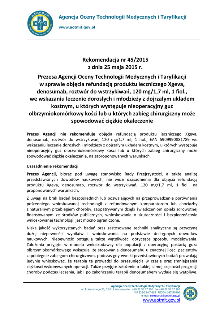 Agencja Oceny Technologii Medycznych i Taryfikacji www.aotmit.gov.pl Rekomendacja nr 45/2015 z dnia 25 maja 2015 r. Prezesa Agencji Oceny Technologii Medycznych i Taryfikacji w sprawie objęcia refundacją produktu leczniczego Xgeva, denosumab, roztwór do wstrzykiwań, 120 mg/1,7 ml, 1 fiol., we wskazaniu leczenie dorosłych i młodzieży z dojrzałym układem kostnym, u których występuje nieoperacyjny guz olbrzymiokomórkowy kości lub u których zabieg chirurgiczny może spowodować ciężkie okaleczenie Prezes Agencji nie rekomenduje objęcia refundacją produktu leczniczego Xgeva, denosumab, roztwór do wstrzykiwań, 120 mg/1,7 ml, 1 fiol., EAN 5909990881789 we wskazaniu leczenie dorosłych i młodzieży z dojrzałym układem kostnym, u których występuje nieoperacyjny guz olbrzymiokomórkowy kości lub u których zabieg chirurgiczny może spowodować ciężkie okaleczenie, na zaproponowanych warunkach. Uzasadnienie rekomendacji Prezes Agencji, biorąc pod uwagę stanowisko Rady Przejrzystości, a także analizę przedstawionych dowodów naukowych, nie widzi uzasadnienia dla objęcia refundacją produktu Xgeva, denosumab, roztwór do wstrzykiwań, 120 mg/1,7 ml, 1 fiol., na proponowanych warunkach. Z uwagi na brak badań bezpośrednich lub pozwalających na przeprowadzenie porównania pośredniego wnioskowanej technologii z refundowanym komparatorem lub chociażby z naturalnym przebiegiem choroby, zaopatrywanym dzięki świadczeniom opieki zdrowotnej finansowanym ze środków publicznych, wnioskowanie o skuteczności i bezpieczeństwie wnioskowanej technologii jest mocno ograniczone. Niska jakość wykorzystanych badań oraz zastosowane techniki analityczne są przyczyną dużej niepewności wyników i wnioskowania na podstawie dostępnych dowodów naukowych. Niepewność potęgują także wątpliwości dotyczące sposobu modelowania. Założenia przyjęte w modelu wnioskodawcy dla populacji z operacyjną postacią guza olbrzymiokomórkowego wskazują, że stosowanie denosumabu u znacznej ilości pacjentów zapobiegnie zabiegom chirurgicznym, podczas gdy wyniki przedstawionych badań pozwalają jedynie wnioskować, że terapia ta prowadzi do przesunięcia w czasie oraz zmniejszenia ciężkości wykonywanych operacji. Także przyjęte założenie o takiej samej częstości progresji choroby podczas leczenia, jak i po zakończeniu terapii denosumabem wydaje się wątpliwe. Agencja Oceny Technologii Medycznych i Taryfikacji ul. I. Krasickiego 26, 02-611 Warszawa tel. +48 22 56 67 200 fax +48 22 56 67 202 NIP 525-23-47-183 REGON 140278400 e-mail: [email protected] www.aotmit.gov.pl Rekomendacja nr 45/2015 Prezesa AOTMiT z dnia 25 maja 2015 r. Wartości użyteczności określone dla pacjentów młodych (poniżej 40 r.ż.) nie uwzględniają spadku użyteczności związanego z wiekiem. Także założona jednakowa długość terapii zarówno dla populacji pacjentów z operacyjną, jak i nieoperacyjną postacią GCTB nie wydaje się być właściwa. Modelowanie progresji choroby w populacji nieoperacyjnej uwzględnia dane z badania klinicznego dotyczące najlepszej odpowiedzi na leczenie, co może zawyżać wyniki z uwagi na dyskontynuację pacjentów w badaniu z powodu niezgłaszania się na wizyty kontrolne lub wymagających alternatywnych terapii. Z uwagi na niewielką populację i szansę na ograniczenie ryzyka okaleczenia osób chorych z rozpoznaniem guza olbrzymiokomórkowego kości, Prezes Agencji rekomenduje ewentualne finansowanie ze środków publicznych produktu leczniczego Xgeva we wnioskowanym wskazaniu pod warunkiem dalszego obniżenia ceny (bezpośrednio lub z wykorzystaniem instrumentu dzielenia ryzyka) oraz konieczności monitorowania skuteczności leczenia celem sprawdzenia, w jakim stopniu zastosowanie denosumabu wiąże się z odnoszeniem przez pacjenta korzyści zdrowotnych wynikających z leczenia. Oszacowania wielkości populacji docelowej oraz koszt jednostkowy terapii wskazują, że obciążenia dla płatnika publicznego nie wydają się być znaczące. Populacja pacjentów, u których występuje guz olbrzymiokomórkowy kości jest niewielka. Z uwagi na charakter choroby, niewielką populację chorych i brak informacji o przebiegu choroby przy aktualnie finansowanych świadczeniach opieki zdrowotnej, wskazane wydaje się objęcie rejestrem wszystkich pacjentów z tą jednostką chorobową. Przedmiot wniosku Zlecenie Ministra Zdrowia dotyczy zasadności finansowania ze środków publicznych produktu leczniczego Xgeva, denosumab, roztwór do wstrzykiwań, 120 mg/1,7 ml, 1 fiol., EAN 5909990881789 w ramach kategorii dostępności refundacyjnej: lek stosowany w ramach chemioterapii, we wskazaniu określonym stanem klinicznym oraz lek dostępny w aptece na receptę, we wskazaniu określonym stanem klinicznym. Podmiot odpowiedzialny przedstawił propozycję instrumentu dzielenia ryzyka polegającą na . Proponowana cena zbytu netto to . Problem zdrowotny Opis problemu Guz olbrzymiokomórkowy (Giant Cell Tumor of Bone (GCTB), łac. tumor gigantocellularis ossis)(ICD10 D48.0) to rzadko występujący śródszpikowy guz niszczący tkankę kości. Występuje u dorosłych pomiędzy 20. a 40. rokiem życia, częściej u kobiet niż u mężczyzn. Guz olbrzymiokomórkowy jest niemal zawsze zmianą łagodną, ale charakterystyczny jest dla niej nieprzewidywalny przebieg. Jest pierwotnym, osteolitycznym nowotworem kości, z niską tendencją do przerzutów (zwykle są to przerzuty do płuc). Objawia się poprzez bóle kości i obrzęk. Charakterystyczny jest ból w miejscu, gdzie się pojawiła zmiana, wyraźne pogrubienie kończyny, a czasem nawet patologiczne złamania kości. Ból nasila się przede wszystkim podczas aktywności fizycznej. Występuje głównie u osób które osiągnęły dojrzałość szkieletową w nasadach kości długich, głównie w dalszej części kości udowej, szczególnie w obrębie stawu kolana, a także w nasadach bliższych piszczeli, bliższej ko