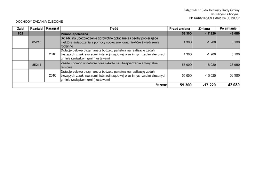 Załącznik nr 3 do Uchwały Rady Gminy w Starym Lubotyniu Nr XXIX/145/09 z dnia 24.09.2009r DOCHODY ZADANIA ZLECONE Dział Rozdział Paragraf 852 85213 2010 85214 2010 Treść Przed zmianą Zmiana Po zmianie Pomoc społeczna Składki na ubezpieczenie zdrowotne opłacane za osoby pobierające niektóre świadczenia z pomocy społecznej oraz niektóre świadczenia rodzinne Dotacje celowe otrzymane z budŜetu państwa na realizację zadań bieŜących z zakresu administaracji rządowej oraz innych zadań zleconych gminie (związkom gmin) ustawami 59 300 -17 220 42 080 4 300 -1 200 3 100 4 300 -1 200 3 100 Zasiłki i pomoc w naturze oraz składki na ubezpieczenia emerytalne i rentowe Dotacje celowe otrzymane z budŜetu państwa na realizację zadań bieŜących z zakresu administaracji rządowej oraz innych zadań zleconych gminie (związkom gmin) ustawami 55 000 -16 020 38 980 55 000 -16 020 38 980 Razem: 59 300 -17 220 42 080
