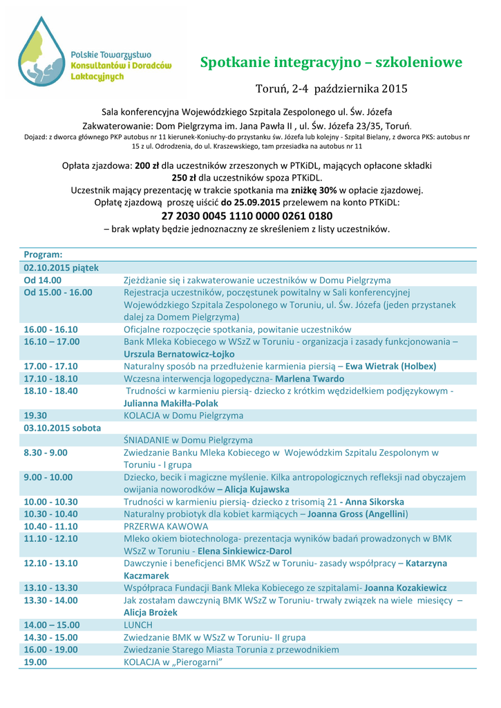 Spotkanie integracyjno – szkoleniowe Toruń, 2-4 października 2015 Sala konferencyjna Wojewódzkiego Szpitala Zespolonego ul. Św. Józefa Zakwaterowanie: Dom Pielgrzyma im. Jana Pawła II , ul. Św. Józefa 23/35, Toruń. Dojazd: z dworca głównego PKP autobus nr 11 kierunek-Koniuchy-do przystanku św. Józefa lub kolejny - Szpital Bielany, z dworca PKS: autobus nr 15 z ul. Odrodzenia, do ul. Kraszewskiego, tam przesiadka na autobus nr 11 Opłata zjazdowa: 200 zł dla uczestników zrzeszonych w PTKiDL, mających opłacone składki 250 zł dla uczestników spoza PTKiDL. Uczestnik mający prezentację w trakcie spotkania ma zniżkę 30% w opłacie zjazdowej. Opłatę zjazdową proszę uiścić do 25.09.2015 przelewem na konto PTKiDL: 27 2030 0045 1110 0000 0261 0180 – brak wpłaty będzie jednoznaczny ze skreśleniem z listy uczestników. Program: 02.10.2015 piątek Od 14.00 Od 15.00 - 16.00 16.00 - 16.10 16.10 – 17.00 17.00 - 17.10 17.10 - 18.10 18.10 - 18.40 19.30 03.10.2015 sobota 8.30 - 9.00 9.00 - 10.00 10.00 - 10.30 10.30 - 10.40 10.40 - 11.10 11.10 - 12.10 12.10 - 13.10 13.10 - 13.30 13.30 - 14.00 14.00 – 15.00 14.30 - 15.00 16.00 - 19.00 19.00 Zjeżdżanie się i zakwaterowanie uczestników w Domu Pielgrzyma Rejestracja uczestników, poczęstunek powitalny w Sali konferencyjnej Wojewódzkiego Szpitala Zespolonego w Toruniu, ul. Św. Józefa (jeden przystanek dalej za Domem Pielgrzyma) Oficjalne rozpoczęcie spotkania, powitanie uczestników Bank Mleka Kobiecego w WSzZ w Toruniu - organizacja i zasady funkcjonowania – Urszula Bernatowicz-Łojko Naturalny sposób na przedłużenie karmienia piersią – Ewa Wietrak (Holbex) Wczesna interwencja logopedyczna- Marlena Twardo Trudności w karmieniu piersią- dziecko z krótkim wędzidełkiem podjęzykowym Julianna Makiłła-Polak KOLACJA w Domu Pielgrzyma ŚNIADANIE w Domu Pielgrzyma Zwiedzanie Banku Mleka Kobiecego w Wojewódzkim Szpitalu Zespolonym w Toruniu - I grupa Dziecko, becik i magiczne myślenie. Kilka antropologicznych refleksji nad obyczajem owijania noworodków – Alicja Kujawska Trudności w karmieniu piersią- dziecko z trisomią 21 - Anna Sikorska Naturalny probiotyk dla kobiet karmiących – Joanna Gross (Angellini) PRZERWA KAWOWA Mleko okiem biotechnologa- prezentacja wyników badań prowadzonych w BMK WSzZ w Toruniu - Elena Sinkiewicz-Darol Dawczynie i beneficjenci BMK WSzZ w Toruniu- zasady współpracy – Katarzyna Kaczmarek Współpraca Fundacji Bank Mleka Kobiecego ze szpitalami- Joanna Kozakiewicz Jak zostałam dawczynią BMK WSzZ w Toruniu- trwały związek na wiele miesięcy – Alicja Brożek LUNCH Zwiedzanie BMK w WSzZ w Toruniu- II grupa Zwiedzanie Starego Miasta Torunia z przewodnikiem KOLACJA w „Pierogarni” 04.10.2015 niedziela 8.30 – 11.00 11.15 ŚNIADANIE w Domu Pielgrzyma Sala św. Gerarda w Domu Pielgrzyma Warsztat, prezentacja ciekawych przypadków, wymiana doświadczeń: Warsztat: „Kiedy dziecko nie chce ssać…” – Agnieszka Muszyńska, Kinga Osuch Ciekawe przypadki z praktyki konsultanta i doradcy: Sylwia Jeż, Kinga Osuch Sprawozdania z imprez promujących karmienie piersią – Sylwia Jeż, Joanna Kozakiewicz Prezentacja badań: „Hiperaktywny wypływ pokarmu i jego wpływ na kontynuację karmienia piersią" – Agnieszka Kamińska-Nowak Wyjście -niespodzianka – 11.25 autobus nr 11 do Placu Rapackiego stamtąd na ul. Rabiańską 9 12.00 – 13.30 zwiedzanie Żywego Muzeum Piernika… Po zwiedzaniu - rozjeżdżamy się do domów. Proszę o zgłoszenie się osób, które zamawiają menu wegetariańskie: [email protected] Organizator zastrzega sobie możliwość zmian w programie.