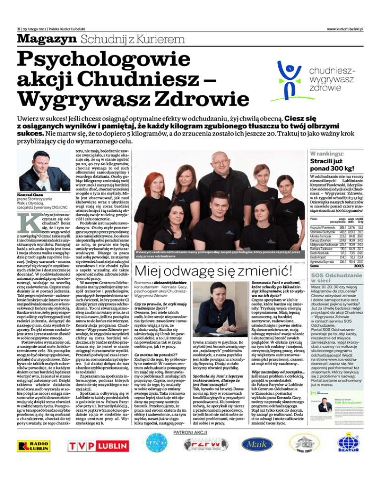 X | 25 lutego 2011 | Polska Kurier Lubelski www.kurierlubelski.pl Magazyn Schudnij z Kurierem Psychologowie akcji Chudniesz – Wygrywasz Zdrowie Uwierz w sukces! Jeśli chcesz osiągnąć optymalne efekty w odchudzaniu, żyj chwilą obecną. Ciesz się z osiąganych wyników i pamiętaj, że każdy kilogram zgubionego tłuszczu to twój olbrzymi sukces. Nie martw się, że to dopiero 5 kilogramów, a do zrzucenia zostało ich jeszcze 20. Traktuj to jako ważny krok przybliżający cię do wymarzonego celu. Konrad Gaca prezes Stowarzyszenia Walki z Otyłością, specjalista żywieniowy CNS i CNC K tóry to już raz zaczynasz się odchudzać? Boisz się, że i tym razem waga wróci z nawiązką? Odrzuć takie myśli i nie obniżaj swojej radości z uzyskiwanych wyników. Pamiętaj każda sekunda życia jest inna i twoja obecna walka z wagą będzie przebiegała zupełnie inaczej. Jedyny warunek - musisz nauczyć się cieszyć z uzyskiwanych efektów i dostatecznie je doceniać. W podświadomości automatycznie dążymy do równowagi, szukając za wszelką cenę zadowolenia. Często znajdujemy je w postaci jedzenia. Taki program jedzenie - zadowolenie funkcjonuje latami w naszej podświadomości, co w konsekwencji kończy się otyłością. Bardzo ważne, żeby przy rozpoczęciu diety, czyli rezygnacji z tej radości jedzenia, dołączyć do naszego planu dnia wysiłek fizyczny. Dzięki niemu rozładujesz stres i przestaniesz dławić w sobie negatywne emocje. Postaw sobie wymarzony cel, a następnie ustal małe, krótkoterminowe cele. Na początku mogą to być okresy tygodniowe, później dwutygodniowe. Zdobywanie takich małych sukcesików powoduje, że z każdym dniem coraz bardziej będziesz wierzyć w to, że jesteś w stanie osiągnąć założony cel. Dzięki takiemu właśnie działaniu mnóstwo osób wyzwala w sobie potężne moce i osiąga niesamowite wyniki dowartościowując się dzięki temu również w codziennym życiu. Postępując w ten sposób bardzo szybko przekonują się, że są osobami z charakterem, chociaż do tej pory uważały, że tego charak- teru, nie mają, bo jedzenie zawsze zwyciężało, a tu nagle okazuje się, że są w stanie zgubić po 20, 40 czy 60 kilogramów, chociaż wymaga to od nich olbrzymiej samodyscypliny i twardego działania. Osoby gubiąc kilogramy zmieniają swój wizerunek i zaczynają bardziej o siebie dbać, chociaż wcześniej w ogóle o tym nie myślały. Miło jest obserwować, jak nasi klubowicze wraz z ubytkiem wagi stają się coraz bardziej uśmiechnięci i tą radością obdarzają swoje rodziny, przyjaciół i całe otoczenie. Podobnie jest na polu zawodowym. Osoby otyłe postrzegane są często przez pracodawcę jako mniej efektywne, bo skoro nie potrafią sobie poradzić same ze sobą, to pewnie nie będą umiały wykazać się w życiu zawodowym. Dlatego ta praca nad sobą powoduje, że stajemy się również bardziej atrakcyjni zawodowo i nie chodzi tylko o aspekt wizualny, ale także o pewność siebie, zdrowie i efektywność pracy. W naszym Centrum Odchudzania mamy profesjonalny zespół trenerów i psychologów, pracujących bezpośrednio na salach ćwiczeń, który pomoże Ci przejść przez cały proces odchudzania. To oni stwarzają atmosferę zaufania i wiary w to, że ci się uda nawet, jeśli na początku sam w to do końca nie wierzysz. Konstrukcja programu Chudniesz - Wygrywasz Zdrowie powoduje, że z tygodnia na tydzień efekty są coraz bardziej widoczne, a ty bardzo szybko przekonasz się, że jesteś w stanie osiągnąć niesamowite wyniki. Przestań poświęcać czas i energię na to, co może zdarzyć się jutro. Już dzisiaj dołącz do nas a bardzo szybko przekonasz się, że to działa! Zapraszam na spotkania informacyjne, podczas których dowiecie się wszystkiego o naszej akcji. Spotkania odbywają się w Lublinie w każdy poniedziałek o godzinie 20 w Pałacu Parysów przy ul. Bernardyńskiej 3 , oraz w piątki w Zamościu o godzinie 19.30 w siedzibie naszego centrum przy ul. Wyszyńskiego 63 b. W rankingu: Stracili już ponad 300 kg! W odchudzaniu nie ma rzeczy niemożliwych! Lublinianin Krzysztof Pawłowski, lider pilotów siódmej edycji akcji Chudniesz - Wygrywasz Zdrowie, w 18. tygodni schudł już 51,1 kg! Dziewiątka naszych bohaterów w niewiele ponad cztery miesiące straciła aż 300 kilogramów! Piloci W naszym centrum odchudzania mamy profesjonalny zespół psychologów, który pomoże ci przejść przez cały proces odchudzania Miej odwagę się zmienić! Rozmowa z Aleksandrą Aleksandr¹ Machlarz, konsultantem Konrada Gacy, psychologiem akcji Chudniesz Wygrywasz Zdrowie Czy to prawda, że otyli mają trudniejsze życie? Owszem. Jest wiele takich osób, które swoje niepowodzenia życiowe, zawodowe i towarzyskie wiążą z tym, że za dużo ważą. Rzadko się uśmiechają się i brak im pewności siebie, a to już rzutuje na powodzenie tak w życiu osobistym, jak i w pracy. Co można im poradzić? Zachęcić do tego, by próbowały to zmienić. W naszym centrum odchudzania pomagamy im zająć się sobą. Rozmawiamy o problemach szukając ich przyczyny. Często, motywujemy też do tego, by znalazły w sobie odwagę do zmiany swojego życia. Taka rozmowa często lepiej skutkuje niż zjadany na poprawę nastroju batonik. Przekonujemy, że praca nad swoim ciałem da im efekty i zadowolenie, a za tym szybko, nawet już w ciągu kilku tygodni, nastąpią pozy- tywne zmiany w psychice. Bo otyłość jest konsekwencją często „zajadanych” problemów osobistych, a nasza psychika jest ściśle powiązana z kondycją fizyczną. Dbając o ciało leczymy również psychikę. Spotkała się Pani z lepszym traktowaniem, dlatego że jest Pani szczupła? Tak, bywało mi łatwiej. Dawano mi np. fory w rozmowach kwalifikacyjnych z przyszłymi pracodawcami. Klubowicze mówią, że spotykali się nieraz z przekonaniem pracodawcy, że jeśli ktoś nie radzi sobie ze swoimi problemami, nie poradzi sobie