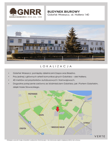 BUDYNEK BIUROWY Gdańsk Wrzeszcz, al. Hallera 140 L O K A L I Z A C J A • Gdańsk Wrzeszcz: pomiędzy dzielnicami Zaspa oraz Brzeźno. • Przy jednej z głównych arterii komunikacyjnych Gdańska – alei Hallera. • 40 metrów od przystanków autobusowych i tramwajowych. • Dogodne połączenie zarówno ze śródmieściem Gdańska, jak i Portem Gdańskim, dzięki trasie Słowackiego. VERTE Niniejsze warunki mają charakter wyłącznie informacyjny i nie stanowią części wiążącej oferty lub umowy. BUDYNEK BIUROWY Gdańsk Wrzeszcz, al. Hallera 140 PODSTAWOWE INFORMACJE Adres Standard Gdańsk, Al. Hallera 140 Dostępność x Wentylacja mechaniczna x Podnoszone podłogi od zaraz Proponowana powierzchnia ✔ Podwieszane sufity ✔ Okablowanie telefoniczne I piętro: 33 m2 Wysokość Maksymalna: 300 cm Czynsz 44,00 zł m2/miesiąc Koszty eksploatacyjne m2/miesiąc 15,00 zł m2/miesiąc ✔ Okablowanie komputerowe ✔ Okablowanie elektryczne x Czujnik dymu ✔ Wykładzina ✔ Podział powierzchni ściankami ✔ Recepcja 24/7 ✔ Ochrona budynku Miejsca parkingowe Łącznie: 154, Dla najemcy: 10 ✔ Kable światłowodowe ✔ Centrala telefoniczna ✔ Otwierane okna AGENT WYŁĄCZNY GNRR Robert Reich 80-280 GDAŃSK ul. Szymanowskiego 2 tel.: 58 699 07 77 www.GNRR.pl OSOBY DO KONTAKTU Maciej Kobylański Tel. 603 067 227 [email protected] Katerina Kakaris Tel. 506 120 120 [email protected] Niniejsze warunki mają charakter wyłącznie informacyjny i nie stanowią części wiążącej oferty lub umowy.