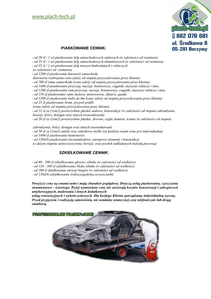 www.piach-tech.pl PIASKOWANIE CENNIK: - od 20 zł / 1 szt piaskowanie felg samochodowych stalowych (w zależności od rozmiaru) - od 25 zł / 1 szt piaskowanie felg samochodowych aluminiowych (w zależności od rozmiaru) - od 35 zł / 1 szt piaskowanie felg maszyn budowlanych i rolniczych (w zależności od rozmiaru) - od 1200 zł piaskowanie karoserii samochodu (karoseria rozbrojona cena zależy od stopnia przyszykowania przez klienta) - od 700 zł rama samochodu (cena zależy od stopnia przyszykowania przez klienta) - od 1400 zł piaskowanie przyczep, naczep, betonowozy, ciągniki, maszyny rolnicze i inne. - od 1200 zł piaskowanie ram przyczep, naczep, betonowozy, ciągniki, maszyny rolnicze i inne. - od 150 zł piaskowanie ramy motoru, motoroweru, skutera, quada - od 1200 zł piaskowanie łodzi do 6m (cena zależy od stopnia przyszykowania przez klienta) - od 25 zł piaskowanie bram, przęseł profili (cena zależy od stopnia przyszykowania przez klienta) - od 22 zł za (1xm2) powierzchnie płaskie stalowe, konstrukcje (w zależności od stopnia zabrudzenia, korozji, ilości, dostępu oraz innych uwarunkowań) - od 20 zł za (1xm2) powierzchnie płaskie, drewno, cegła, kamień, ściana (w zależności od stopnia zabrudzenia, ilości, dostępu oraz innych uwarunkowań) - od 50 zł za (1xm2) antyki oraz zabytkowe meble (za każdym razem cena jest indywidualna) - od 1400 zł piaskowanie kontenerów - od 120zł/h piaskowanie niestandardowe, nietypowe elementy i konstrukcje (o dużym stopniu zanieczyszczenia, korozji, oraz powłok nakładanych metodą piecową) SZKIEŁKOWANIE CENNIK: - od 80 - 200 zł szkiełkowanie głowicy silnika (w zależności od wielkości) - od 150 - 300 zł szkiełkowanie bloku silnika (w zależności od wielkości) - od 200 zł skiełkowanie skrzyni biegów (w zależności od wielkości) - od 150zł/h szkiełkowanie (roboczogodzina oczyszczarki) Powyższe ceny są cenami netto i mają charakter poglądowy. Dotyczą usług piaskowania, czyszczenia strumieniowo – ściernego. Wyżej wymienione ceny nie zawierają kosztów konserwacji i zabezpieczeń antykorozyjnych, malowania i innych dodatkowych usług renowacyjnych i wykończeniowych. Dla każdego Klienta sporządzamy indywidualną wycenę. Przed przyjęciem i realizacją zamówienia, nie ustalamy ostatecznej ceny telefonicznie lub drogą emailową.