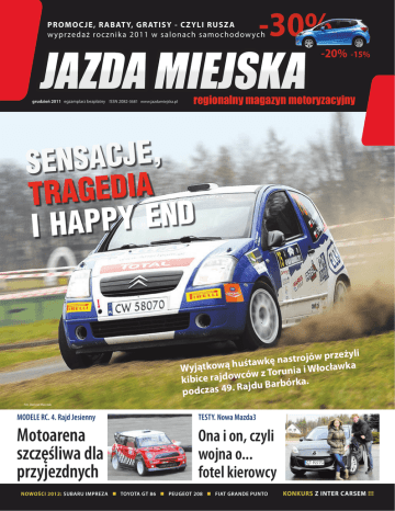 --30% 30% PROMOC JE, R ABAT Y, GR ATISY - CZ YLI RUSZ A w ypr zedaż rocznik a 2011 w salonach samochodow ych -20% -15% grudzień 2011 egzamplarz bezpłatny ISSN 2082-3681 www.jazdamiejska.pl regionalny magazyn motoryzacyjny , E J C A S SEN A I D E G TRA D N E Y P I HAP w przeżyli jó o r t s a n ę k uśtaw ławka c ło Wyjątkową h W i ia n u r ców z To kibice rajdow rbórka. a B u jd a R . 9 4 podczas Fot. Dariusz Marczak MODELE RC. 4. Rajd Jesienny TESTY. Nowa Mazda3 Motoarena szczęśliwa dla przyjezdnych Ona i on, czyli wojna o... fotel kierowcy NOWOŚCI 2012: SUBARU IMPREZA TOYOTA GT 86 PEUGEOT 208 FIAT GRANDE PUNTO KONKURS Z INTER CARSEM !!! Z REGIONU NA WSTĘPIE Lubię to: www.facebook.pl/jazdamiejska Motoryzacja okiem kobiety, czyli bardziej subtelny męski punkt widzenia Piszemy o... TEST. Nowa Mazda3 - „Ona i on” TEST. Mitsubishi ASX z nowym silnikiem diesla 18. 4. Justyna Kalinowska redaktor wydania Po sukcesie ostatniego, specjalnego numeru „Magazynu JazdaMiejska”, pojawienie się kolejnego było tylko kwestią czasu. Ale czy ktoś spodziewał się w tym miejscu kobiety? Zapewne nikt, bo określenie „niewielu” byłoby tu zwyczajnym nadużyciem. Motoryzacja powoli przestaje być wyłącznie domeną mężczyzn, bo od kilku lat, śladami współprowadzącej „Automaniaka”, coraz więcej pasjonatek motoryzacji mówi o swoich zainteresowaniach głośno. Cieszę się, że mogę wyrazić kobiece spojrzenie na pewne sprawy, choć po przeczytaniu relacji z testu Mazdy3 „Ona i on” można łatwo zauważyć, że nie jest ono tak drastycznie różne od męskiego punktu widzenia. Może po prostu czasami naszą uwagę przyciągają inne detale? W tym numerze chcieliśmy także przybliżyć nieuchronnie zbliżające się zmiany w ustawie o kierujących pojazdami, nowinki z „wielkiego świata motoryzacji” oraz (a może przede wszystkim) informacje o promocjach prosto z salonów. Jak zwykle nie zabranie też przydatnych porad, rzetelnych testów, a także relacji ze zmagań motosportowców z regionu. Oby te kilkadziesiąt minut poświęconych na lekturę naszego magazynu, było jedną z przyjemniejszych chwil tego dnia! KONKURS z zimowymi nagrodami Abarth 500 i Abarth Punto EVO 11. PORADY. Zima bezpieczniejsza z polisą AC Gwiazdkowy przegląd prezentów Zmiany w przepisach na prawo jazdy Jak korzystać z ręcznej myjni bezdotykowej 5. 7. 8. 20. MOTORSPORT. Głosujmy na motorsportowców regionu 49. Rajd Barbórki, Kryterium Asów na Karowej 4. Rajd Jesienny modeli RC na Motoarenie 3. 22. 17. KRÓTKO O... Ford Focus ST. Bezprecedensowa dynamika Renault Laguna Coupe. Jeszcze bardziej rasowa 17. 16. UŻYWANE. Toyota Avensis 1.8 VVT-i 2003-2006 15. Startuj po nagrody! Do wygrania są latarki, kable rozruchowe, koszule, zimowe płyny do spryskiwacza, kalendarze, skrobaczki, narzędzia i wiele innych gadżetów niezbędnych każdemu kierowcy zimową porą. Nagrody funduje toruńska filia hurtowni motoryzacyjnej Inter Cars. Zasady konkursu sa prostę. Wystarczy tylko: 1. Do 31.12.2011r zostać fanem „JazdyMiejskiej” na Faceboku 2. Wejść na stronę www.jazdamiejska.pl i kilknąć „Lubię to” na prawym pasku „Znajdź nas na Facebooku” 3. Spośród wszystkich nowych fanów rozlosujemy zestawy „Zimowy niezbędnik kierowcy” 4. Dodatkowy, specjalny zestaw zostanie powędruje do jednej z naszych nowych fanek 5. Losowanie już 5. stycznia 2012r. Wyniki opublikujemy na portalu www.jazdamiejska.pl. FLASH GŁOSUJMY NA MOTOSPORTOWCÓW! regionalny magazyn motoryzacyjny Jak się z nami skontaktować: Redakcja: ul. Przy Skarpie 23g/72, 87-100 Toruń [email protected] www.jazdamiejska.pl Redaktor Naczelny: Michał Jasiński [email protected] Redaktor prowadzący: Justyna Kalinowska [email protected] Reklama, marketing: [email protected] Wydawca: Fabryka Dobrych Pomysłów ul. Przy Skarpie 23g/72, 87-100 Toruń www.fdp.media.pl, [email protected] Dystrybucja: VIP Ogólnopolska Dystrybucja ul. Rzemieślnicza 3, 87-162 Lubicz Górny www.vipdystrybucja.pl Druk: Drukarnia Presspublica Sp. z o.o. drukarnia.rp.pl Współpraca: Automobilklub Toruński, Ariel Rally Team, Szymon Świątkowski, MK-Speed, Karo BHZ, Inter Cars, TNM. www.jazdamiejska.pl Plebiscyt „Sportowiec Regionu 2011” organizowany przez Gazetę Pomorską pokazuje, że w Kujawsko-pomorskiem nie tylko żużlowcy odnoszą sukcesy w sporcie motorowym. Do walki o tegoroczny tytuł nominowani zostali rajdowiec z Włocławka, wicemistrz Strefy Europy Centralnej w grupie A - Ariel Piotrowski , oraz dwukrotny mistrz Polski w wyścigach na 1/4 mili (klasa open oraz RWD Turbo) - Paweł Kowalski. Do 19. grudnia trwa głosowanie na szczeblu lokalnym - w Toruniu, Bydgoszczy, Grudziądzu, Inowrocławiu, Chojnicach i we Włocławku. Aby oddać głos na Pawła Kowalskiego należy wysłać sms-a na numer 71466 (koszt 1,23 zł z VAT) w treści wpisując: toru.8. Z kolei, aby zagłosować na Ariela Piotrowskiego trzeba wysłać sms-a na ten sam numer o treści: wloc.6. Do kolejnego etapu, regionalnego, obejmującego całe Kujawsko-Pomorskie, przejdzie po trzech kandydatów z każdego z głosowań lokalnych. Etap regionalny rozpocznie się po 20. grudnia i potrwa co najmniej do 9. stycznia. Więcej informacji o plebiscycie kibice znajdą m.in. na łamach Gazety Pomorskiej i w Internecie pod adresem www.pomorska.pl. grudzień 2011 « 3 MITSUBISHI Zobacz więcej » www.jazdamiejska.pl/testy/ Nowe Pajero Dakar Mitsubishi zaprezentowało nowy model Pajero po faceliftingu oraz limitowane wersje Pajero i L200 Dakar. Premierę uświetnił Adam Małysz, który już w styczniu, za kierownicą wyczynowej wersji, walczyć będzie w najtrudniejszym rajdzie świata Dakarze. Mitsubishi Pajero 2012 DAKAR bazuje na wersji Intense AT. Limitowana seria otrzymała najwyższej jakości tapicerkę z Wilk syty i owca cała Wiem, że w każdym aucie szukam rajdowych emocji i „tego czegoś”, co elektryzuje mnie bardziej niż Angelina Jolie. Ale wsiad