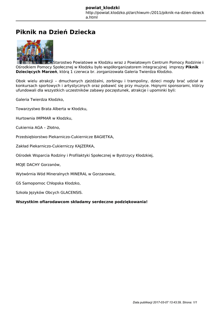 powiat_klodzki http://powiat.klodzko.pl/archiwum-/2011/piknik-na-dzien-dzieck a.html Piknik na Dzień Dziecka Starostwo Powiatowe w Kłodzku wraz z Powiatowym Centrum Pomocy Rodzinie i Ośrodkiem Pomocy Społecznej w Kłodzku było współorganizatorem integracyjnej imprezy Piknik Dziecięcych Marzeń, którą 1 czerwca br. zorganizowała Galeria Twierdza Kłodzko. Obok wielu atrakcji – dmuchanych zjeżdżalni, zorbingu i trampoliny, dzieci mogły brać udział w konkursach sportowych i artystycznych oraz pobawić się przy muzyce. Hojnymi sponsorami, którzy ufundowali dla wszystkich uczestników zabawy poczęstunek, atrakcje i upominki byli: Galeria Twierdza Kłodzko, Towarzystwo Brata Alberta w Kłodzku, Hurtownia IMPMAR w Kłodzku, Cukiernia AGA – Złotno, Przedsiębiorstwo Piekarniczo-Cukiernicze BAGIETKA, Zakład Piekarniczo-Cukierniczy KAJZERKA, Ośrodek Wsparcia Rodziny i Profilaktyki Społecznej w Bystrzycy Kłodzkiej, MOJE DACHY Gorzanów, Wytwórnia Wód Mineralnych MINERAL w Gorzanowie, GS Samopomoc Chłopska Kłodzko, Szkoła Języków Obcych GLACENSIS. Wszystkim ofiarodawcom składamy serdeczne podziękowania! Data publikacji 2017-03-07 13:43:39, Strona: 1/1