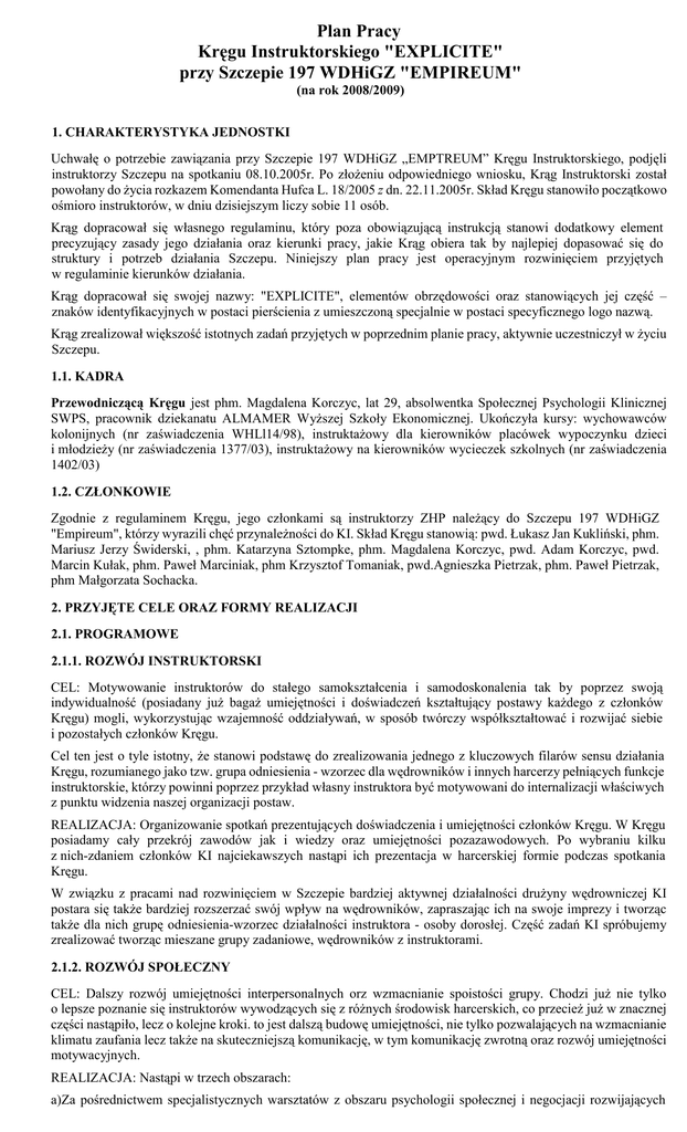 Plan Pracy Kręgu Instruktorskiego "EXPLICITE" przy Szczepie 197 WDHiGZ "EMPIREUM" (na rok 2008/2009) 1. CHARAKTERYSTYKA JEDNOSTKI Uchwałę o potrzebie zawiązania przy Szczepie 197 WDHiGZ „EMPTREUM” Kręgu Instruktorskiego, podjęli instruktorzy Szczepu na spotkaniu 08.10.2005r. Po złoŜeniu odpowiedniego wniosku, Krąg Instruktorski został powołany do Ŝycia rozkazem Komendanta Hufca L. 18/2005 z dn. 22.11.2005r. Skład Kręgu stanowiło początkowo ośmioro instruktorów, w dniu dzisiejszym liczy sobie 11 osób. Krąg dopracował się własnego regulaminu, który poza obowiązującą instrukcją stanowi dodatkowy element precyzujący zasady jego działania oraz kierunki pracy, jakie Krąg obiera tak by najlepiej dopasować się do struktury i potrzeb działania Szczepu. Niniejszy plan pracy jest operacyjnym rozwinięciem przyjętych w regulaminie kierunków działania. Krąg dopracował się swojej nazwy: "EXPLICITE", elementów obrzędowości oraz stanowiących jej część – znaków identyfikacyjnych w postaci pierścienia z umieszczoną specjalnie w postaci specyficznego logo nazwą. Krąg zrealizował większość istotnych zadań przyjętych w poprzednim planie pracy, aktywnie uczestniczył w Ŝyciu Szczepu. 1.1. KADRA Przewodniczącą Kręgu jest phm. Magdalena Korczyc, lat 29, absolwentka Społecznej Psychologii Klinicznej SWPS, pracownik dziekanatu ALMAMER WyŜszej Szkoły Ekonomicznej. Ukończyła kursy: wychowawców kolonijnych (nr zaświadczenia WHLl14/98), instruktaŜowy dla kierowników placówek wypoczynku dzieci i młodzieŜy (nr zaświadczenia 1377/03), instruktaŜowy na kierowników wycieczek szkolnych (nr zaświadczenia 1402/03) 1.2. CZŁONKOWIE Zgodnie z regulaminem Kręgu, jego członkami są instruktorzy ZHP naleŜący do Szczepu 197 WDHiGZ "Empireum", którzy wyrazili chęć przynaleŜności do KI. Skład Kręgu stanowią: pwd. Łukasz Jan Kukliński, phm. Mariusz Jerzy Świderski, , phm. Katarzyna Sztompke, phm. Magdalena Korczyc, pwd. Adam Korczyc, pwd. Marcin Kułak, phm. Paweł Marciniak, phm Krzysztof Tomaniak, pwd.Agnieszka Pietrzak, phm. Paweł Pietrzak, phm Małgorzata Sochacka. 2. PRZYJĘTE CELE ORAZ FORMY REALIZACJI 2.1. PROGRAMOWE 2.1.1. ROZWÓJ INSTRUKTORSKI CEL: Motywowanie instruktorów do stałego samokształcenia i samodoskonalenia tak by poprzez swoją indywidualność (posiadany juŜ bagaŜ umiejętności i doświadczeń kształtujący postawy kaŜdego z członków Kręgu) mogli, wykorzystując wzajemność oddziaływań, w sposób twórczy współkształtować i rozwijać siebie i pozostałych członków Kręgu. Cel ten jest o tyle istotny, Ŝe stanowi podstawę do zrealizowania jednego z kluczowych filarów sensu działania Kręgu, rozumianego jako tzw. grupa odniesienia - wzorzec dla wędrowników i innych harcerzy pełniących funkcje instruktorskie, którzy powinni poprzez przykład własny instruktora być motywowani do internalizacji właściwych z punktu widzenia naszej organizacji postaw. REALIZACJA: Organizowanie spotkań prezentujących doświadczenia i umiejętności członków Kręgu. W Kręgu posiadamy cały przekrój zawodów jak i wiedzy oraz umiejętności pozazawodowych. Po wybraniu kilku z nich-zdaniem członków KI najciekawszych nastąpi ich prezentacja w harcerskiej formie podczas spotkania Kręgu. W związku z pracami nad rozwinięciem w Szczepie bardziej aktywnej działalności druŜyny wędrowniczej KI postara się takŜe bardziej rozszerzać swój wpływ na wędrowników, zapraszając ich na swoje imprezy i tworząc takŜe dla nich grupę odniesienia-wzorzec działalności instruktora - osoby dorosłej. Część zadań KI spróbujemy zrealizować tworząc mieszane grupy zadaniowe, wędrowników z instruktorami. 2.1.2. ROZWÓJ SPOŁECZNY CEL: Dalszy rozwój umiejętności interpersonalnych orz wzmacnianie spoistości grupy. Chodzi juŜ nie tylko o lepsze poznanie się instruktorów wywodzących się z róŜnych środowisk harcerskich, co przecieŜ juŜ w znacznej części nastąpiło, lecz o kolejne kroki. to jest dalszą budowę umiejętności, nie tylko pozwalających na wzmacnianie klimatu zaufania lecz takŜe na skuteczniejszą komunikację, w tym komunikację zwrotną oraz rozwój umiejętności motywacyjnych. REALIZACJA: Nastąpi w trzech obszarach: a)Za pośrednictwem specjalistycznych warsztatów z obszaru psychologii społecznej i negocjacji rozwijających umiejętności komunikacji, motywowania, budowy klimatu w grupie. asertywności oraz negocjacji (pierwsze zajęcia miały juŜ miejsce w 2007 r.); b)Nadal poprzez mieszanie grup zadaniowych Kręgu tak by dawać poznać się w działaniu osobom dotąd mniej ze sobą współpracującym; c) Dodatkowo, poza stricte harcerskimi, organizowane będą spotkania o charakterze nieformalnym-towarzyskim (domowe pokazy filmów, wyjścia do teatru, gry towarzyskie, etc). 2.1.3. SZKOLENIE I PROMOWANIE METODY CEL: Promowanie wzorców postępowania harcerza oraz instruktora jak teŜ prezentowanie standardów dobrego działania (metodycznego, interpersonalnego, organizacji zajęć) jakie instruktorzy Szczepu uznają za tzw. "poziom dobrej praktyki" w ramach szczepu. REALIZACJA: Temat jest bardzo szeroki i z pewnością nie do całościowego zrealizowania w horyzoncie krótkookresowym. Stąd, w nadchodzącym roku nastąpi kontynuacja działania polegającego na skupianiu się na elementach, stanowiących takie przykłady „dobrych praktyk”. Działania te będą rozwijane w latach następnych. Realizacja nastąpi między innymi poprzez włączanie wędrowników i harcerzy pełniących funkcje statutowe w działania KI, tak by pozytywnie, w sposób naturalny przyswajali właściwe wzorce. W celu wzmocnienia oddziaływania tych bodźców, działanie w ramach KI będzie promowane jako coś o charakterze ekskluzywnym, to znaczy nie zawsze dostępnym dla nie instruktorów. To co niedostępne zazwyczaj kojarzone jest bowiem jako coś bardziej atrakcyjnego - posiadającego 
