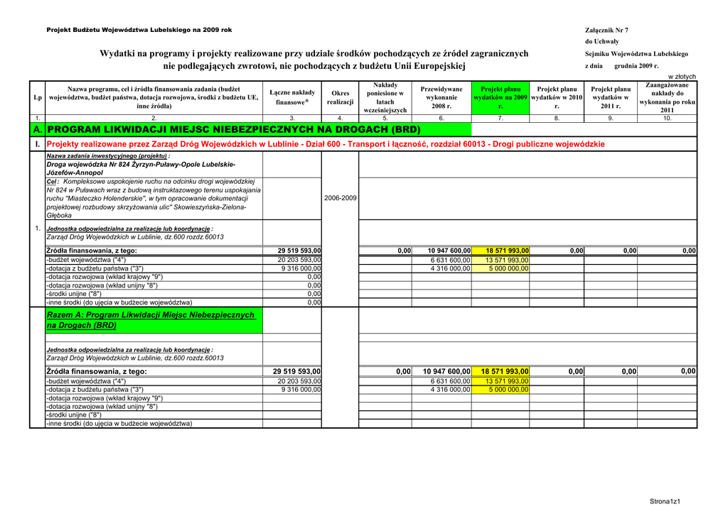 I. Projekty realizowane przez Zarząd Dróg Wojewódzkich w Lublinie - Dział 600 - Transport i łączność, rozdział 60013 - Drogi publiczne wojewódzkie