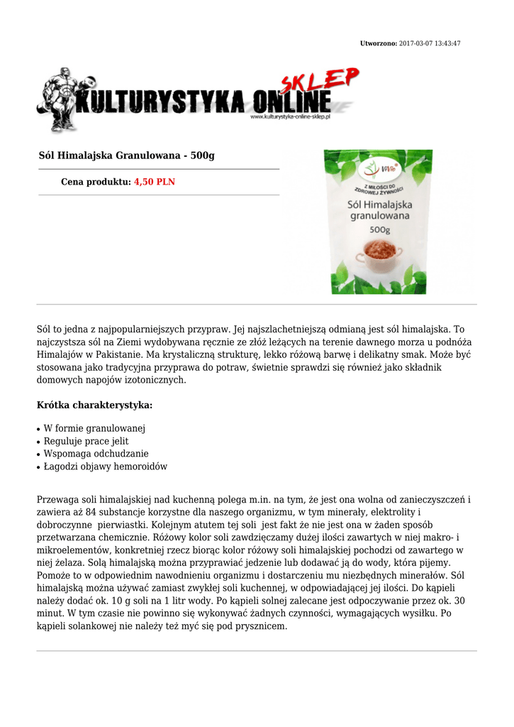 Utworzono: 2017-03-07 13:43:47 Sól Himalajska Granulowana - 500g Cena produktu: 4,50 PLN Sól to jedna z najpopularniejszych przypraw. Jej najszlachetniejszą odmianą jest sól himalajska. To najczystsza sól na Ziemi wydobywana ręcznie ze złóż leżących na terenie dawnego morza u podnóża Himalajów w Pakistanie. Ma krystaliczną strukturę, lekko różową barwę i delikatny smak. Może być stosowana jako tradycyjna przyprawa do potraw, świetnie sprawdzi się również jako składnik domowych napojów izotonicznych. Krótka charakterystyka: ● ● ● ● W formie granulowanej Reguluje prace jelit Wspomaga odchudzanie Łagodzi objawy hemoroidów Przewaga soli himalajskiej nad kuchenną polega m.in. na tym, że jest ona wolna od zanieczyszczeń i zawiera aż 84 substancje korzystne dla naszego organizmu, w tym minerały, elektrolity i dobroczynne pierwiastki. Kolejnym atutem tej soli jest fakt że nie jest ona w żaden sposób przetwarzana chemicznie. Różowy kolor soli zawdzięczamy dużej ilości zawartych w niej makro- i mikroelementów, konkretniej rzecz biorąc kolor różowy soli himalajskiej pochodzi od zawartego w niej żelaza. Solą himalajską można przyprawiać jedzenie lub dodawać ją do wody, która pijemy. Pomoże to w odpowiednim nawodnieniu organizmu i dostarczeniu mu niezbędnych minerałów. Sól himalajską można używać zamiast zwykłej soli kuchennej, w odpowiadającej jej ilości. Do kąpieli należy dodać ok. 10 g soli na 1 litr wody. Po kąpieli solnej zalecane jest odpoczywanie przez ok. 30 minut. W tym czasie nie powinno się wykonywać żadnych czynności, wymagających wysiłku. Po kąpieli solankowej nie należy też myć się pod prysznicem. Adres: http://www.ko.sklep.pl/ Telefon: kom. 782 010 880 Email: [email protected]