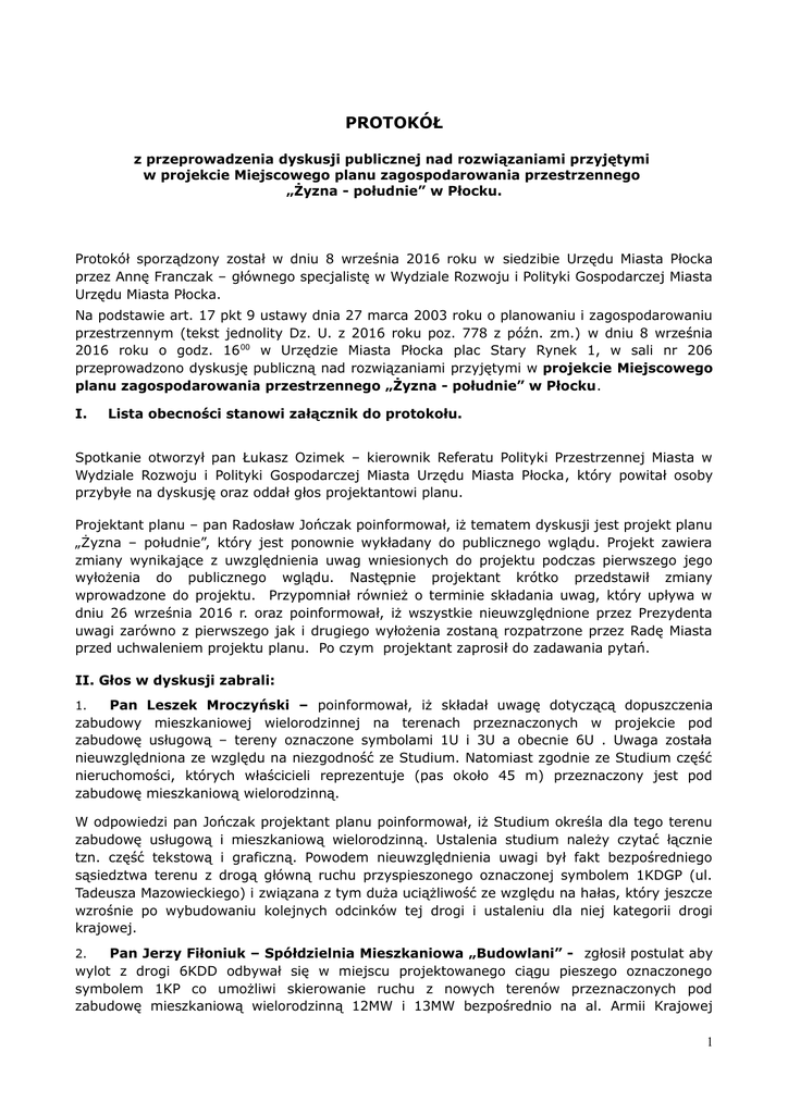 PROTOKÓŁ z przeprowadzenia dyskusji publicznej nad rozwiązaniami przyjętymi w projekcie Miejscowego planu zagospodarowania przestrzennego „Żyzna - południe” w Płocku. Protokół sporządzony został w dniu 8 września 2016 roku w siedzibie Urzędu Miasta Płocka przez Annę Franczak – głównego specjalistę w Wydziale Rozwoju i Polityki Gospodarczej Miasta Urzędu Miasta Płocka. Na podstawie art. 17 pkt 9 ustawy dnia 27 marca 2003 roku o planowaniu i zagospodarowaniu przestrzennym (tekst jednolity Dz. U. z 2016 roku poz. 778 z późn. zm.) w dniu 8 września 2016 roku o godz. 1600 w Urzędzie Miasta Płocka plac Stary Rynek 1, w sali nr 206 przeprowadzono dyskusję publiczną nad rozwiązaniami przyjętymi w projekcie Miejscowego planu zagospodarowania przestrzennego „Żyzna - południe” w Płocku. I. Lista obecności stanowi załącznik do protokołu. Spotkanie otworzył pan Łukasz Ozimek – kierownik Referatu Polityki Przestrzennej Miasta w Wydziale Rozwoju i Polityki Gospodarczej Miasta Urzędu Miasta Płocka, który powitał osoby przybyłe na dyskusję oraz oddał głos projektantowi planu. Projektant planu – pan Radosław Jończak poinformował, iż tematem dyskusji jest projekt planu „Żyzna – południe”, który jest ponownie wykładany do publicznego wglądu. Projekt zawiera zmiany wynikające z uwzględnienia uwag wniesionych do projektu podczas pierwszego jego wyłożenia do publicznego wglądu. Następnie projektant krótko przedstawił zmiany wprowadzone do projektu. Przypomniał również o terminie składania uwag, który upływa w dniu 26 września 2016 r. oraz poinformował, iż wszystkie nieuwzględnione przez Prezydenta uwagi zarówno z pierwszego jak i drugiego wyłożenia zostaną rozpatrzone przez Radę Miasta przed uchwaleniem projektu planu. Po czym projektant zaprosił do zadawania pytań. II. Głos w dyskusji zabrali: Pan Leszek Mroczyński – poinformował, iż składał uwagę dotyczącą dopuszczenia zabudowy mieszkaniowej wielorodzinnej na terenach przeznaczonych w projekcie pod zabudowę usługową – tereny oznaczone symbolami 1U i 3U a obecnie 6U . Uwaga została nieuwzględniona ze względu na niezgodność ze Studium. Natomiast zgodnie ze Studium część nieruchomości, których właścicieli reprezentuje (pas około 45 m) przeznaczony jest pod zabudowę mieszkaniową wielorodzinną. 1. W odpowiedzi pan Jończak projektant planu poinformował, iż Studium określa dla tego terenu zabudowę usługową i mieszkaniową wielorodzinną. Ustalenia studium należy czytać łącznie tzn. część tekstową i graficzną. Powodem nieuwzględnienia uwagi był fakt bezpośredniego sąsiedztwa terenu z drogą główną ruchu przyspieszonego oznaczonej symbolem 1KDGP (ul. Tadeusza Mazowieckiego) i związana z tym duża uciążliwość ze względu na hałas, który jeszcze wzrośnie po wybudowaniu kolejnych odcinków tej drogi i ustaleniu dla niej kategorii drogi krajowej. Pan Jerzy Fiłoniuk – Spółdzielnia Mieszkaniowa „Budowlani” - zgłosił postulat aby wylot z drogi 6KDD odbywał się w miejscu projektowanego ciągu pieszego oznaczonego symbolem 1KP co umożliwi skierowanie ruchu z nowych terenów przeznaczonych pod zabudowę mieszkaniową wielorodzinną 12MW i 13MW bezpośrednio na al. Armii Krajowej 2. 1 zamiast wprowadzania go w istniejące osiedle zabudowy mieszkaniowej. Utworzenie drogi dojazdowej w miejscu projektowanego ciągu pieszego wpisuje się także w istniejące skrzyżowanie al. Armii Krajowej z ulicą po przeciwległej stronie. Pan Fiłoniuk sugeruje przeniesienie ciągu pieszego 1KP w miejsce ulicy oznaczonej symbolem 7KDD. W odpowiedzi pan Jończak wyjaśnił, iż projekt planu zakłada, że nowe tereny zabudowy mieszkaniowej wielorodzinnej obsługiwane będą przez projektowaną drogę 6KDL i jej połączenie z drogami 7KDL i 1KDZ z pominięciem istniejącego układu drogowego (ulica 8KDD). Stąd wyższa klasa techniczna tych dróg. Poinformował również, iż al. Armii Krajowej w obecnie obowiązującym Miejscowym planie zagospodarowania osiedla Podolszyce Północ została sklasyfikowana jako droga zbiorcza, dla których obowiązują normatywy określające minimalne odległości pomiędzy skrzyżowaniami. Dodał również, iż ciąg pieszy 1KP ustalony był również w obecnie obowiązującym planie miejscowym. Na zakończenie poinformował, iż propozycja zgłoszona przez Pana Filoniuka jest oczywiście do rozważenia. Panowie Bronikowscy – są właścicielami budynku przy al. Armii Krajowej 42 zlokalizowanego na terenie 15MW. Zgłaszają podobny problem jak ich przedmówca. Ich zdaniem proponowany przebieg drogi 6KDD jest nietypowy i skomplikowany i narusza wiele interesów. Proponują, podobnie jak Pan Fiłoniuk, dla nowo projektowanego fragmentu drogi 6KDD bezpośredni dostęp do al. Armii Krajowej w miejscu projektowanego ciągu 1KP. W przypadku likwidacji drogi 7KDD nie będą wnosić sprzeciwu. 3. W odpowiedzi – Pan Ozimek poinformował, iż wszystkie uwagi należy wnosić na piśmie w terminie do 26 września . 4. • Pan Leszek Mroczyński – poruszył zagadnienia dotyczące: Wyjaśnienia zakazu lokalizacji obiektów stanowiących źródło żerowania ptaków – jakich obiektów dotyczy ten zakaz? Projektant wyjaśnił, iż zamieszczenie tego ustalenia w projekcie planu wynika z treści wniosku zgłoszonego przez Prezesa Urzędu Lotnictwa Cywilnego, a jego zamieszczenie w treści projektu planu było warunkiem jego uzgodnienia. • Sprawdzenia przyjętych szerokości stref od rurociągów naftowych, gdyż jego zdaniem minimalna szerokość strefy powinna wynosić 12 m a nie 16 m. Projektant poinformował, że szerokości stref zostały określone przez zarządcę sieci. Przyjęte wartości wynikają także z rozporządzenia w sprawie warunków technicznych, jakim powinny odpowiadać bazy i stacje paliw płynnych, rurociągi przesyłowe dalekosiężne służące do transportu ropy naftowej