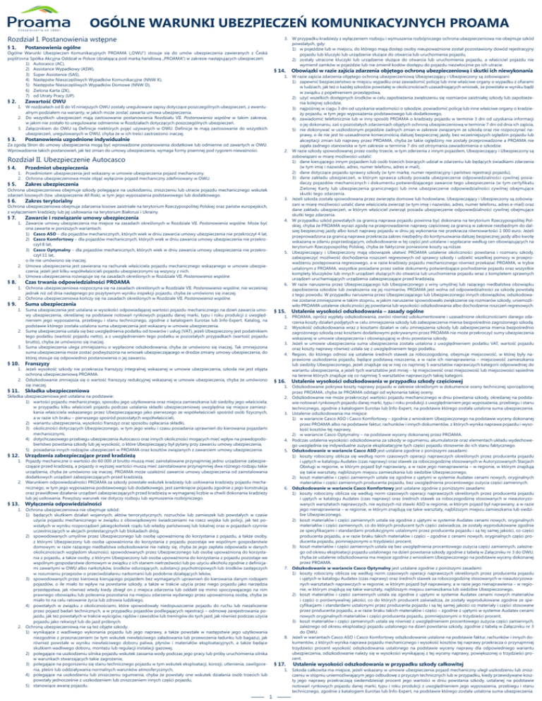 OGÓLNE WARUNKI UBEZPIECZEŃ KOMUNIKACYJNYCH PROAMA Rozdział I. Postanowienia wstępne § 1. 3. W przypadku kradzieży z wyłączeniem rozboju i wymuszenia rozbójniczego ochrona ubezpieczeniowa nie obejmuje szkód powstałych, gdy: 1) w pojeździe lub w miejscu, do którego mają dostęp osoby nieupoważnione został pozostawiony dowód rejestracyjny pojazdu lub kluczyki lub urządzenie służące do otwarcia lub uruchomienia pojazdu, 2) zostały utracone kluczyki lub urządzenie służące do otwarcia lub uruchomienia pojazdu, a właściciel pojazdu nie wymienił zamków w pojeździe lub nie zmienił kodów dostępu do pojazdu niezwłocznie po ich utracie. Postanowienia ogólne Ogólne Warunki Ubezpieczeń Komunikacyjnych PROAMA („OWU”) stosuje się do umów ubezpieczenia zawieranych z Česká pojišťovna Spółka Akcyjna Oddział w Polsce (działającą pod marką handlową „PROAMA”) w zakresie następujących ubezpieczeń: 1) Autocasco (AC), 2) Assistance Wypadkowy (ASW), 3) Super Assistance (SAS), 4) Następstw Nieszczęśliwych Wypadków Komunikacyjne (NNW K), 5) Następstw Nieszczęśliwych Wypadków Domowe (NNW D), 6) Zielona Karta (ZK), 7) od Utraty Pracy (UP). § 2. § 3. Zawartość OWU 1. W rozdziałach od II do VI niniejszych OWU zostały uregulowane zapisy dotyczące poszczególnych ubezpieczeń, z ewentualnym podziałem na warianty, w jakich może zostać zawarta umowa ubezpieczenia. 2. Do wszystkich ubezpieczeń mają zastosowanie postanowienia Rozdziału VII. Postanowienia wspólne w takim zakresie, w jakim nie zostało to uregulowane odmiennie w Rozdziałach dotyczących poszczególnych ubezpieczeń. 3. Załącznikiem do OWU są Definicje niektórych pojęć używanych w OWU. Definicje te mają zastosowanie do wszystkich ubezpieczeń, uregulowanych w OWU, chyba że w ich treści zastrzeżono inaczej. Postanowienia uzgodnione indywidualnie Rozdział II. Ubezpieczenie Autocasco § 5. Przedmiot ubezpieczenia 1. Przedmiotem ubezpieczenia jest wskazany w umowie ubezpieczenia pojazd mechaniczny. 2. Ochrona ubezpieczeniowa może objąć wyłącznie pojazd mechaniczny zdefiniowany w OWU. Zakres ubezpieczenia Ochrona ubezpieczeniowa obejmuje szkody polegające na uszkodzeniu, zniszczeniu lub utracie pojazdu mechanicznego wskutek zdarzeń losowych (tzw. ubezpieczenie All Risk), w tym jego wyposażenia podstawowego lub dodatkowego. § 6. Zakres terytorialny Ochrona ubezpieczeniowa obejmuje zdarzenia losowe zaistniałe na terytorium Rzeczypospolitej Polskiej oraz państw europejskich, z wyłączeniem kradzieży lub jej usiłowania na terytorium Białorusi i Ukrainy. § 7. § 8. § 9. Zawarcie i rozwiązanie umowy ubezpieczenia 1. Zawarcie umowy ubezpieczenia ma miejsce na zasadach określonych w Rozdziale VII. Postanowienia wspólne. Może być ona zawarta w poniższych wariantach: 1) Casco ASO – dla pojazdów mechanicznych, których wiek w dniu zawarcia umowy ubezpieczenia nie przekroczył 4 lat, 2) Casco Komfortowy – dla pojazdów mechanicznych, których wiek w dniu zawarcia umowy ubezpieczenia nie przekroczył 8 lat, 3) Casco Optymalny – dla pojazdów mechanicznych, których wiek w dniu zawarcia umowy ubezpieczenia nie przekroczył 11 lat, o ile nie umówiono się inaczej. 2. Umowa ubezpieczenia jest zawierana na rachunek właściciela pojazdu mechanicznego wskazanego w umowie ubezpieczenia; jeżeli jest kilku współwłaścicieli pojazdu ubezpieczonymi są wszyscy z nich. 3. Umowa ubezpieczenia rozwiązuje się na zasadach określonych w Rozdziale VII. Postanowienia wspólne. Czas trwania odpowiedzialności PROAMA 1. Ochrona ubezpieczeniowa rozpoczyna się na zasadach określonych w Rozdziale VII. Postanowienia wspólne, nie wcześniej jednak niż od dnia następnego po pozytywnym wyniku inspekcji pojazdu, chyba że umówiono się inaczej. 2. Ochrona ubezpieczeniowa kończy się na zasadach określonych w Rozdziale VII. Postanowienia wspólne. Suma ubezpieczenia 1. Suma ubezpieczenia jest ustalana w wysokości odpowiadającej wartości pojazdu mechanicznego na dzień zawarcia umowy ubezpieczenia, określanej na podstawie notowań rynkowych pojazdu danej marki, typu i roku produkcji z uwzględnieniem jego wyposażenia, przebiegu i stanu technicznego, zgodnie z katalogiem Eurotax lub Info-Expert. Katalog, na podstawie którego została ustalona suma ubezpieczenia jest wskazany w umowie ubezpieczenia. 2. Sumę ubezpieczenia ustala się bez uwzględnienia podatku od towarów i usług (VAT), jeżeli Ubezpieczony jest podatnikiem tego podatku (wartość pojazdu netto), a z uwzględnieniem tego podatku w pozostałych przypadkach (wartość pojazdu brutto), chyba że umówiono się inaczej. 3. Suma ubezpieczenia ulega zmniejszeniu o wypłacone odszkodowania, chyba że umówiono się inaczej. Tak zmniejszona suma ubezpieczenia może zostać podwyższona na wniosek ubezpieczającego w drodze zmiany umowy ubezpieczenia, do której stosuje się odpowiednio postanowienia o jej zawarciu. § 10. Franszyzy § 11. Składka ubezpieczeniowa § 12. Urządzenia zabezpieczające przed kradzieżą § 13. Wyłączenia odpowiedzialności Obowiązki w razie zajścia zdarzenia objętego ochroną ubezpieczeniową i skutki ich niewykonania § 15. Ustalenie wysokości odszkodowania – zasady ogólne § 16. Ustalenie wysokości odszkodowania w przypadku szkody częściowej § 17. Ustalenie wysokości odszkodowania w przypadku szkody całkowitej 1. W razie zajścia zdarzenia objętego ochroną ubezpieczeniową Ubezpieczający i Ubezpieczony są zobowiązani: 1) zapewnić bezpieczeństwo w miejscu wypadku oraz zawiadomić policję lub inne właściwe organy o wypadku z ofiarami w ludziach, jak też o każdej szkodzie powstałej w okolicznościach uzasadniających wniosek, że powstała w wyniku bądź w związku z popełnieniem przestępstwa, 2) użyć wszelkich dostępnych środków w celu zapobieżenia zwiększeniu się rozmiarów zaistniałej szkody lub zapobieżenia kolejnej szkodzie, 3) n
