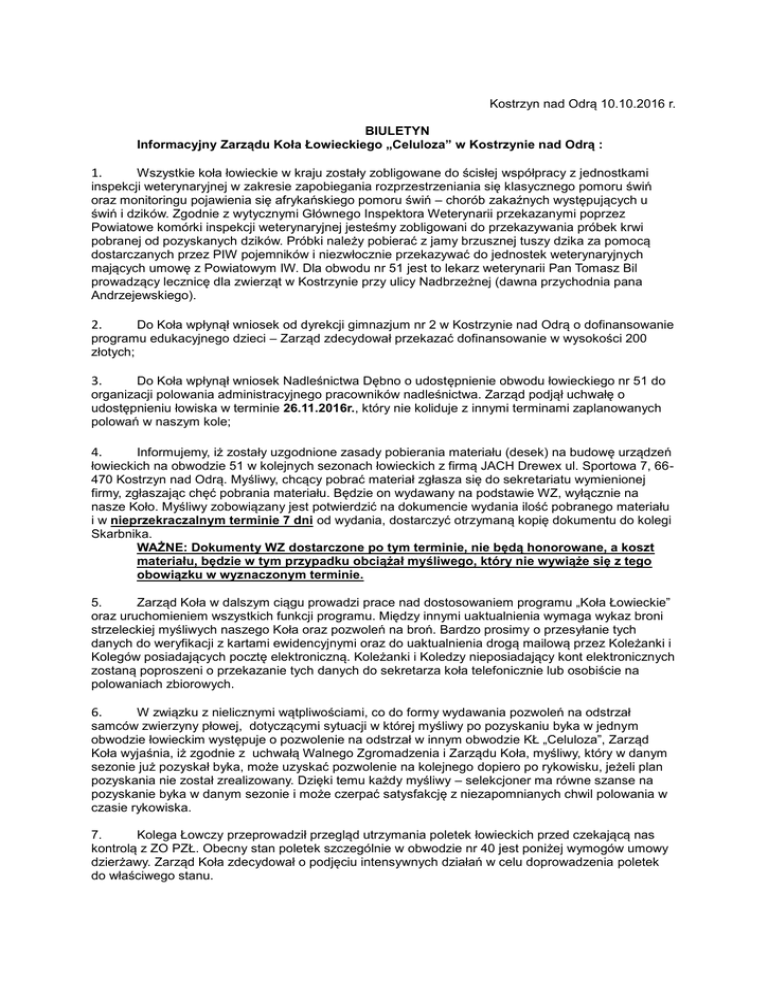Kostrzyn nad Odrą 10.10.2016 r. BIULETYN Informacyjny Zarządu Koła Łowieckiego „Celuloza” w Kostrzynie nad Odrą : Wszystkie koła łowieckie w kraju zostały zobligowane do ścisłej współpracy z jednostkami inspekcji weterynaryjnej w zakresie zapobiegania rozprzestrzeniania się klasycznego pomoru świń oraz monitoringu pojawienia się afrykańskiego pomoru świń – chorób zakaźnych występujących u świń i dzików. Zgodnie z wytycznymi Głównego Inspektora Weterynarii przekazanymi poprzez Powiatowe komórki inspekcji weterynaryjnej jesteśmy zobligowani do przekazywania próbek krwi pobranej od pozyskanych dzików. Próbki należy pobierać z jamy brzusznej tuszy dzika za pomocą dostarczanych przez PIW pojemników i niezwłocznie przekazywać do jednostek weterynaryjnych mających umowę z Powiatowym IW. Dla obwodu nr 51 jest to lekarz weterynarii Pan Tomasz Bil prowadzący lecznicę dla zwierząt w Kostrzynie przy ulicy Nadbrzeżnej (dawna przychodnia pana Andrzejewskiego). 1. Do Koła wpłynął wniosek od dyrekcji gimnazjum nr 2 w Kostrzynie nad Odrą o dofinansowanie programu edukacyjnego dzieci – Zarząd zdecydował przekazać dofinansowanie w wysokości 200 złotych; 2. Do Koła wpłynął wniosek Nadleśnictwa Dębno o udostępnienie obwodu łowieckiego nr 51 do organizacji polowania administracyjnego pracowników nadleśnictwa. Zarząd podjął uchwałę o udostępnieniu łowiska w terminie 26.11.2016r., który nie koliduje z innymi terminami zaplanowanych polowań w naszym kole; 3. Informujemy, iż zostały uzgodnione zasady pobierania materiału (desek) na budowę urządzeń łowieckich na obwodzie 51 w kolejnych sezonach łowieckich z firmą JACH Drewex ul. Sportowa 7, 66470 Kostrzyn nad Odrą. Myśliwy, chcący pobrać materiał zgłasza się do sekretariatu wymienionej firmy, zgłaszając chęć pobrania materiału. Będzie on wydawany na podstawie WZ, wyłącznie na nasze Koło. Myśliwy zobowiązany jest potwierdzić na dokumencie wydania ilość pobranego materiału i w nieprzekraczalnym terminie 7 dni od wydania, dostarczyć otrzymaną kopię dokumentu do kolegi Skarbnika. WAŻNE: Dokumenty WZ dostarczone po tym terminie, nie będą honorowane, a koszt materiału, będzie w tym przypadku obciążał myśliwego, który nie wywiąże się z tego obowiązku w wyznaczonym terminie. 4. 5. Zarząd Koła w dalszym ciągu prowadzi prace nad dostosowaniem programu „Koła Łowieckie” oraz uruchomieniem wszystkich funkcji programu. Między innymi uaktualnienia wymaga wykaz broni strzeleckiej myśliwych naszego Koła oraz pozwoleń na broń. Bardzo prosimy o przesyłanie tych danych do weryfikacji z kartami ewidencyjnymi oraz do uaktualnienia drogą mailową przez Koleżanki i Kolegów posiadających pocztę elektroniczną. Koleżanki i Koledzy nieposiadający kont elektronicznych zostaną poproszeni o przekazanie tych danych do sekretarza koła telefonicznie lub osobiście na polowaniach zbiorowych. W związku z nielicznymi wątpliwościami, co do formy wydawania pozwoleń na odstrzał samców zwierzyny płowej, dotyczącymi sytuacji w której myśliwy po pozyskaniu byka w jednym obwodzie łowieckim występuje o pozwolenie na odstrzał w innym obwodzie KŁ „Celuloza”, Zarząd Koła wyjaśnia, iż zgodnie z uchwałą Walnego Zgromadzenia i Zarządu Koła, myśliwy, który w danym sezonie już pozyskał byka, może uzyskać pozwolenie na kolejnego dopiero po rykowisku, jeżeli plan pozyskania nie został zrealizowany. Dzięki temu każdy myśliwy – selekcjoner ma równe szanse na pozyskanie byka w danym sezonie i może czerpać satysfakcję z niezapomnianych chwil polowania w czasie rykowiska. 6. 7. Kolega Łowczy przeprowadził przegląd utrzymania poletek łowieckich przed czekającą nas kontrolą z ZO PZŁ. Obecny stan poletek szczególnie w obwodzie nr 40 jest poniżej wymogów umowy dzierżawy. Zarząd Koła zdecydował o podjęciu intensywnych działań w celu doprowadzenia poletek do właściwego stanu. 8. Zarząd Koła ustalił zasady obiegu dokumentów w Kole. Ustalono, że wszelkie dokumenty (protokoły z wykonanych prac, faktury, rachunki) myśliwi mają dostarczać do Kolegi Skarbnika lub przesyłać na adres siedziby Koła. Protokoły pobrania zwierzyny na użytek własny należy wykonać w 2 egzemplarzach. W minionym tygodniu odbyła się narada dla prezesów i łowczych kół łowieckich podległych pod ZO PZŁ w Gorzowie na której były omawiane między innymi zagrożenie ASF i podjęte działania w tej sprawie oraz zmiany w ustawie prawo łowieckie. 9. 10. Zarząd Koła informuje, że wszelkie wydatki ze środków budżetowych Koła ponoszone przez myśliwych muszą być uprzednio konsultowane telefonicznie z Kolegą Skarbnikiem. Przed dokonaniem zakupu czy wynajęcia usług związanych ze statutową działalnością Koła bardzo prosimy kontaktować się z Kolegą Stanisławem Żuławą. 11. Zarząd Koła podjął uchwałę o zaliczeniu stażu kandydackiego do PZŁ w naszym Kole Koledze Danielowi Janiakowi oraz skierowaniu go na kurs i egzamin w celu zdobycia podstawowych uprawnień łowieckich w ZO PZŁ w Gorzowie. Zarząd składa podziękowania naszemu byłemu stażyście za zaangażowanie w życie Koła przez rok stażu. Szczególne podziękowania składamy Koledze Zbyszkowi Góreckiemu – opiekunowi stażu za trud i wysiłek włożony w naukę, przygotowanie oraz wprowadzenie w tajniki zasad, tradycji łowieckich Kolegi Daniela. 12. Zarząd Koła podjął uchwałę w sprawie powołania komisji celem przeprowadzenia inwentaryzacji i wyceny całego mienia Koła, likwidacji i wybrakowania mienia uszkodzonego i zbędnego. W skład komisji będą wchodzili przedstawiciele Zarządu Koła, Komisji Rewizyjnej, gospodarze łowisk oraz inne osoby według potrzeb. Szczegóły zostaną dopracowane i przekazane zainteresowanym Koleżankom i Kolegom w najbliższym czasie. 13. Harmonogram oceny prawidłowości odstrzału saren rogaczy: Ocen