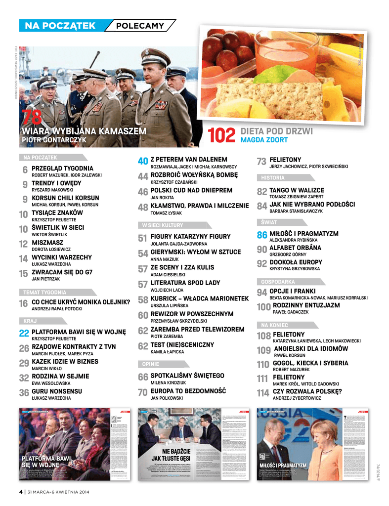 NA POCZĄTEK POLECAMY FOT. SHUTT ERSTO CK FOT. EAST NEWS/KAROL SZCZECINSKI 78 T POD D DRZWI DRZWI 102 DIETA WIARA WYBIJANA KAMASZEM MAGDA ZDORT PIOTR GONTARCZYK [ NA POCZĄTEK 6 9 9 TRENDY I OWĘDY KORSUN CHILI KORSUN 10 ŚWIETLIK W SIECI 12 MISZMASZ 14 WYCINKI WARZECHY 22 51 DOROTA ŁOSIEWICZ ŁUKASZ WARZECHA ZWRACAM SIĘ DO G7 JAN PIETRZAK [ CO CHCE UKRYĆ MONIKA OLEJNIK? ANDRZEJ RAFAŁ POTOCKI PLATFORMA BAWI SIĘ W WOJNĘ KRZYSZTOF FEUSETTE ADAM CIESIELSKI 57 WOJCIECH LADA OPCJE I FRANKI – WŁADCA MARIONETEK 58 KUBRICK URSZULA LIPIŃSKA 110 SPOTKALIŚMY ŚWIĘTEGO 66 MILENA KINDZIUK KRAJ EUROPA TO BEZDOMNOŚĆ JAN POLKOWSKI ANDRZEJ ZYBERTOWICZ CZY ROZWALA POLSKĘ? PARYŻ–BERLIN–MOSKWA T Zobaczył pan ten problem dopiero od środka po tym, jak został pan europosłem? Tak było. Uderzył mnie ten brak problematyki wolności wiary i przekonań zarówno w zewnętrznej aktywności UE, jak i w trakcie debat w Parlamencie Europejskim. A przecież wiemy z raportów wielu organizacji i instytucji, że prześladowanie chrześcijan jest bardzo poważnym problemem międzynarodowym. A w Brukseli i Strasburgu milczano na ten temat! Milczano całkowicie. NIE BĄDŹCIE JAK TŁUSTE GĘSI 40 | 31 MARCA–6 KWIETNIA 2014 Jak pan osobiście doszedł do swojej wiary? Urodziłem się i wychowałem w rodzinie chrześcijańskiej, za co codziennie dziękuję Bogu. Każdego dnia czytaliśmy Pismo Święte. Jestem protestantem, ale współpracuję w europarlamencie z katolikami z Prawa i Sprawiedliwości, z prezbiterianami, ze wszystkimi, którzy mówią „tak” Jezusowi Chrystusowi i którzy chcą go naśladować. Pan jest w polityce od wielu, wielu lat. Byłem członkiem parlamentu w Hadze w 1976 r. i już wówczas poświęcałem zagadnieniu wolności przekonań najwięcej czasu i wysiłku. W roku 2009 po raz pierwszy zostałem wybrany do Parlamentu Europejskiego. I uderzyło mnie wówczas, że w wielu debatach przywoływano zagadnienie praw człowieka, praw jed- Uzależnić niedźwiedzia To znaczy? Byłem swego czasu członkiem komisji ds. transportu. Siedziałem obok eurodeputowanego z Francji. Przed głosowaniem zaczął czegoś intensywnie szukać w swojej torbie. W końcu znalazł. Wyjął kartkę z instrukcją głosowania, z nagłówkiem: „Ministerstwo Transportu Republiki Francuskiej, Paryż”. Więc europejskość tego europosła była fikcją. Rozmawiając o chadekach, o Europejskiej Partii Ludowej pamiętajmy też, że to bardzo odmienni ludzie, których niewiele łączy, a na pewno nie są to wartości chrześcijańskie. ALEKSANDRA RYBIŃSKA dziennikarka MIŁOŚĆ I PRAGMATYZM Na przykład niemiecka CDU to już nie jest partia chrześcijańska? Powiedziałbym, że chrześcijański charakter zachowuje wciąż bawarska CSU. Koledzy z tego ugrupowania są zaangażowani w nasze działania i podzielają nasz punkt widzenia. Nie tylko zresztą w kwestii wolności przekonań religijnych, ale także w sprawach zdrowia, ochrony życia i innych zagadnieniach cywilizacyjnych. Jeżeli chodzi o inne formacje, to tylko jednostki zachowują się jak chrześcijańscy demokraci. Mogę tu wskazać europosłów z Danii. A polska Platforma Obywatelska? Tak samo jak inne partie. Nie traktuję PO w całości jako partii chrześcijańsko-demokratycznej, natomiast znam z własnego doświadczenia jej członków, którzy bronią wartości chrześcijańskich. 31 MARCA–6 KWIETNIA 2014 | 41 FOT. GETTY IMAGES | 23 Jacek i Michał Karnowscy rozmawiają z PETEREM VAN DALENEM, holenderskim europosłem, przewodniczącym Grupy Roboczej ds. Wolności Religii lub Przekonań w Parlamencie Europejskim Zacznijmy od początku: jest pan posłem z Holandii, z kraju, który kojarzy się raczej z daleko posuniętą ateizacją niż chrześcijańskim zaangażowaniem. Jakie są źródła pańskiej aktywności? Gdzie zaczęła się droga, która doprowadziła pana do obrony praw ludzi wiary na całym świecie? Niestety, macie oczywiście rację. Mój kraj nie jest już krajem religijnym, nie jest krajem wiary. Jednak moja partia Unia Chrześcijańska [ChristenUnie – przyp. red.], która działa już od ponad 30 lat, stawia chrześcijaństwo w samym sercu swojej aktywności. Naszym najważniejszym przekazem są wartości chrześcijańskie. To sprawy, na których najbardziej nam zależy. Milczano, choć jedną z dwóch najsilniejszych partii są „chrześcijańscy demokraci”. Europarlament jest zdominowany przez siły federalistyczne, czyli dążące do jeszcze dalej idącej integracji Unii. Więc oni wierzą przede wszystkim w swoje założenia: Europa musi rosnąć, wpływ Brukseli musi rosnąć, a my musimy unikać trudnych dyskusji. Centrum nie chce się tym zajmować. Do tego oczywiście dochodzi czynnik podstawowy, a więc fakt, że „chrześcijańscy demokraci” nie są już chrześcijańscy. Są tam bardzo różni ludzie. Tam jest np. Silvio Berlusconi, a więc polityk kojarzony z ostentacyjnie niechrześcijańskim stylem życia. „Chrześcijańskim demokratom” pozostały już tylko odruchy narodowe, lecz nie chrześcijańskie. Niemcy i Rosjanie kochają się i nienawidzą jednocześnie. Te osobliwe relacje nazywa się po niemiecku „Hassliebe”. Trudno im wytrzymać ze sobą, ale nie mogą też bez siebie żyć i nie kryją się z fascynacją dla drugiej strony 86 | 31 MARCA–6 KWIETNIA 2014 Niemcy od chwili upadku Związku Radzieckiego konsekwentnie zwiększały import rosyjskich paliw płynnych i nie stroniły nawet od współpracy militarnej z Kremlem. Pomimo kryzysu krymskiego i sankcji koncern Rheinmetall Defence chciał przekazać rosyjskiej armii nowoczesne centrum szkoleniowe. Rząd w Berlinie chwilowo wstrzymał realizację inwestycji. Rosyjski koncern Gazprom zamierza przejąć latem, w ramach wymiany majątku z niemiecką firmą BASF, znaczną część niemieckiej infrastruktury dystrybucji gazu ze zbiornikami na paliwo mogącymi pomieścić 20 proc. wszystkich zapasów gazu ziemnego RFN. Niemiecka opo