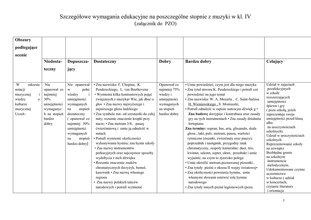 Szczegółowe wymagania edukacyjne na poszczególne stopnie z muzyki w kl. IV (załącznik do PZO) Obszary podlegające ocenie W zakresie notacji muzycznej i wiedzy o kulturze muzycznej Uczeń : Niedosta- Dopuszcza- teczny jący Nie opanował co najmniej 30% umiejętności wymaganyc h na stopień bardzo dobry Nie opanował w pełni wiedzy i umiejętności wymaganych na stopień dostateczny ( opanował co najmniej 30% umiejętności wymaganych na stopień bardzo dobry) Dostateczny Dobry Bardzo dobry Celujący • Zna nazwiska: F. Chopina, K. Pendereckiego, L. van Beethovena • Wymienia kilka kontrastowych pojęć związanych z muzyką• Wie, jak dbać o głos • Zna nazwy najwyższego i najniższego głosu ludzkiego • Zna symbole nut- od szesnastki do całej nuty; rozumie znaczenie kropki przy nucie; • Zna metrum 3/8; pauzę ćwierćnutową i umie ją odnaleźć w nutach • Potrafi wymienić okoliczności wykonywania hymnu; zna hymn szkoły • Zna nazwy instrumentów perkusyjnych oraz najczęstsze sposoby wydobycia z nich dźwięku • Rozumie znaczenie znaków chromatycznych (krzyżyk, bemol, kasownik • Zna nazwę własnego regionu • Zna nazwy polskich tańców narodowych i potrafi wymienić Opanował co najmniej 75% wiedzy i umiejętności wymaganych na stopień bardzo dobry • Umie powiedzieć, czym jest dla niego muzyka • Zna tytuł utworu K. Pendereckiego i potrafi coś powiedzieć na jego temat • Zna nazwiska: W. A. Mozarta , C. Saint-Saënsa. H. Wieniawskiego , S. Moniuszki, • Potrafi odnaleźć w zapisie nutowym dźwięk g • Zna budowę skrzypiec i kontrabasu oraz zasady gry na tych instrumentach • Zna zasady działania fortepianu Zna terminy: sopran, bas, aria, glissando, skala głosu , takt, puls, metrum, pauza, wartości rytmiczne (ósemki, ćwierćnuty oraz pauzy); poprzednik i następnik, przygodny znak chromatyczny, zespoły kameralne: duet, trio, kwintet, sekstet, septet, oktet, przedtakt i umie wyjaśnić, na czym to zjawisko polega • Umie określić metrum poznawanej piosenki , • Zna tytuły pieśni z okresu II wojny światowej• • Zna okoliczności powstania hymnu, umie własnymi słowami omówić rolę hymnu narodowego • Zna tytuły innych pieśni legionowych (poza Udział w zajęciach pozalekcyjnych w szkole rozszerzających umiejętności śpiewu i gry ( poza szkołą, jeżeli zaprezentuje swoje umiejętności przed klasą albo na uroczystościach szkolnych). Udział w uroczystościach szkolnych. Reprezentowanie szkoły na zewnątrz Bezbłędne granie na szkolnym instrumencie melodycznym. Udokumentowane czynne uczestnictwo w kulturze ( udział w koncertach, czytanie literatury i orientacja 1 Szczegółowe wymagania edukacyjne na poszczególne stopnie z muzyki w kl. IV (załącznik do PZO) charakterystyczne cechy, krakowiaka, mazura, oberka, kujawiak i poloneza oraz zna podstawowy krok poloneza • Zna nazwy kilku regionów Polski i umie wskazać je na mapie • Zna kilka faktów z życia Fryderyka Chopina• Umie wymienić kilka tytułów jego utworów •Zna terminy: kwartet smyczkowy, muzyka ilustracyjna (i wie co on oznacza) artystyczne opracowanie tańca, fermata i mormorando, poprzednik, następnik, synkopa, przedtakt (oraz potrafi wskazać go w zapisie nutowym), kanon i potrafi wyjaśnić zasadę jego wykonywania • Zna nazwy instrumentów smyczkowych i potrafi rozpoznać te instrumenty na ilustracji • Wie, kim był: O. Kolberg (zna historyczne i kulturowe znaczenie jego dzieła) • Umie określić budowę pieśni: zwrotka i refren• Zna budowę formy AB, ABA, ABA’, ronda• Potrafi przyporządkować wzór graficzny odzwierciedlający budowę tych form • Wie, co to jest kanon, zwrotka i refren, • Potrafi wymienić kilka cech regionu kurpiowskiego i podhalańskiego pieśnią Przybyli ułani), • Umie odnaleźć synkopy w zapisie nutowym• Umie samodzielnie wymienić źródła dźwięku w instrumentach perkusyjnych • Potrafi wskazać w zapisie nutowym całą nutę i odpowiadającą jej pauzę• • Umie odczytać zapis nutowy z użyciem znaków chromatycznych, rytm w metrum 3/8 • Wymienia tradycje świąteczne (polskie, regionalne) • Potrafi wymienić nazwy kilku tańców z własnego regionu , umie streścić legendy i opowiedzieć o ciekawych zdarzeniach związanych z własną okolicą • Zna nazwy kilku regionów Polski i umie wskazać je na mapie • Umie podać kilka tytułów kompozycji S. Moniuszki • Wykazał się wiedzą w klasowym konkursie o F. Chopinie w aktualnych wydarzeniach kulturalnych). Uczeń opanował 100 % wiedzy • Wymienia cztery poznane instrumenty smyczkowe zgodnie z wysokością ich brzmienia • Zna budowę altówki i wiolonczeli, potrafi porównać te instrumenty ze skrzypcami i kontrabasem • Pamięta tytuł utworu i całego cyklu Karnawał Zwierząt • Opowiada własnymi słowami o tradycji związanej z okresem przesilenia wiosennego i Wielkanocą • Wie, jak zbudowana jest harfa i gitara i do jakiej grupy instrumentów należą 2 Szczegółowe wymagania edukacyjne na poszczególne stopnie z muzyki w kl. IV (załącznik do PZO) W zakresie percepcji uczeń: Nie opanował co najmniej 30% umiejętności wymaganyc h na stopień bardzo dobry Nie opanował w pełni wiedzy i umiejętności wymaganych na stopień dostateczny ( opanował co najmniej 30% umiejętności wymaganych na stopień bardzo dobry) • Rozpoznaje różne odgłosy • Umie odróżnić grę arco od pizzicato oraz staccato i legato • Rozpoznaje ze słuchu metrum ¾ i 4/4 oraz rytmy polskich tańców narodowych ( poloneza, mazura) • Określa własnymi słowami nastrój piosenki i słuchanego utworu• Rozpoznaje barwę fortepianu • Odróżnia słuchem podobną melodię zagraną w skali durowej i molowej • Rozpoznaje dwie jednakowe części w utworze o formie ABA • Rozpoznaje wybrane – słuchane na lekcjach dzieła F. Chopina , S. Moniuszki, W.A. Mozarta, L.v. Beethovena, H. Wieniawskiego, J. S. Bacha, C. S