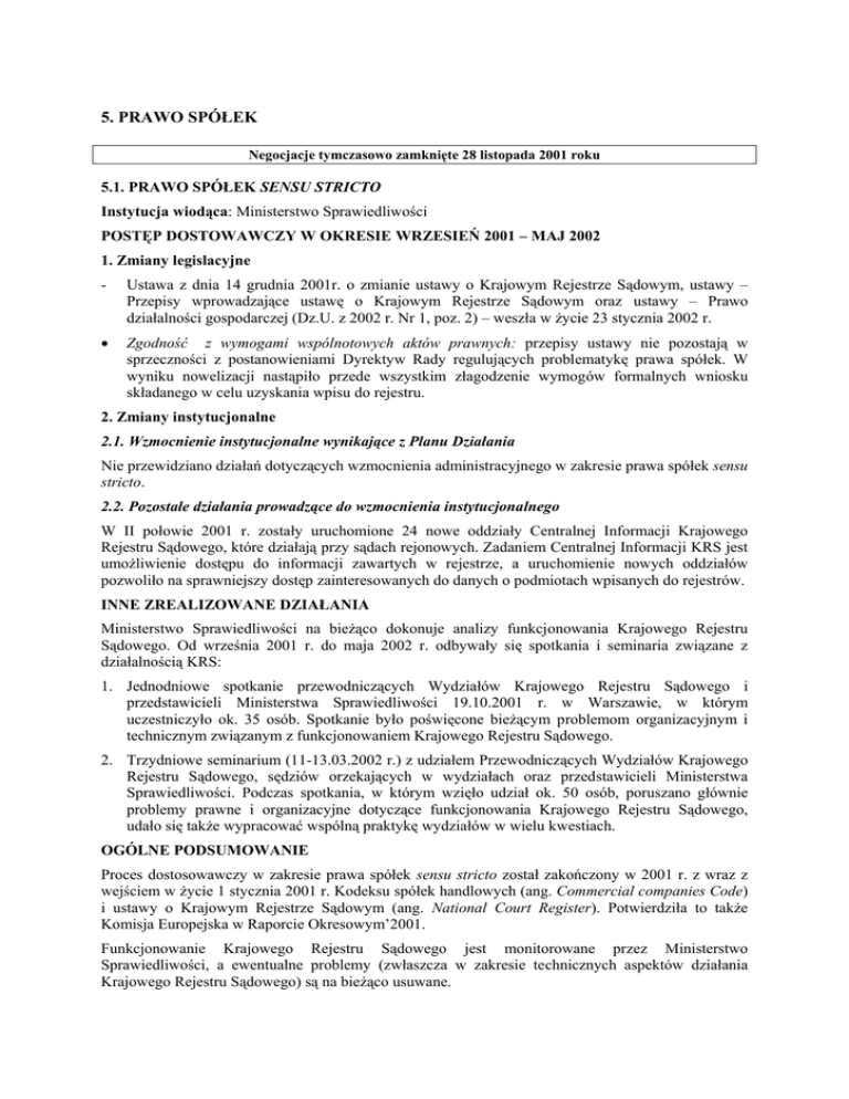 5. PRAWO SPÓŁEK Negocjacje tymczasowo zamknięte 28 listopada 2001 roku 5.1. PRAWO SPÓŁEK SENSU STRICTO Instytucja wiodąca: Ministerstwo Sprawiedliwości POSTĘP DOSTOWAWCZY W OKRESIE WRZESIEŃ 2001 – MAJ 2002 1. Zmiany legislacyjne - Ustawa z dnia 14 grudnia 2001r. o zmianie ustawy o Krajowym Rejestrze Sądowym, ustawy – Przepisy wprowadzające ustawę o Krajowym Rejestrze Sądowym oraz ustawy – Prawo działalności gospodarczej (Dz.U. z 2002 r. Nr 1, poz. 2) – weszła w życie 23 stycznia 2002 r. • Zgodność z wymogami wspólnotowych aktów prawnych: przepisy ustawy nie pozostają w sprzeczności z postanowieniami Dyrektyw Rady regulujących problematykę prawa spółek. W wyniku nowelizacji nastąpiło przede wszystkim złagodzenie wymogów formalnych wniosku składanego w celu uzyskania wpisu do rejestru. 2. Zmiany instytucjonalne 2.1. Wzmocnienie instytucjonalne wynikające z Planu Działania Nie przewidziano działań dotyczących wzmocnienia administracyjnego w zakresie prawa spółek sensu stricto. 2.2. Pozostałe działania prowadzące do wzmocnienia instytucjonalnego W II połowie 2001 r. zostały uruchomione 24 nowe oddziały Centralnej Informacji Krajowego Rejestru Sądowego, które działają przy sądach rejonowych. Zadaniem Centralnej Informacji KRS jest umożliwienie dostępu do informacji zawartych w rejestrze, a uruchomienie nowych oddziałów pozwoliło na sprawniejszy dostęp zainteresowanych do danych o podmiotach wpisanych do rejestrów. INNE ZREALIZOWANE DZIAŁANIA Ministerstwo Sprawiedliwości na bieżąco dokonuje analizy funkcjonowania Krajowego Rejestru Sądowego. Od września 2001 r. do maja 2002 r. odbywały się spotkania i seminaria związane z działalnością KRS: 1. Jednodniowe spotkanie przewodniczących Wydziałów Krajowego Rejestru Sądowego i przedstawicieli Ministerstwa Sprawiedliwości 19.10.2001 r. w Warszawie, w którym uczestniczyło ok. 35 osób. Spotkanie było poświęcone bieżącym problemom organizacyjnym i technicznym związanym z funkcjonowaniem Krajowego Rejestru Sądowego. 2. Trzydniowe seminarium (11-13.03.2002 r.) z udziałem Przewodniczących Wydziałów Krajowego Rejestru Sądowego, sędziów orzekających w wydziałach oraz przedstawicieli Ministerstwa Sprawiedliwości. Podczas spotkania, w którym wzięło udział ok. 50 osób, poruszano głównie problemy prawne i organizacyjne dotyczące funkcjonowania Krajowego Rejestru Sądowego, udało się także wypracować wspólną praktykę wydziałów w wielu kwestiach. OGÓLNE PODSUMOWANIE Proces dostosowawczy w zakresie prawa spółek sensu stricto został zakończony w 2001 r. z wraz z wejściem w życie 1 stycznia 2001 r. Kodeksu spółek handlowych (ang. Commercial companies Code) i ustawy o Krajowym Rejestrze Sądowym (ang. National Court Register). Potwierdziła to także Komisja Europejska w Raporcie Okresowym’2001. Funkcjonowanie Krajowego Rejestru Sądowego jest monitorowane przez Ministerstwo Sprawiedliwości, a ewentualne problemy (zwłaszcza w zakresie technicznych aspektów działania Krajowego Rejestru Sądowego) są na bieżąco usuwane. 5.2 OCHRONA WŁASNOŚCI INTELEKTUALNEJ Instytucja wiodąca: Ministerstwo Kultury POSTĘP DOSTOSOWAWCZY W OKRESIE WRZESIEŃ 2001 – MAJ 2002 1. Zmiany legislacyjne − Rozporządzenie Rady Ministrów z dnia 5 lutego 2002 r. w sprawie sposobu i trybu postępowania organów celnych przy zatrzymywaniu towarów w wypadku podejrzenia naruszenia przepisów dotyczących ochrony własności intelektualnej (Dz.U. z 2002 r. Nr 12 poz. 112) – weszło w życie 17 lutego 2002 r. • Zgodność z wymogami wspólnotowych aktów prawnych: Rozporządzenie jest zgodne z prawem wspólnotowym, w szczególności z Rozporządzeniem Rady (WE) nr 3295/94 z 22 grudnia 1994 r. w sprawie wprowadzenia środków zakazujących wprowadzania do wolnego obrotu, eksportu, powrotnego eksportu i umieszczania pod procedurą zawieszającą towarów podrabianych i towarów pirackich (OJ L 341/94 z późn. zm.) oraz Rozporządzeniem Komisji (WE) nr 1367/95 z 16 czerwca 1995 r. w sprawie ustanowienia przepisów wprowadzających Rozporządzenie Rady (WE) nr 3295/94 w sprawie wprowadzenia środków zakazujących wprowadzania do wolnego obrotu, eksportu, powrotnego eksportu i umieszczania pod procedurą zawieszającą towarów podrabianych i towarów pirackich (OJ L 133/95 z późn. zm.). − Rozporządzenie Rady Ministrów z dnia 16 kwietnia 2002 r. zmieniające rozporządzenie z dnia 5 lutego 2002 r. w sprawie sposobu i trybu postępowania organów celnych przy zatrzymywaniu towarów w wypadku podejrzenia naruszenia przepisów dotyczących ochrony własności intelektualnej – weszło w życie 1 maja 2002 r. • Zgodność z wymogami wspólnotowych aktów prawnych: Nowelizacja rozporządzenia wynikała z konieczności dostosowania go do zmian w strukturze organizacyjnej administracji celnej 2. Zmiany instytucjonalne 2.1. Wzmocnienie instytucjonalne wynikające z Planu Działania W styczniu 2002 r. uruchomiony został Program twinningowy z partnerem hiszpańskim. Rozpoczęta została procedura przetargowa Phare’2000 PL 0004.04. Od 26 lutego 2002 Polska gości doradcę przedakcesyjnego (Pre-accession Adviser). Wszelkie działania przebiegają zgodnie z postanowieniami porozumienia twinningowego (Twinning covenant). 2.2. Pozostałe działania prowadzące do wzmocnienia instytucjonalnego W celu lepszego przygotowania kadry wymiaru sprawiedliwości do efektywnego realizowania sądowej ochrony własności intelektualnej zorganizowane zostało w dniach 27-29 listopada 2001 r. seminarium dla sędziów i prokuratorów. Przedmiotem seminarium była analiza przepisów ustawy o prawie autorskim i prawach pokrewnych, odpowiednie procedury karne oraz przepisy międzynarodowe w zakresie prawa autorskiego. Na mocy uchwały Rady Ministrów w sprawie częściowego podziału rezerwy celowej na zwiększenie wynagrodzeń i limitów zatrudnienia wynikających ze zmian organiz