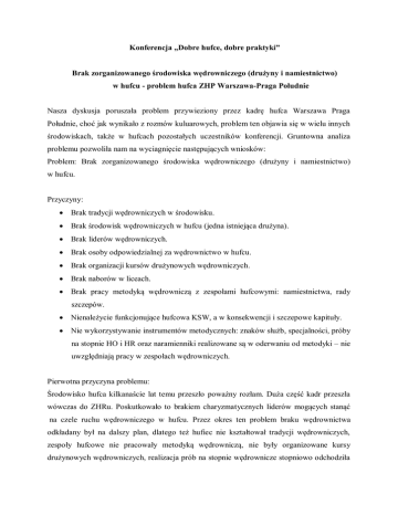 Konferencja „Dobre hufce, dobre praktyki” Brak zorganizowanego środowiska wędrowniczego (drużyny i namiestnictwo) w hufcu - problem hufca ZHP Warszawa-Praga Południe Nasza dyskusja poruszała problem przywieziony przez kadrę hufca Warszawa Praga Południe, choć jak wynikało z rozmów kuluarowych, problem ten objawia się w wielu innych środowiskach, także w hufcach pozostałych uczestników konferencji. Gruntowna analiza problemu pozwoliła nam na wyciagnięcie następujących wniosków: Problem: Brak zorganizowanego środowiska wędrowniczego (drużyny i namiestnictwo) w hufcu. Przyczyny: Brak tradycji wędrowniczych w środowisku. Brak środowisk wędrowniczych w hufcu (jedna istniejąca drużyna). Brak liderów wędrowniczych. Brak osoby odpowiedzialnej za wędrownictwo w hufcu. Brak organizacji kursów drużynowych wędrowniczych. Brak naborów w liceach. Brak pracy metodyką wędrowniczą z zespołami hufcowymi: namiestnictwa, rady szczepów. Nienależycie funkcjonujące hufcowa KSW, a w konsekwencji i szczepowe kapituły. Nie wykorzystywanie instrumentów metodycznych: znaków służb, specjalności, próby na stopnie HO i HR oraz naramienniki realizowane są w oderwaniu od metodyki – nie uwzględniają pracy w zespołach wędrowniczych. Pierwotna przyczyna problemu: Środowisko hufca kilkanaście lat temu przeszło poważny rozłam. Duża część kadr przeszła wówczas do ZHRu. Poskutkowało to brakiem charyzmatycznych liderów mogących stanąć na czele ruchu wędrowniczego w hufcu. Przez okres ten problem braku wędrownictwa odkładany był na dalszy plan, dlatego też hufiec nie kształtował tradycji wędrowniczych, zespoły hufcowe nie pracowały metodyką wędrowniczą, nie były organizowane kursy drużynowych wędrowniczych, realizacja prób na stopnie wędrownicze stopniowo odchodziła od pewnych założeń metodyki wędrowniczej. Wszystko to spowodowało, że w hufcu nie ma powszechnej świadomości o potrzebie i atrakcyjności pracy metodycznej z osobami w wieku wędrowniczym. Nie ma kandydatów na liderów wędrowniczych, nie funkcjonują środowiska wędrownicze, w liceach nie są organizowane nabory. Hermetyczne środowiska specjalnościowe nie nawiązują współpracy z innymi jednostkami hufca. Hufcowa kapituła również funkcjonuje na poziomie dalekim od ideału nie spełniając należycie swej roli, jaką powinna być straż nad należytą realizacją metodyki w środowiskach hufca np. w szczepowych kapitułach stopni. Niewątpliwą konsekwencją takiego stanu rzeczy, a zarazem olbrzymią trudnością w wyjściu z tej sytuacji jest również fakt, iż w hufcu nie ma autorytetu wędrowniczego – kształceniowa, mogącego uczyć, inspirować i motywować potencjalne przyszłe kadry drużyn i instruktorów hufca w ogóle. Środowisko hufca posiada jednak liczne zasoby, pomocne w rozwiązaniu tego problemu: Podstawą i najważniejszym z nich jest świadomość problemu i CHĘĆ ZMIAN. Planowane są działania kształceniowe dla przyszłych kadr wędrowniczych. Hufiec utrzymuje kontakt z kształceniowcami wędrowniczymi. Hufiec ma szansę korzystać z licznych zewnętrznych propozycji programowych i kształceniowych. Organizowane są obozy wędrowne. W szczepach funkcjonują kapituły stopni wędrowniczych. Działają potencjalne zespoły wędrownicze w szczepach oraz namiestnictwach. Pozostali namiestnicy czynnie działają. W hufcu działa łącznie ok. setka osób w wieku wędrowniczym. Funkcjonuje ciąg wychowawczy – szansa na pozyskanie ludzi. Na terenie hufca są szkoły średnie – szansa na pozyskanie ludzi. Pod okiem reprezentantów hufca wypracowaliśmy następujący stan oczekiwany i propozycje rozwiązań: Stan oczekiwany: Ruch wędrowniczy w hufcu! Składowe wraz z działaniami: Liderzy wędrowniczy o Organizacja kursu drużynowych wędrowniczych. o Warsztaty dla instruktorów hufca. o Stała praca ze szczepowymi. Kształceniowiec w hufcu o Specjalista z zewnątrz o Znaleźć odpowiednią osobę/osoby o Przeszkolić ją na zewnętrznych kursach kadry kształcącej Namiestnictwo i namiestnik wędrowniczy o Pre-namiestnictwo – składające się z patrolowych zespołów wędrowniczych ze wszystkich środowisk oraz instruktorów kształceniowców – przyszłej kadry namiestnictwa. o Stałe działanie i koordynacja pozostałych zespołów hufca w zakresie rozwoju wędrownic twa. Namiestnictwa i zespoły hufcowe pracują metodyką wędrowniczą o Praca z kadrami szczepów metodyką wędrowniczą o Praca metodyką wędrowniczą na kursach drużynowych – z każdym pionem metodycznym. o Warsztaty dla instruktorów hufca. o Stała praca ze szczepowymi. Próby na stopnie HO, HR oraz naramienniki wędrownicze realizowane są w zespołach wędrowniczych. Hufcowe KSW pilnuje szczepowe kapituły stopni w realizowaniu metodyki o Dostosowanie regulaminów i wymogów do tradycji środowiska. o Kontrolowanie szczepowych KSW o Szkolenie dla członków kapituł. Drużyny (zespoły) wędrownicze w każdym środowisku o Powoływać patrole, które w przyszłości będą miały szansę przekształcić się w drużyny. o Prowadzenie naborów w liceach o Wychowywanie liderów z ciągu wychowawczego. o Szczepowe kapituły muszą dobrze funkcjonować, a pracujący w nich instruktorzy musza rozumieć metodykę. Niewątpliwie jednak za najważniejszy wymóg i szereg działań uznaliśmy wypracowanie powszechnej świadomości problemu wśród wszystkich instruktorów hufca i zaangażowanie całego środowiska hufca w rozwój ruchu wędrowniczego na każdym polu od pozyskiwania środków po pracę kształceniową. pwd. Michał Werner Nigdy sprawnie nie działało środowisko wędrownicze Nie zdobywane są znaki służb Problem: Brak zorganizowanego środowiska wędrowniczego (drużyny i namiestnictwo) w hufcu. Nie organizowane są kursy drużynowych wędrowniczych Stopnie HO, HR i naramienniki zdobywane są w oderwaniu od metodyki Nie było wolnej kadry, osob