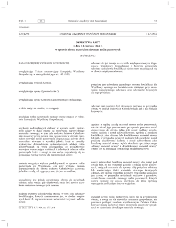 03/t. 1 Dziennik Urzędowy Unii Europejskiej PL 55 31966L0401 125/2298 DZIENNIK URZĘDOWY WSPÓLNOT EUROPEJSKICH 11.7.1966 DYREKTYWA RADY z dnia 14 czerwca 1966 r. w sprawie obrotu materiałem siewnym roślin pastewnych (66/401/EWG) RADA EUROPEJSKIEJ WSPÓLNOTY GOSPODARCZEJ, uwzględniając Traktat ustanawiający Europejską Wspólnotę Gospodarczą, w szczególności jego art. 43 i 100, uwzględniając wniosek Komisji, uwzględniając opinię Zgromadzenia (1), schemat taki już istnieje na szczeblu międzynarodowym; Organizacja Współpracy Gospodarczej i Rozwoju opracowała schemat odmianowej kwalifikacji nasion traw znajdujących się w obrocie międzynarodowym; pożądane jest uchwalenie jednolitego systemu kwalifikacji dla Wspólnoty, opartego na doświadczeniu zdobytym przy stosowaniu wspomnianego schematu oraz schematów krajowych dla tego produktu; uwzględniając opinię Komitetu Ekonomicznego-Społecznego, a także mając na uwadze, co następuje: schemat taki powinien być stosowany zarówno w przypadku obrotu w innych Państwach Członkowskich, jak i na rynkach krajowych; produkcja roślin pastewnych zajmuje istotne miejsce w rolnictwie Europejskiej Wspólnoty Gospodarczej; uzyskanie zadowalających efektów w uprawie roślin pastewnych zależy w dużej mierze od stosowania odpowiedniego materiału siewnego; w tym celu niektóre Państwa Członkowskie stosowały przez pewien czas ograniczenia w obrocie materiałem siewnym roślin pastewnych, dopuszczając jedynie obrót materiałem siewnym o wysokiej jakości; kraje te potrafiły wykorzystać doświadczenia systematycznych selekcji roślin dokonywanych od wielu dziesięcioleci, co poskutkowało rozwojem wystarczająco stabilnych i jednolitych odmian roślin pastewnych, które, z uwagi na swe cechy, zapowiadają się na posiadające wielką wartość dla zamierzonych celów; zostanie osiągnięta większa produktywność w uprawie roślin pastewnych we Wspólnocie, jeśli przy wyborze odmian dopuszczonych do obrotu Państwa Członkowskie zastosują jednolite zasady, tak rygorystyczne, jak jest to możliwe; uzasadnione jest jednak ograniczanie obrotu do niektórych odmian, tylko wtedy, gdy użytkownik może być pewien uzyskania materiału siewnego tych odmian; niektóre Państwa Członkowskie stosują w tym celu schematy kwalifikacyjne, których zamierzeniem jest, w drodze urzędowych kontroli, zagwarantowanie tożsamości i czystości odmianowej; (1) Dz.U. 109 z 9.7.1964, str. 1751/64. zgodnie z ogólną zasadą materiał siewny roślin pastewnych, niezależnie od jego przeznaczenia po uprawie, powinien zostać dopuszczony do obrotu, tylko jeśli został poddany urzędowemu badaniu i został zakwalifikowany, zgodnie z zasadami kwalifikacji, jako elitarny lub kwalifikowany materiał siewny lub jeśli, w przypadku pewnych rodzajów lub gatunków, został poddany urzędowemu badaniu i został zatwierdzony jako handlowy materiał siewny; wybór określenia specjalistycznego „elitarny materiał siewny” i „kwalifikowany materiał siewny” oparty jest na istniejącej terminologii międzynarodowej; należy zatwierdzać handlowy materiał siewny, aby wziąć pod uwagę fakt, że nie wszystkie gatunki i rodzaje roślin pastewnych, mających znaczenie dla uprawy, dały pożądane odmiany lub wystarczające ilości materiału siewnego istniejących odmian, aby spełnić wszystkie potrzeby Wspólnoty; konieczne jest zatem, w przypadku niektórych rodzajów i gatunków, zatwierdzanie materiału siewnego roślin pastewnych, których nazwa odmiany nie została określona, ale które spełniają wymagania pod każdym innym względem; materiał siewny roślin pastewnych, które nie są przedmiotem obrotu, z uwagi na ich niewielkie znaczenie gospodarcze, nie powinien podlegać zasadom wspólnotowym; Państwa Członkowskie muszą zachować prawo stosowania przepisów specjalnych w odniesieniu do takiego materiału siewnego; 56 PL Dziennik Urzędowy Unii Europejskiej zasady wspólnotowe nie powinny mieć zastosowania dla materiału siewnego przeznaczonego na wywóz do państw trzecich; w celu polepszenia nie tylko jakości genetycznej materiału siewnego roślin pastewnych we Wspólnocie, ale także jego cech zewnętrznych, należy ustalić pewne wymagania co do laboratoryjnej czystości i zdolności kiełkowania; w celu zagwarantowania tożsamości materiału siewnego muszą zostać ustanowione wspólnotowe reguły dotyczące pakowania, pobierania próbek, plombowania i znakowania; w tym celu etykiety powinny zawierać szczegółowe informacje niezbędne zarówno dla urzędowej kontroli, jak i dla informacji użytkowników, oraz powinny jasno przedstawiać wspólnotowy charakter kwalifikacji kwalifikowanego materiału siewnego różnych kategorii; niektóre Państwa Członkowskie potrzebują mieszanek materiału siewnego roślin pastewnych kilku rodzajów i gatunków do celów specjalnych; w celu uwzględnienia tych potrzeb Państwa Członkowskie powinny być upoważnione do zatwierdzania takich mieszanek z zastrzeżeniem pewnych warunków; w celu zagwarantowania spełniania podczas obrotu wymagań jakościowych oraz przepisów gwarantujących tożsamość materiału siewnego Państwa Członkowskie muszą zapewnić stosowanie właściwych ustaleń dotyczących kontroli; materiał siewny spełniający te wymagania nie powinien, bez uszczerbku dla art. 36 Traktatu, podlegać żadnym ograniczeniom w obrocie, innym niż przewidziane przez zasady wspólnotowe; w pierwszym etapie, aż do ustanowienia wspólnego katalogu odmian, dopuszczalne ograniczenia powinny obejmować w szczególności prawo Państw Członkowskich do ograniczania obrotu kwalifikowanym materiałem siewnym do tych odmian, które mają znaczenie dla uprawy i są używane na ich własnych terytoriach; 03/t. 1 z drugiej strony, należy umożliwić dopuszczanie do obrotu w obrębie Wspólnoty materiału siewnego roślin pastewnych zebranego w państwach trzecich tylko wtedy, gdy 