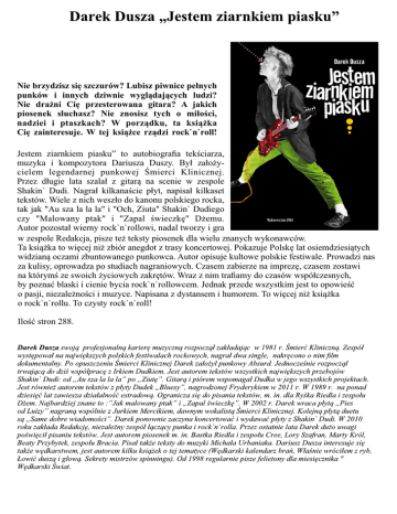 Nie brzydzisz się szczurów? Lubisz piwnice pełnych punków i innych dziwnie wyglądających ludzi? Nie drażni Cię przesterowana gitara? A jakich piosenek słuchasz? Nie znosisz tych o miłości, nadziei i ptaszkach? W porządku, ta książka Cię zainteresuje. W tej książce rządzi rock`n`roll! Jestem ziarnkiem piasku” to autobiografia tekściarza, muzyka i kompozytora Dariusza Duszy. Był założycielem legendarnej punkowej Śmierci Klinicznej. Przez długie lata szalał z gitarą na scenie w zespole Shakin` Dudi. Nagrał kilkanaście płyt, napisał kilkaset tekstów. Wiele z nich weszło do kanonu polskiego rocka, tak jak "Au sza la la la" i "Och, Ziuta" Shakin` Dudiego czy "Malowany ptak" i "Zapal świeczkę" Dżemu. Autor pozostał wierny rock`n`rollowi, nadal tworzy i gra w zespole Redakcja, pisze też teksty piosenek dla wielu znanych wykonawców. Ta książka to więcej niż zbiór anegdot z trasy koncertowej. Pokazuje Polskę lat osiemdziesiątych widzianą oczami zbuntowanego punkowca. Autor opisuje kultowe polskie festiwale. Prowadzi nas za kulisy, oprowadza po studiach nagraniowych. Czasem zabierze na imprezę, czasem zostawi na którymś ze swoich życiowych zakrętów. Wraz z nim trafiamy do czasów współczesnych, by poznać blaski i cienie bycia rock`n`rollowcem. Jednak przede wszystkim jest to opowieść o pasji, niezależności i muzyce. Napisana z dystansem i humorem. To więcej niż książka o rock`n`rollu. To czysty rock`n`roll! Ilość stron 288.