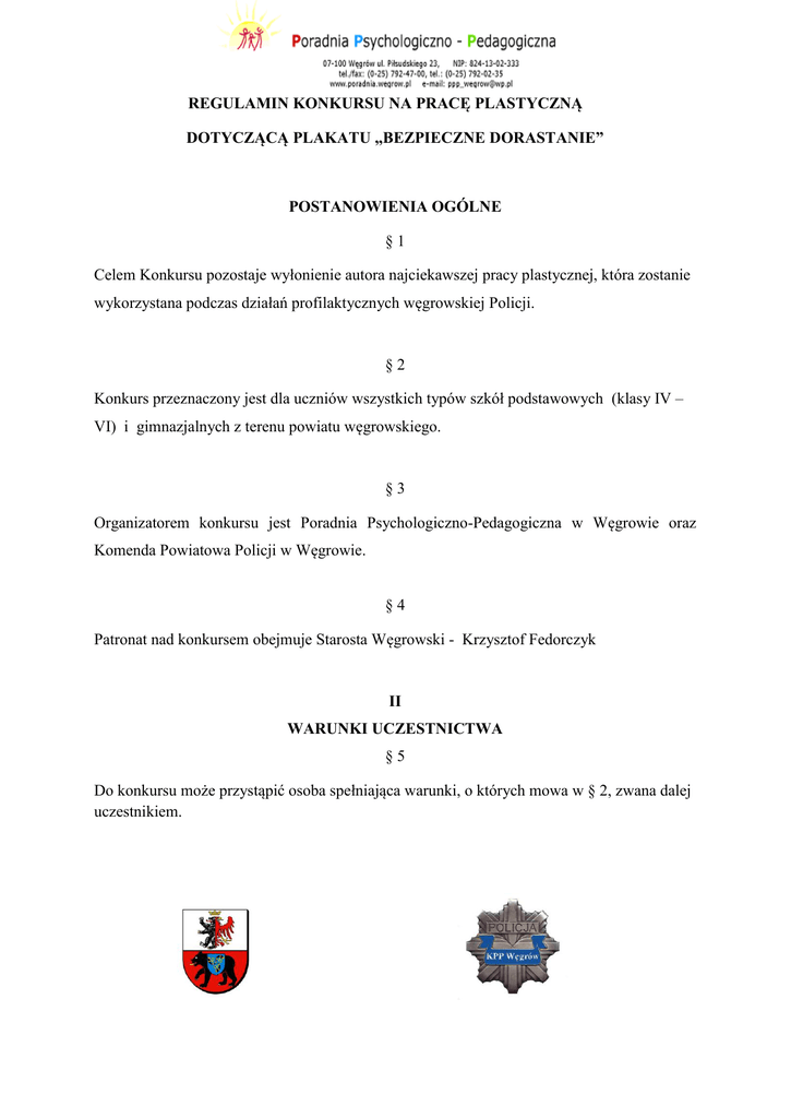 REGULAMIN KONKURSU NA PRACĘ PLASTYCZNĄ DOTYCZĄCĄ PLAKATU „BEZPIECZNE DORASTANIE” POSTANOWIENIA OGÓLNE §1 Celem Konkursu pozostaje wyłonienie autora najciekawszej pracy plastycznej, która zostanie wykorzystana podczas działań profilaktycznych węgrowskiej Policji. §2 Konkurs przeznaczony jest dla uczniów wszystkich typów szkół podstawowych (klasy IV – VI) i gimnazjalnych z terenu powiatu węgrowskiego. §3 Organizatorem konkursu jest Poradnia Psychologiczno-Pedagogiczna w Węgrowie oraz Komenda Powiatowa Policji w Węgrowie. §4 Patronat nad konkursem obejmuje Starosta Węgrowski - Krzysztof Fedorczyk II WARUNKI UCZESTNICTWA §5 Do konkursu może przystąpić osoba spełniająca warunki, o których mowa w § 2, zwana dalej uczestnikiem. §6 Uczestnictwo w Konkursie jest bezpłatne i dobrowolne. §7 Każdy uczestnik może zgłosić do konkursu jedną pracę, której jest autorem. Każda praca powinna zawierać na odwrocie metryczkę z danymi:  imię i nazwisko autora,  określenie klasy i nazwy szkoły,  adres i telefon,  e-mail,  imię i nazwisko nauczyciela. §8 Uczestnik zobowiązany jest przesłać wykonaną przez siebie pracę w terminie do dnia 27 lutego 2015 roku, decyduje data stempla pocztowego na opakowaniu (kopercie), wraz z formularzem zgłoszeniowym złożonym zgodnie ze wzorem stanowiącym załącznik do niniejszego regulaminu, na adres: Poradnia Psychologiczno-Pedagogiczna w Węgrowie ul. Piłsudskiego 23 07-100 Węgrów §9 Uczestnik zobowiązany jest umieścić na opakowaniu (kopercie) napis: Konkurs – „Bezpieczne dorastanie”. § 10 Koszty związane z przesłaniem pracy konkursowej ponosi uczestnik. III PRACE KONKURSOWE I WYMOGI ICH DOTYCZĄCE § 11 Treść prac konkursowych powinna promować bezpieczne postawy wśród rówieśników mające na celu przeciwdziałanie przemocy i agresji wśród dzieci i młodzieży. § 12 Prace plastyczne winny być wykonane w formacie A-3. Technika: rysunki malowane farbami (np. akwarele, farby plakatowe, pastele, farby temperowe) lub kredkami. § 13 Organizator zastrzega sobie prawo dyskwalifikowania prac niespełniających wymogów wymienionych w regulaminie. § 14 Prace zgłaszane na konkurs nie mogą naruszać prawa, w tym w szczególności dóbr osobistych osób trzecich, a także ogólnie przyjętych norm obyczajowych. IV POSTANOWIENIA ZWIĄZANE Z PRZEBIEGIEM KONKURSU § 15 W celu przeprowadzenia Konkursu powołuje się Jury składające się z policjanta z Komendy Powiatowej Policji w Węgrowie, pracownika Poradni Psychologiczno-Pedagogicznej w Węgrowie, przedstawiciela środowiska artystycznego. § 16 Prace konkursowe zostaną poddane ocenie Jury w terminie do dnia 10.03.2015r. § 17 Informacje o przyznanych nagrodach i wyróżnieniach zostaną zamieszczone na stronie internetowej Komendy Powiatowej Policji w Węgrowie i Poradni PsychologicznoPedagogicznej w Węgrowie. § 18 Uroczyste wręczenie nagród autorom zwycięskich prac nastąpi w terminie do 31 marca 2015 roku. Laureaci konkursu zostaną telefonicznie powiadomieni o wynikach oraz terminie (sposobie) wręczenia nagród. V PRAWA ORGANIZATORA § 19 Organizator konkursu zastrzega sobie prawo (z zaznaczeniem autora) do:  nieodpłatnego wykorzystania zgłoszonych prac w działalności informacyjnej oraz profilaktycznej,  wydawania i rozpowszechniania, również w formie elektronicznej oraz w Internecie, wszelkich materiałów promocyjnych, informacyjnych, wydawniczych i innych z wykorzystaniem nadesłanych prac,  publicznego wystawiania i wyświetlania na wszelkich imprezach otwartych i zamkniętych zgłoszonych prac. § 20 Nagrodzone prace będą wykorzystywane w działaniach profilaktycznych i udostępnione we wszystkich placówkach z terenu powiatu węgrowskiego. § 21 Wszelkie zapytania i informacje należy kierować do st. sierż. Anny Maliszewskiej (606-464-061) oraz dyrektora Poradni Psychologiczno-Pedagogicznej w Węgrowie – Izabeli Ratyńskiej (608-309-664).
