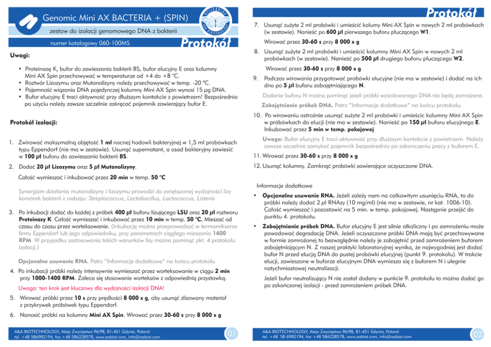Protokół Genomic Mini AX BACTERIA + (SPIN) zestaw do izolacji genomowego DNA z bakterii numer katalogowy 060-100MS Uwagi: Protokół • Proteinazę K, bufor do zawieszania bakterii BS, bufor elucyjny E oraz kolumny Mini AX Spin przechowywać w temperaturze od +4 do +8 °C. • Roztwór Lizozymu oraz Mutanolizyny należy przechowywać w temp. -20 °C. • Pojemność wiązania DNA pojedynczej kolumny Mini AX Spin wynosi 15 µg DNA. • Bufor elucyjny E traci aktywność przy dłuższym kontakcie z powietrzem! Bezpośrednio po użyciu należy zawsze szczelnie zakręcać pojemnik zawierający bufor E. 7. Usunąć zużyte 2 ml probówki i umieścić kolumy Mini AX Spin w nowych 2 ml probówkach (w zestawie). Nanieść po 600 µl pierwszego buforu płuczącego W1. Wirować przez 30-60 s przy 8 000 x g 8. Usunąć zużyte 2 ml probówki i umieścić kolumny Mini AX Spin w nowych 2 ml probówkach (w zestawie). Nanieść po 500 µl drugiego buforu płuczącego W2. Wirować przez 30-60 s przy 8 000 x g 9. Podczas wirowania przygotować probówki elucyjne (nie ma w zestawie) i dodać na ich dno po 5 µl buforu zobojętniającego N. Dodanie buforu N można pominąć jeżeli próbki wyizolowanego DNA nie będą zamrażane. Zobojętnianie próbek DNA. Patrz “Informacje dodatkowe” na końcu protokołu. 10. Po wirowaniu ostrożnie usunąć zużyte 2 ml probówki i umieścic kolumny Mini AX Spin w próbówkach do elucji (nie ma w zestawie). Nanieść po 150 µl buforu elucyjnego E. Inkubować przez 5 min w temp. pokojowej Protokół izolacji: Uwaga: Bufor elucyjny E traci aktywność przy dłuższym kontakcie z powietrzem. Należy zawsze szczelnie zamykać pojemnik bezpośrednio po zakonczeniu pracy z buforem E. 1. Zwirować maksymalną objętość 1 ml nocnej hodowli bakteryjnej w 1,5 ml probówkach typu Eppendorf (nie ma w zestawie). Usunąć supernatant, a osad bakteryjny zawiesić w 100 µl buforu do zawieszania bakterii BS. 11. Wirować przez 30-60 s przy 8 000 x g 2. Dodać 20 µl Lizozymu oraz 5 µl Mutanolizyny. 12. Usunąć kolumny. Zamknąć probówki zawierające oczyszczone DNA. Całość wymieszać i inkubować przez 20 min w temp. 50 °C Synergizm działania mutanolizyny i lizozymu prowadzi do zwiększonej wydajności lizy komórek bakterii z rodzaju: Streptococcus, Lactobacillus, Lactococcus, Listeria 3. Po inkubacji dodać do każdej z próbek 400 µl buforu lizującego LSU oraz 20 µl roztworu Proteinazy K. Całość wymieszać i inkubować przez 10 min w temp. 50 °C. Mieszać od czasu do czasu przez worteksowanie. (Inkubację można przeprowadzać w termomikserze firmy Eppendorf lub jego odpowiedniku, przy parametrach ciągłego mieszania 1400 RPM. W przypadku zastosowania takich warunków lizy można pominąć pkt. 4 protokołu izolacji.) Opcjonalne usuwanie RNA. Patrz “Informacje dodatkowe” na końcu protokołu 4. Po inkubacji próbki należy intensywnie wymieszać przez worteksowanie w ciągu 2 min przy 1000-1400 RPM. Zaleca się stosowanie worteksów z odpowiednią przystawką. Uwaga: ten krok jest kluczowy dla wydajności izolacji DNA! Informacje dodatkowe • Opcjonalne usuwanie RNA. Jeżeli zależy nam na całkowitym usunięciu RNA, to do próbki należy dodać 2 µl RNAzy (10 mg/ml) (nie ma w zestawie, nr kat. 1006-10). Całość wymieszać i pozostawić na 5 min. w temp. pokojowej. Następnie przejść do punktu 4. protokołu. • Zobojętnianie próbek DNA. Bufor elucyjny E jest silnie alkaliczny i po zamrożeniu może powodować degradację DNA. Jeżeli oczyszczone próbki DNA mają być przechowywane w formie zamrożonej to bezwzględnie należy je zobojętnić przed zamrożeniem buforem zobojętniającym N. Z naszej praktyki laboratoryjnej wynika, że najwygodniej jest dodać bufor N przed elucją DNA do pustej probówki elucyjnej (punkt 9. protokołu). W trakcie elucji, zawieszone w buforze elucyjnym DNA wymiesza się z buforem N i ulegnie natychmiastowej neutralizacji. Jeżeli bufor neutralizujący N nie został dodany w punkcie 9. protokołu to można dodać go po zakończonej izolacji - przed zamrożeniem próbek DNA. 5. Wirować próbki przez 10 s przy prędkości 8 000 x g, aby usunąć zlizowany materiał z przykrywek próbówek typu Eppendorf. 6. Nanosić próbki na kolumny Mini AX Spin. Wirować przez 30-60 s przy 8 000 x g A&A BIOTECHNOLOGY, Aleja Zwycięstwa 96/98, 81-451 Gdynia, Poland tel. +48 586982194, fax +48 586228578, www.aabiot.com, [email protected] 01 A&A BIOTECHNOLOGY, Aleja Zwycięstwa 96/98, 81-451 Gdynia, Poland tel. +48 58 6982194, fax +48 586228578, www.aabiot.com, [email protected] 02