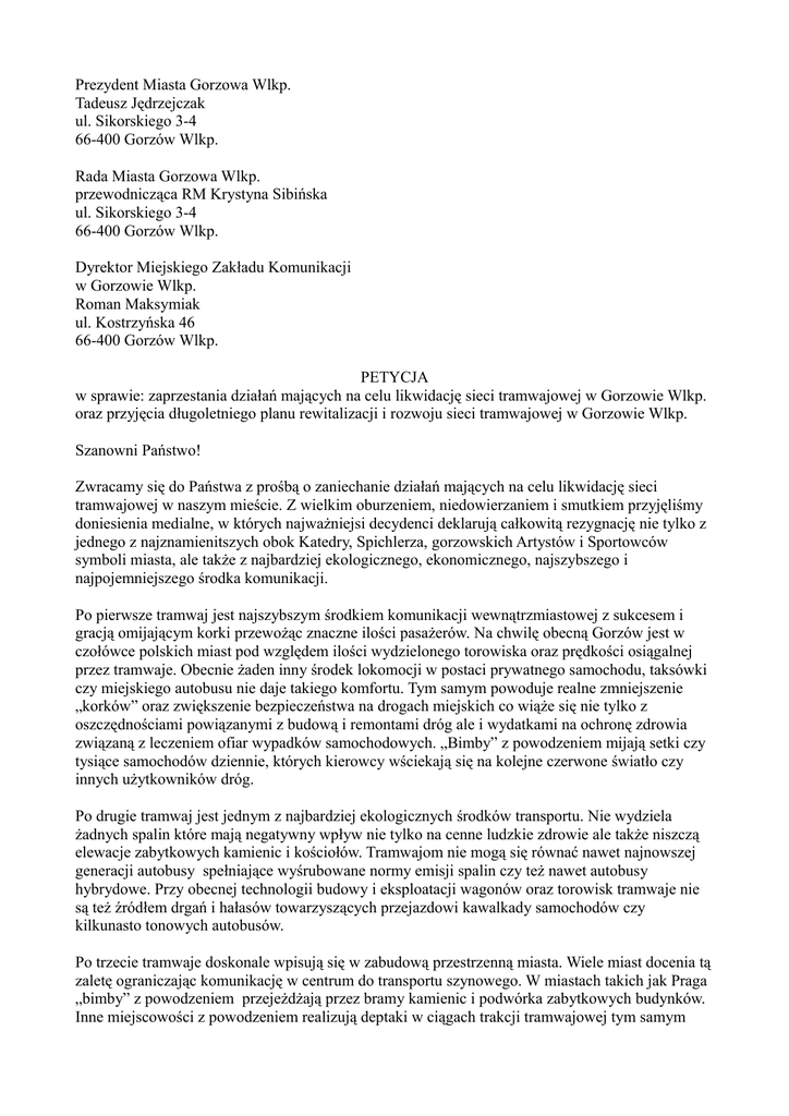 Prezydent Miasta Gorzowa Wlkp. Tadeusz Jędrzejczak ul. Sikorskiego 3-4 66-400 Gorzów Wlkp. Rada Miasta Gorzowa Wlkp. przewodnicząca RM Krystyna Sibińska ul. Sikorskiego 3-4 66-400 Gorzów Wlkp. Dyrektor Miejskiego Zakładu Komunikacji w Gorzowie Wlkp. Roman Maksymiak ul. Kostrzyńska 46 66-400 Gorzów Wlkp. PETYCJA w sprawie: zaprzestania działań mających na celu likwidację sieci tramwajowej w Gorzowie Wlkp. oraz przyjęcia długoletniego planu rewitalizacji i rozwoju sieci tramwajowej w Gorzowie Wlkp. Szanowni Państwo! Zwracamy się do Państwa z prośbą o zaniechanie działań mających na celu likwidację sieci tramwajowej w naszym mieście. Z wielkim oburzeniem, niedowierzaniem i smutkiem przyjęliśmy doniesienia medialne, w których najważniejsi decydenci deklarują całkowitą rezygnację nie tylko z jednego z najznamienitszych obok Katedry, Spichlerza, gorzowskich Artystów i Sportowców symboli miasta, ale także z najbardziej ekologicznego, ekonomicznego, najszybszego i najpojemniejszego środka komunikacji. Po pierwsze tramwaj jest najszybszym środkiem komunikacji wewnątrzmiastowej z sukcesem i gracją omijającym korki przewożąc znaczne ilości pasażerów. Na chwilę obecną Gorzów jest w czołówce polskich miast pod względem ilości wydzielonego torowiska oraz prędkości osiągalnej przez tramwaje. Obecnie żaden inny środek lokomocji w postaci prywatnego samochodu, taksówki czy miejskiego autobusu nie daje takiego komfortu. Tym samym powoduje realne zmniejszenie „korków” oraz zwiększenie bezpieczeństwa na drogach miejskich co wiąże się nie tylko z oszczędnościami powiązanymi z budową i remontami dróg ale i wydatkami na ochronę zdrowia związaną z leczeniem ofiar wypadków samochodowych. „Bimby” z powodzeniem mijają setki czy tysiące samochodów dziennie, których kierowcy wściekają się na kolejne czerwone światło czy innych użytkowników dróg. Po drugie tramwaj jest jednym z najbardziej ekologicznych środków transportu. Nie wydziela żadnych spalin które mają negatywny wpływ nie tylko na cenne ludzkie zdrowie ale także niszczą elewacje zabytkowych kamienic i kościołów. Tramwajom nie mogą się równać nawet najnowszej generacji autobusy spełniające wyśrubowane normy emisji spalin czy też nawet autobusy hybrydowe. Przy obecnej technologii budowy i eksploatacji wagonów oraz torowisk tramwaje nie są też źródłem drgań i hałasów towarzyszących przejazdowi kawalkady samochodów czy kilkunasto tonowych autobusów. Po trzecie tramwaje doskonale wpisują się w zabudową przestrzenną miasta. Wiele miast docenia tą zaletę ograniczając komunikację w centrum do transportu szynowego. W miastach takich jak Praga „bimby” z powodzeniem przejeżdżają przez bramy kamienic i podwórka zabytkowych budynków. Inne miejscowości z powodzeniem realizują deptaki w ciągach trakcji tramwajowej tym samym ożywiając centra swoich miast. Tym samym chcielibyśmy zaprotestować przeciwko serwowaniu mijających się z prawdą informacji w lokalnych mediach przez Prezydenta Miasta Gorzowa Wielkopolskiego oraz Dyrektora Miejskiego Zakładu Komunikacji na temat kosztów zakupu wagonów tramwajowych, budowy nowych torowisk, remontów już istniejących, kalkulacji ekonomicznych (podawanie nieprawdziwych kosztów funkcjonowania sieci tramwajowej, manipulowania faktami i cenami przy porównywaniu tramwaju do autobusu), które mają na celu wprowadzenie w błąd gorzowian. Klasykiem stała się już wypowiedź pana prezydenta Tadeusza Jędrzejczaka, sugerująca, że jeden z proponowanych częściowo niskopodłogowych tramwajów jest modernizacją 30stoletniego wagonu, gdy tak naprawdę jest to fabrycznie nowa konstrukcja. Godnym potępienia jest też praktyka mająca na celu uniemożliwienie wypowiedzenia się lokalnej społeczności nt. kręgosłupa miasta lansowana przez jednego z radnych. Tą petycją chcielibyśmy zwrócić się do Państwa o ponowne przemyślenie, przeanalizowanie i zmianę swojego stanowiska dotyczącego likwidacji sieci tramwajowej w Gorzowie Wlkp. oraz przyjęcie długoletniego planu rewitalizacji i rozwoju komunikacji szynowej w naszym mieście. Gorzowianie, pasażerowie, miłośnicy komunikacji miejskiej Jacek Jankowski Radosław Skarżyński Krzysztof Klimek serwis komunikacja.org Lp. Imię i nazwisko Adres zamieszkania Data Podpis PETYCJA w sprawie: zaprzestania działań mających na celu likwidację sieci tramwajowej w Gorzowie Wlkp. oraz przyjęcia długoletniego planu rewitalizacji i rozwoju sieci tramwajowej w Gorzowie Wlkp.