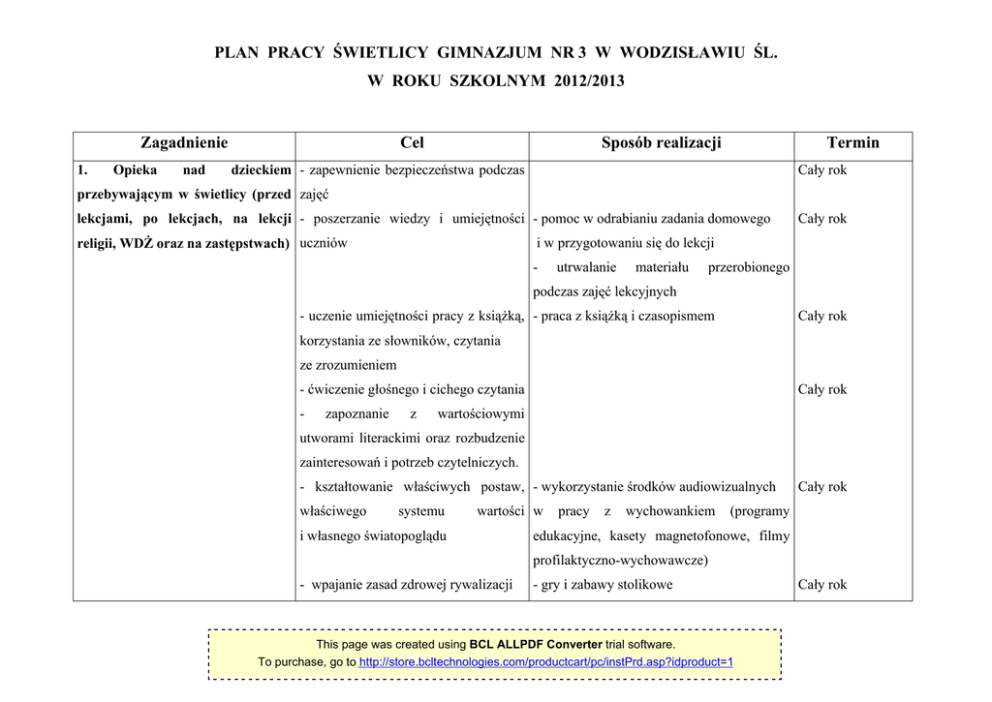 Plan pracy świetlicy Gimnazjum nr 3 20122013