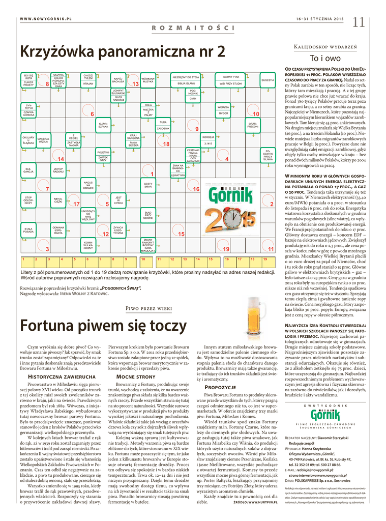 W W W.NOW YGORNIK.PL 16 –31 S T YC Z N I A 2 015 R O Z M A I T O Ś C I Krzyżówka panoramiczna nr 2 11 Kalejdoskop wydarzeń To i owo Od czasu przystąpienia Polski do Unii Europejskiej 11 proc. Polaków wyjeżdżało czasowo do pracy za granicę. Nadal co setny Polak zarabia w ten sposób, nie licząc tych, którzy tam mieszkają i pracują. A z tej grupy prawie połowa nie chce już wracać do kraju. Ponad 380 tysięcy Polaków pracuje teraz poza granicami kraju, a co setny zarabia za granicą. Najczęściej w Niemczech, które pozostają najpopularniejszym kierunkiem wyjazdów zarobkowych. Tam kieruje się 45 proc. ankietowanych. Na drugim miejscu znalazła się Wielka Brytania (26 proc.), a na trzecim Holandia (10 proc.). Niewiele mniejsza liczba migrantów zarobkowych pracuje w Belgii (9 proc.). Powyższe dane nie uwzględniają całej emigracji zarobkowej, gdyż objęły tylko osoby mieszkające w kraju – bez ponad dwóch milionów Polaków, którzy po 2004 roku wyemigrowali za pracą. W minionym roku w głównych gospodarkach unijnych energia elektryczna potaniała o ponad 17 proc., a gaz o 20 proc. Tendencja taka utrzymuje się też w styczniu. W Niemczech elektryczność (33,40 euro/MWh) potaniała o 9 proc. w stosunku do listopada i 6 proc. rok do roku. Energetyka wiatrowa korzystała z doskonałych w grudniu warunków pogodowych (silne wiatry), co wpłynęło na obniżenie cen produkowanej energii. We Francji prąd potaniał rok do roku o 17 proc. Główny dostawca energii – koncern EDF – bazuje na elektrowniach jądrowych. Zwiększył produkcję rok do roku o 2,3 proc., ale cena poszła w końcu roku w górę z powodu mroźnego grudnia. Mieszkańcy Wielkiej Brytanii płacili o 10 euro drożej za prąd od Niemców, choć i tu rok do roku prąd staniał o 15 proc. Główne paliwo w elektrowniach brytyjskich – gaz – było tańsze aż o 23 proc. Ceny gazu w grudniu 2014 roku były na europejskim rynku o 20 proc. niższe niż rok wcześniej. Tendencja spadkowa cen gazu utrzymuje się też w styczniu. Sprzyjają temu ciepła zima i gwałtowne tanienie ropy na świecie. Cena rosyjskiego gazu, który zaspokaja blisko 30 proc. popytu Europy, związana jest z ceną ropy w okresie półrocznym. Rozwiązanie poprzedniej krzyżówki brzmi: „Pogodnych Świąt”. Nagrodę wylosowała: Irena Wolny z Katowic. Piwo przez wieki Fortuna piwem się toczy Czym wyróżnia się dobre piwo? Co wywołuje uznanie piwoszy? Jak sprawić, by smak trunku został zapamiętany? Odpowiedzi na te i inne pytania doskonale znają przedstawiciele Browaru Fortuna w Miłosławiu. H istoryczna zawierucha Piwowarstwo w Miłosławiu sięga pierwszej połowy XVII wieku. Od początku trunek z tej okolicy miał swoich zwolenników zarówno w kraju, jak i na świecie. Prawdziwym przełomem był rok 1889. Wówczas, z inicjatywy Władysława Rabskiego, wybudowano tutaj nowoczesny browar parowy Fortuna. Było to przedsięwzięcie znaczące, ponieważ stanowiło jeden z kroków Polaków przeciwko germanizacji wielkopolskiego przemysłu. W kolejnych latach browar trafiał z rąk do rąk, aż w 1939 roku został zagarnięty przez hitlerowców i trafił pod zarząd niemiecki. Po zakończeniu II wojny światowej przedsiębiorstwo zostało upaństwowione i stało się własnością Wielkopolskich Zakładów Piwowarskich w Poznaniu. Czas ten odbił się negatywnie na zakładzie, a piwo tu produkowane, cieszące się od stuleci dobrą renomą, stało się przeszłością. Wszystko zmieniło się w 1995 roku, kiedy browar trafił do rąk prawowitych, przedwojennych właścicieli. Rozpoczęły się starania o przywrócenie zakładowi dawnej sławy. Pierwszym krokiem było powstanie Browaru Fortuna Sp. z o.o. W 2011 roku przedsiębiorstwo zostało zakupione przez jedną ze spółek, która wspomaga browar merytorycznie w zakresie produkcji i sprzedaży piwa. M ocne strony Browarnicy z Fortuny, produkując swoje trunki, wychodzą z założenia, że na uwarzenie znakomitego piwa składa się kilka bardzo ważnych rzeczy. Przede wszystkim stawia się tutaj na sto procent naturalności. Wszystkie surowce wykorzystywane w produkcji piw to produkty wysokiej jakości i naturalnego pochodzenia. Właśnie składniki takie jak wyciąg z orzechów drzewa kola czy sok z dojrzałych śliwek wpływają na wyróżniający się smak tutejszych piw. Kolejną ważną sprawą jest kultywowanie tradycji. Metody warzenia piwa są bardzo zbliżone do tych, które stosowano w XIX wieku. Fortuna może poszczycić się tym, że jako jeden z kilkunastu browarów w Europie stosuje otwartą fermentację drożdży. Proces ten odbywa się spokojnie i w bardzo niskich temperaturach. Trwa ok. 12–14 dni i nie jest niczym przyspieszany. Dzięki temu drożdże mają swobodny dostęp tlenu, co wpływa na ich żywotność i w rezultacie także na smak piwa. Ponadto browarnicy stosują powtórną fermentację w butelce. Innym atutem miłosławskiego browaru jest samodzielne palenie ciemnego słodu. Wpływa to na możliwość dostosowania stopnia palenia słodu do charakteru danego produktu. Browarnicy mają także gwarancję, że trafiający do ich trunków składnik jest świeży i aromatyczny. P ropozycje Piwa Browaru Fortuna to produkty skierowane przede wszystkim do tych, którzy pragną czegoś odmiennego niż to, co jest w supermarketach. W ofercie znajdziemy trzy marki piw: Fortuna, Miłosław i Komes. Wśród trunków spod znaku Fortuny znajdziemy m.in. Fortunę Czarne, które należy do ciemnych piw słodowych. Na uwagę zasługują tutaj także piwa smakowe, jak Fortuna Mirabelka czy Wiśnia, do produkcji których użyto naturalnych soków z dojrzałych, soczystych owoców. Wśród piw Miłosław znajdziemy ciemne Pszeniczne, Koźlaka i jasne Niefiltrowane, wszystkie pochodzące z otwartej fermentacji. Komesy to przede wszystkim mocne piwa górnej fermentacji, jak np. Porter Bałtycki, leżakujący przynajmniej trzy miesiące, czy Potrójny Zł