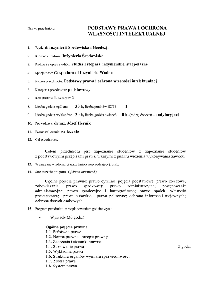PODSTAWY PRAWA I OCHRONA WŁASNOŚCI INTELEKTUALNEJ Nazwa przedmiotu: Inżynierii Środowiska i Geodezji 1. Wydział: 2. Kierunek studiów: 3. Rodzaj i stopień studiów: studia 4. Specjalność: 5. Nazwa przedmiotu: 6. Kategoria przedmiotu: podstawowy 7. Rok studiów 1, Semestr: 8. Liczba godzin ogółem: 30 h, liczba punktów ECTS 9. Liczba godzin wykładów: 30 h, liczba godzin ćwiczeń Inżynieria Środowiska I stopnia, inżynierskie, stacjonarne Gospodarna i Inżynieria Wodna Podstawy prawa i ochrona własności intelektualnej 10. Prowadzący: dr inż. 11. Forma zaliczenia: 2 2 0 h, (rodzaj ćwiczeń – audytoryjne) Józef Hernik zaliczenie 12. Cel przedmiotu: Celem przedmiotu jest zapoznanie studentów z zapoznanie studentów z podstawowymi przepisami prawa, ważnymi z punktu widzenia wykonywania zawodu. 13. Wymagane wiadomości (przedmioty poprzedzające): brak. 14. Streszczenie programu (główna zawartość): Ogólne pojęcia prawne; prawo cywilne (pojęcia podstawowe, prawo rzeczowe, zobowiązania, prawo spadkowe); prawo administracyjne; postępowanie administracyjne; prawo geodezyjne i kartograficzne; prawo spółek; własność przemysłowa; prawa autorskie i prawa pokrewne; ochrona informacji niejawnych; ochrona danych osobowych. 15. Program przedmiotu z rozplanowaniem godzinowym: - Wykłady (30 godz.) 1. Ogólne pojęcia prawne 1.1. Państwo i prawo 1.2. Norma prawna i przepis prawny 1.3. Zdarzenia i stosunki prawne 1.4. Stosowanie prawa 1.5. Wykładnia prawa 1.6. Struktura organów wymiaru sprawiedliwości 1.7. Źródła prawa 1.8. System prawa 3 godz. 2. Prawo cywilne 2.1. Część ogólna prawa cywilnego 2.1.1. Osoby fizyczne i prawne 2.1.2 Czynności prawne 2.1.3 Przedstawicielstwo 2.2. Prawo rzeczowe 2.2.1 Pojęcie i rodzaje nieruchomości 2.2.2 Własność 2.2.3 Współwłasność 2.2.4 Użytkowanie wieczyste 2.2.5 Służebność gruntowa 2.2.6 Posiadanie 2.3. Zobowiązania 2.3.1 Pojęcie i rodzaje zobowiązań 2.3.2 Źródła zobowiązań 2.3.3 Wykonanie zobowiązań 2.3.4 Zabezpieczenie wykonania zobowiązań 2.4. Prawo spadkowe 2.4.1. Podstawowe pojęcia 3. Prawo administracyjne 3.1 Organy administracji publicznej 3.2 Podstawowe formy działania administracji publicznej 4. Postępowanie administracyjne 4.1 Zasady postępowania administracyjnego 4.2 Strona 4.3 Rozprawa 4.4 Decyzja 4.5 Postanowienie 4.6 Ugoda 4.7 Odwołanie 4.8 Zażalenie 5. Prawo geodezyjne i kartograficzne 5.1 Ustawa Prawo geodezyjne i kartograficzne 5.2 Umowy oroboty geodezyjne i kartograficzne 6. Prawo spółek 6.1 Spółki osobowe 6.2 Spółki kapitałowe 7. Ochrona własności intelektualnej 7.1 Własność przemysłowa 7.2 Prawa autorskie i prawa pokrewne 7.3. Ochrona informacji niejawnych 7.4 Ochrona danych osobowych 8. Zaliczenie 9 godz. 4 godz. 4 godz. 2 godz. 2 godz. 4 godz. 2 godz. 16. Zalecana literatura: 1. 2. 3. 4. Grzybowski S. 1989. Prawo cywilne - zarys prawa rzeczowego. Warszawa, PWN. Kodeks cywilny. stan prawny na 1 stycznia 2008r. Siuda W. 1993. Elementy prawa dla ekonomistów. Warszawa, PWN Służewski J., 1992. Polskie prawo administracyjne. Warszawa, PWN. 17. Uzyskane umiejętności: W ramach prowadzonych wykładów studenci zdobędą podstawowe formalne umiejętności prowadzenia działalności gospodarczej i pracy w publicznej administracji, firmach związanych z inżynierią środowiska. 18. Opublikowany dorobek prowadzących przedmiot w tym zakresie: 1. 2. 3. 4. 5. 6. 7. 8. 9. 10. 11. 12. 13. 14. 15. Hernik J. Zasadność zawierania umowy ubezpieczenia odpowiedzialności cywilnej geodety z tytułu wykonywania czynności zawodowych. Przegląd Geodezyjny, 5, 1996. Hernik J. Pojęcie gospodarstwa rolnego w ujęciu funkcjonalnym. Zesz. Naukowe AR w Krakowie, s. Geodezja, 15, 1996. Hernik J. Ochrona sprzętu geodezyjnego – zagadnienia prawne. Przeg. Geod. 4, 1997. Hernik J. Kompetencje gminy w dziedzinie ochrony i kształtowania środowiska. Roczniki AR w Poznaniu, CCXCIV, 1997. Hernik J. Miejsce ogólnych warunków ubezpieczenia odpowiedzialności cywilnej geodety z tytułu czynności zawodowych na rynku ubezpieczeniowym. Przeg. Geod. 12, 1997. Hernik J. Prawna regulacja ilościowej ochrony gruntów rolnych i leśnych w warunkach gospodarki rynkowej. Zesz. Nauk. AR we Wrocławiu, 312, 1997. Hernik J. Zalesienie a ochrona gruntów rolnych. Zesz. Nauk. AR w Krakowie, s. Geodezja, 16, 1997. Hernik J. Przesłanki odpowiedzialności cywilnej geodety z tytułu wykonywania czynności zawodowych na przykładzie warunków ubezpieczenia. Przeg. Geod. 8, 1998. Hernik J. Ubezpieczenia geodetów od odpowiedzialności cywilnej, Dom Wydawniczy ABC, Warszawa, 1999. Hernik J. Prawo geodezyjne i kartograficzne. Wybrane przepisy dla studentów Akademii Rolniczej. Wyd. Szkoła Wiedzy o Terenie, Kraków, 2000. Hernik J., Kijania E. Potrzeba nowelizacji ustawy o przekształceniu prawa użytkowania wieczystego w prawo własności na przykładzie Gminy Kraków. Przeg. Geoid. 8, 2001. Hernik J., Kijania E. Zakres podmiotowy przekształcenia użytkowania wieczystego w prawo własności na podstawie przepisów ustawy z dnia 4. 09. 1997 r. Wycena, 1 (56), 2002. Hernik J. 2006. Stosunki cywilnoprawne. In: Szacowanie nieruchomości. Pod red. J Dydenki. Wolters Kluwer Polska – Dom Wydawniczy ABC. 71-80. Hernik J. 2006. Księgi wieczyste i hipoteka. In: Szacowanie nieruchomości. Pod red. J Dydenki. Wolters Kluwer Polska – Dom Wydawniczy ABC. 89-99. Hernik J., Olejniczak G. 2006. Planowanie przestrzenne w RFN. Oficyna Wydawnicza Branta. Bydgoszcz – Kraków.