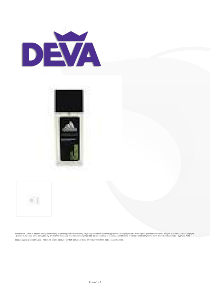 Adidas Pure Game to zapach emocji oraz ciepłej rozgrzanej ziemi Południowej Afryki.Zapach otwiera zaskakująca mieszanka grejpfruta i mandarynki, podkreślona zieloną bazylią oraz ostrą, świeżą papryką i pieprzem. W nucie serca odnajdziemy promienną elegancję oraz nowoczesną męskość, dzięki zawartej w zapachu aromatycznej lawendzie oraz leśnym akordom drzewa gwajakowego i cyprysu. Nuta bazowa ujawnia uzależniającą i naturalną stronę paczuli i tamboti połączonych ze zmysłowymi nutami bobu tonka i kadzidła. Strona 1 z 1
