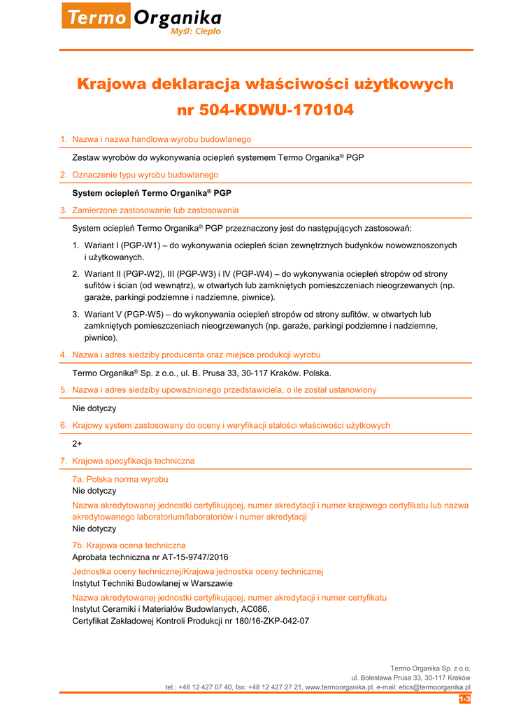Krajowa deklaracja właściwości użytkowych nr 504-KDWU-170104 1. Nazwa i nazwa handlowa wyrobu budowlanego Zestaw wyrobów do wykonywania ociepleń systemem Termo Organika® PGP 2. Oznaczenie typu wyrobu budowlanego System ociepleń Termo Organika® PGP 3. Zamierzone zastosowanie lub zastosowania System ociepleń Termo Organika® PGP przeznaczony jest do następujących zastosowań: 1. Wariant I (PGP-W1) – do wykonywania ociepleń ścian zewnętrznych budynków nowowznoszonych i użytkowanych. 2. Wariant II (PGP-W2), III (PGP-W3) i IV (PGP-W4) – do wykonywania ociepleń stropów od strony sufitów i ścian (od wewnątrz), w otwartych lub zamkniętych pomieszczeniach nieogrzewanych (np. garaże, parkingi podziemne i nadziemne, piwnice). 3. Wariant V (PGP-W5) – do wykonywania ociepleń stropów od strony sufitów, w otwartych lub zamkniętych pomieszczeniach nieogrzewanych (np. garaże, parkingi podziemne i nadziemne, piwnice). 4. Nazwa i adres siedziby producenta oraz miejsce produkcji wyrobu Termo Organika® Sp. z o.o., ul. B. Prusa 33, 30-117 Kraków. Polska. 5. Nazwa i adres siedziby upoważnionego przedstawiciela, o ile został ustanowiony Nie dotyczy 6. Krajowy system zastosowany do oceny i weryfikacji stałości właściwości użytkowych 2+ 7. Krajowa specyfikacja techniczna 7a. Polska norma wyrobu Nie dotyczy Nazwa akredytowanej jednostki certyfikującej, numer akredytacji i numer krajowego certyfikatu lub nazwa akredytowanego laboratorium/laboratoriów i numer akredytacji Nie dotyczy 7b. Krajowa ocena techniczna Aprobata techniczna nr AT-15-9747/2016 Jednostka oceny technicznej/Krajowa jednostka oceny technicznej Instytut Techniki Budowlanej w Warszawie Nazwa akredytowanej jednostki certyfikującej, numer akredytacji i numer certyfikatu Instytut Ceramiki i Materiałów Budowlanych, AC086, Certyfikat Zakładowej Kontroli Produkcji nr 180/16-ZKP-042-07 Termo Organika Sp. z o.o. ul. Bolesława Prusa 33, 30-117 Kraków tel.: +48 12 427 07 40, fax: +48 12 427 27 21, www.termoorganika.pl, e-mail: [email protected] 1-3 Krajowa deklaracja właściwości użytkowych nr 504-KDWU-170104 8. Deklarowane właściwości użytkowe Tablica 1: W przypadku systemu Termo Organika® PGP-W1 Zasadnicze charakterystyki wyrobu budowlanego dla zamierzonego zastosowania lub zastosowań Deklarowane właściwości użytkowe Wodochłonność po 1 h, g/m 2: warstwa zbrojona warstwa wierzchnia < 300 < 300 Wodochłonność po 24 h, g/m2: warstwa zbrojona warstwa wierzchnia < 500 600 Przepuszczalność pary wodnej – opór dyfuzyjny względny, m Mrozoodporność warstwy wierzchniej Odporność na uderzenie, po starzeniu, układ: z tynkiem Termo Organika® TO-TM / TO-TMm z tynkiem Termo Organika® TO-TP / TO-TPm z tynkiem Termo Organika® TO-TSA / TO-TSAm z tynkiem Termo Organika® TO-TSS / TO-TSSm z tynkiem Termo Organika® TO-TSISI / TO-TSISIm Przyczepność warstwy wierzchniej do wełny mineralnej, MPa3): w warunkach laboratoryjnych po starzeniu po cyklach mrozoodporności 1 brak zniszczeń typu: rysy, wykruszenia, odspojenia, spęcherzenia kategoria I kategoria I kategoria I1) / II2) kategoria I1) / II2) kategoria I 0,08 0,08 0,08 Klasyfikacja ogniowa w zakresie reakcji na ogień4) A2 – s3, d0 Odporność na obciążenie wiatrem5) wg tablicy 3 1) 2) 3) 4) 5) Uwagi w przypadku układu z płytami lamelowymi w przypadku układu z płytami zwykłymi badania z płytami MW o TR 80 klasyfikacja dotyczy układów ociepleniowych na podłożach niepalnych (co najmniej klasy A2–s3,d0 reakcji na ogień według normy PN-EN 13501-1+A1:2010) w przypadku systemów mocowanych mechanicznie Tablica 2: W przypadku systemów Termo Organika® PGP-W2, Termo Organika® PGP-W3, Termo Organika® PGP-W4 i Termo Organika® PGP-W5 Zasadnicze charakterystyki wyrobu budowlanego dla zamierzonego zastosowania lub zastosowań Przepuszczalność pary wodnej – opór dyfuzyjny względny, m Mrozoodporność warstwy wierzchniej Przyczepność warstwy wierzchniej do wełny mineralnej, MPa1): w warunkach laboratoryjnych po cyklach mrozoodporności 2-3 Deklarowane właściwości użytkowe wariant wariant wariant wariant W2 W3 W4 W5 1 brak zniszczeń typu: rysy, wykruszenia, odspojenia, spęcherzenia 0,08 0,08 Uwagi Krajowa deklaracja właściwości użytkowych nr 504-KDWU-170104 Zasadnicze charakterystyki wyrobu budowlanego dla zamierzonego zastosowania lub zastosowań Odporność na uderzenie, po starzeniu, kategoria Deklarowane właściwości użytkowe I2) / II3) III III − Klasyfikacja ogniowa w zakresie reakcji na ogień4) A2 – s3, d0 Odporność na obciążenie wiatrem5) wg tablicy 3 1) 2) 3) 4) 5) Uwagi wariant wariant wariant wariant W2 W3 W4 W5 badania z płytami MW o TR 80 w przypadku układu z płytami lamelowymi w przypadku układu z płytami zwykłymi klasyfikacja dotyczy układów ociepleniowych na podłożach niepalnych (co najmniej klasy A2–s3,d0 reakcji na ogień według normy PN-EN 13501-1+A1:2010 w przypadku systemów mocowanych mechanicznie Tablica 3: Dotyczy łączników mocowanych na powierzchni płyt ≥ 60 mm Średnica talerzyka ≥ 1,2 Obciążenie niszczące talerzyk, kN Sztywność talerzyka, kN/mm Właściwości płyt zwykłych z wełny mineralnej Siła niszcząca, kN ≥ 0,30 Grubość płyt ≥ 50 mm Wytrzymałość na rozciąganie prostopadle do powierzchni czołowych (TR) ≥ 10 kPa Łączniki nie usytuowane na stykach płyt (badanie na przeciąganie łączników), warunki suche Rpanel Minimalna: Średnia: 0,287 0,324 Łączniki usytuowane na stykach płyt (badanie oddziaływania statycznego przez blok piankowy; schemat 2b wg ETAG 004), warunki suche Rjoint Minimalna: Średnia: 0,265 0,273 9. Właściwości użytkowe określonego powyżej wyrobu są zgodne z wszystkimi wymienionymi w pkt 8 deklarowanymi właściwościami użytkowymi. Niniejsza krajowa deklaracja właściwości użytkowych wydana zostaje zgodnie z ustawą z dnia 16 kwietnia 2004 r. o wyrobach budowlanych, na wyłączną odpowiedzialno