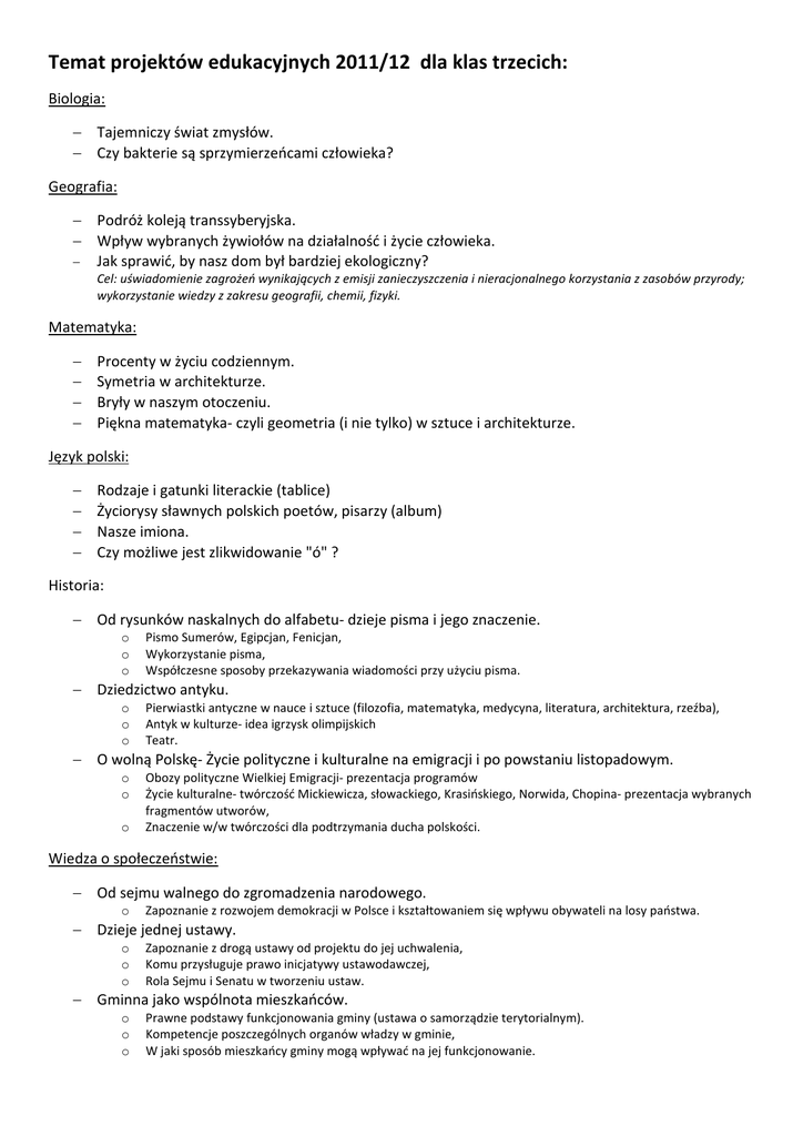 Temat projektów edukacyjnych 2011/12 dla klas trzecich: Biologia: − Tajemniczy świat zmysłów. − Czy bakterie są sprzymierzeńcami człowieka? Geografia: − Podróż koleją transsyberyjska. − Wpływ wybranych żywiołów na działalność i życie człowieka. − Jak sprawić, by nasz dom był bardziej ekologiczny? Cel: uświadomienie zagrożeń wynikających z emisji zanieczyszczenia i nieracjonalnego korzystania z zasobów przyrody; wykorzystanie wiedzy z zakresu geografii, chemii, fizyki. Matematyka: − − − − Procenty w życiu codziennym. Symetria w architekturze. Bryły w naszym otoczeniu. Piękna matematyka- czyli geometria (i nie tylko) w sztuce i architekturze. Język polski: − − − − Rodzaje i gatunki literackie (tablice) Życiorysy sławnych polskich poetów, pisarzy (album) Nasze imiona. Czy możliwe jest zlikwidowanie "ó" ? Historia: − Od rysunków naskalnych do alfabetu- dzieje pisma i jego znaczenie. o o o Pismo Sumerów, Egipcjan, Fenicjan, Wykorzystanie pisma, Współczesne sposoby przekazywania wiadomości przy użyciu pisma. − Dziedzictwo antyku. o o o Pierwiastki antyczne w nauce i sztuce (filozofia, matematyka, medycyna, literatura, architektura, rzeźba), Antyk w kulturze- idea igrzysk olimpijskich Teatr. − O wolną Polskę- Życie polityczne i kulturalne na emigracji i po powstaniu listopadowym. o o o Obozy polityczne Wielkiej Emigracji- prezentacja programów Życie kulturalne- twórczość Mickiewicza, słowackiego, Krasińskiego, Norwida, Chopina- prezentacja wybranych fragmentów utworów, Znaczenie w/w twórczości dla podtrzymania ducha polskości. Wiedza o społeczeństwie: − Od sejmu walnego do zgromadzenia narodowego. o Zapoznanie z rozwojem demokracji w Polsce i kształtowaniem się wpływu obywateli na losy państwa. − Dzieje jednej ustawy. o o o Zapoznanie z drogą ustawy od projektu do jej uchwalenia, Komu przysługuje prawo inicjatywy ustawodawczej, Rola Sejmu i Senatu w tworzeniu ustaw. − Gminna jako wspólnota mieszkańców. o o o Prawne podstawy funkcjonowania gminy (ustawa o samorządzie terytorialnym). Kompetencje poszczególnych organów władzy w gminie, W jaki sposób mieszkańcy gminy mogą wpływać na jej funkcjonowanie. Język rosyjski: − Moskwa w pigułce- przewodnik po stolicy Rosji − Czy Rosja jest krajem atrakcyjnym dla turystów? (Prezentacja multimedialna) − Tradycje i zwyczaje świąteczne w Rosji Język angielski: − Brytyjska rodzina królewska (historia, obyczaje, obowiązki) − Najciekawsze miejsce w Wielkiej Brytanii (aspekty geograficzne, turystyczne, historyczne) − Zagrożone gatunki zwierząt w Australii Chemia: − Metody konserwacji żywności − Czy wiesz co jesz? Czyli chemiczne dodatki do żywności. Fizyka: − Jak maszyny proste pomagają człowiekowi. Cele: Przedstawić i poprzeć przykładami jak od starożytności ludzie konstruowali i wykorzystywali maszyny proste do pracy. − Każdy może oszczędzać energię elektryczną. Opiekunowie projektu: B. Śpiewakowska, J. Kietlińska Cele: uświadomienie uczniom gdzie i do czego (w gospodarstwie domowym) najwięcej energii elektrycznej się zużywa i znalezienie sposobów jej oszczędzania. Zajęcia techniczne: − Opracowanie zestawów żywieniowych dla pracujących w warunkach obciążenia fizycznego. − Odnawialne źródła energii – nadzieja ekologicznego świata. − Każdy może oszczędzać energię elektryczną. Opiekunowie projektu: B. Śpiewakowska, J. Kietlińska Cele: uświadomienie uczniom gdzie i do czego (w gospodarstwie domowym) najwięcej energii elektrycznej się zużywa i znalezienie sposobów jej oszczędzania. Plastyka: − Najpiękniejsze kobiety świata „zaklęte” w dziełach sztuki. − Zaręby Kościelne dawniej i dziś. Informatyka, geografia, historia: − Przewodnik turystyczny po gminie Zaręby Kościelne. Cel: Efektem pracy powinien być przewodnik turystyczny w wersji papierowej i internetowej, zawierający opisy, zdjęcia, mapy, najciekawszych pod względem historycznym, krajobrazowym i turystycznym miejsc i obiektów; punktów gastronomicznych, noclegowych, szlaków, itp. Przewodnik powinien przedstawiać walory turystyczne gminy i zachęcić potencjalnych turystów do przyjazdu w nasze strony. Wychowani fizyczne: − Co wiem o otyłości i nadmiernym odchudzaniu się? − Pierwsza pomoc przedmedyczna. − Negatywny wpływ stosowania dopingu na organizm człowieka.