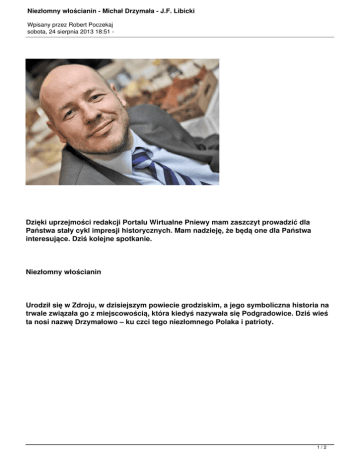 Niezłomny włościanin - Michał Drzymała - J.F. Libicki Wpisany przez Robert Poczekaj sobota, 24 sierpnia 2013 18:51 - Dzięki uprzejmości redakcji Portalu Wirtualne Pniewy mam zaszczyt prowadzić dla Państwa stały cykl impresji historycznych. Mam nadzieję, że będą one dla Państwa interesujące. Dziś kolejne spotkanie. Niezłomny włościanin Urodził się w Zdroju, w dzisiejszym powiecie grodziskim, a jego symboliczna historia na trwale związała go z miejscowością, która kiedyś nazywała się Podgradowice. Dziś wieś ta nosi nazwę Drzymałowo – ku czci tego niezłomnego Polaka i patrioty. 1/2 Niezłomny włościanin - Michał Drzymała - J.F. Libicki Wpisany przez Robert Poczekaj sobota, 24 sierpnia 2013 18:51 - 1857-1937 Michał włościan, jaki możliwości właściciela Drzymała urodził właśnie zbudowania – zsymbolika władzami otym w w którym miejscowości, roku domu 1857.Trwałe tu Królestwa na mowa działce, która –polskich jeden Prus, miejsce którą – od zgermanizacji roku najbardziej polski latach w historii 1939 włościanin 1904 -pojazd walki znanych, nosi –go 1909. nazwę o kupił polskość Spór XIX od niemieckiego ten przyniósł dotyczył polskich mu dom. Pruskie ono ułatwić starań, którym ten odpowiedzi odległość jednak stojąc zamieszkał. proces zgody prawo utrzymując stosowane na wdomem, takiej jednym germanizacji wymagało to, zaradny Wtedy nie w miejscu niezwykle mógł ten bowiem to Wielkopolanin, sposób, tych otrzymać. pruska dłużej terenów. wybiórczo zgody iż administracja niż jako Na 24 miejscowej codziennie Michał znak ruchomy, godziny izamieszkał zw korzyścią protestu Drzymała – administracji jego przesuwał de dla facto nabył – ludności jako narusza wówczas ukarać swój nie na Polak wzniesienie może pojazd niemieckiej argumentując, przepisy –wiecznych wóz mimo być cyrkowy, uznawany niewielką budowlane. usilnych budynku. tak, aby że w wóz za Było W5 Spór lat sławny jakimś stojącym pozwoleń. i –prowadził kiedy sądowo czasie już już wreszcie wtedy –ion tę administracyjny wóz, zburzono, dzięki uparty ostatnim czemu zdecydował Wielkopolanin między – pod ominął pretekstem Drzymałą, się w ostatecznie ten sposób ausiłowała drobnych władzami w na konieczność prowizorycznej sprzedaż uchybień pruskimi działki stosownych -Drzymałowo. toczył udało lepiance. i na kupno się się przez usunąć, Kiedy, ziemi ponad ze po Niezłomna stając stawali Henryk oporu zakładów Drzymały się między Sienkiewicz. symbolem stolarskich walka innymi i się Michała Do polskiego w tak Wyrzysku, tych Drzymały wybitni, jego znanych oporu postawy ówcześni nie stała przeciw chciał się były Polacy podjąć już tak pisarzy jednak duże, jak się dołączył Maria wykonania niezwykle że w po Konopnicka, zaborze jego też głośna jego Lew śmierci pruskim. trumny. Tołstoj. w Bolesław żaden Europie W Znaczenie jego zurzędowych niemieckich Prus i 80, świecie, obronie czy pochowany Drzymała, został kawaler w Miasteczku Orderu Krajeńskim. Odrodzenia Polski, zmarł w roku 1937, w wieku lat aspór, 2/2