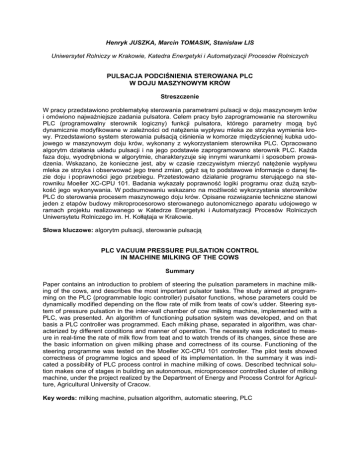 Henryk JUSZKA, Marcin TOMASIK, Stanisław LIS Uniwersytet Rolniczy w Krakowie, Katedra Energetyki i Automatyzacji Procesów Rolniczych PULSACJA PODCIŚNIENIA STEROWANA PLC W DOJU MASZYNOWYM KRÓW Streszczenie W pracy przedstawiono problematykę sterowania parametrami pulsacji w doju maszynowym krów i omówiono najważniejsze zadania pulsatora. Celem pracy było zaprogramowanie na sterowniku PLC (programowalny sterownik logiczny) funkcji pulsatora, którego parametry mogą być dynamicznie modyfikowane w zależności od natężenia wypływu mleka ze strzyka wymienia krowy. Przedstawiono system sterowania pulsacją ciśnienia w komorze międzyściennej kubka udojowego w maszynowym doju krów, wykonany z wykorzystaniem sterownika PLC. Opracowano algorytm działania układu pulsacji i na jego podstawie zaprogramowano sterownik PLC. Każda faza doju, wyodrębniona w algorytmie, charakteryzuje się innymi warunkami i sposobem prowadzenia. Wskazano, że konieczne jest, aby w czasie rzeczywistym mierzyć natężenie wypływu mleka ze strzyka i obserwować jego trend zmian, gdyż są to podstawowe informacje o danej fazie doju i poprawności jego przebiegu. Przetestowano działanie programu sterującego na sterowniku Moeller XC-CPU 101. Badania wykazały poprawność logiki programu oraz dużą szybkość jego wykonywania. W podsumowaniu wskazano na możliwość wykorzystania sterowników PLC do sterowania procesem maszynowego doju krów. Opisane rozwiązanie techniczne stanowi jeden z etapów budowy mikroprocesorowo sterowanego autonomicznego aparatu udojowego w ramach projektu realizowanego w Katedrze Energetyki i Automatyzacji Procesów Rolniczych Uniwersytetu Rolniczego im. H. Kołłątaja w Krakowie. Słowa kluczowe: algorytm pulsacji, sterowanie pulsacją PLC VACUUM PRESSURE PULSATION CONTROL IN MACHINE MILKING OF THE COWS Summary Paper contains an introduction to problem of steering the pulsation parameters in machine milking of the cows, and describes the most important pulsator tasks. The study aimed at programming on the PLC (programmable logic controller) pulsator functions, whose parameters could be dynamically modified depending on the flow rate of milk from teats of cow’s udder. Steering system of pressure pulsation in the inter-wall chamber of cow milking machine, implemented with a PLC, was presented. An algorithm of functioning pulsation system was developed, and on that basis a PLC controller was programmed. Each milking phase, separated in algorithm, was characterized by different conditions and manner of operation. The necessity was indicated to measure in real-time the rate of milk flow from teat and to watch trends of its changes, since these are the basic information on given milking phase and correctness of its course. Functioning of the steering programme was tested on the Moeller XC-CPU 101 controller. The pilot tests showed correctness of programme logics and speed of its implementation. In the summary it was indicated a possibility of PLC process control in machine milking of cows. Described technical solution makes one of stages in building an autonomous, microprocessor controlled cluster of milking machine, under the project realized by the Department of Energy and Process Control for Agriculture, Agricultural University of Cracow. Key words: milking machine, pulsation algorithm, automatic steering, PLC