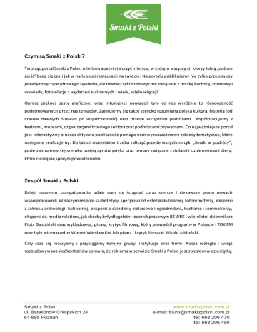 Czym są Smaki z Polski? Tworząc portal Smaki z Polski mieliśmy apetyt stworzyd miejsce, w którym wszyscy ci, którzy lubią „dobrze zjeśd” będą się czuli jak w najlepszej restauracji na świecie. Na portalu publikujemy nie tylko przepisy czy porady dotyczące zdrowego żywienia, ale również cykle tematyczne związane z polską kuchnią, rozmowy i wywiady, fotorelacje z wydarzeo kulinarnych i wiele, wiele więcej! Oprócz pięknej szaty graficznej oraz intuicyjnej nawigacji tym co nas wyróżnia to różnorodnośd podejmowanych przez nas tematów. Zajmujemy się także szeroko rozumianą polską kulturą, historią (od czasów dawnych Słowian po współczesnośd) oraz przede wszystkim podróżami. Współpracujemy z teatrami, muzeami, organizacjami trzeciego sektora oraz podmiotami prywatnymi. Co najważniejsze portal jest interaktywny a nasza aktywna publicznośd pomaga nam wyznaczad nowe zakresy tematyczne, które następnie realizujemy. Do takich materiałów trzeba zaliczyd przede wszystkim cykl „Smaki w podróży”, gdzie zajmujemy się szeroko pojętą agroturystyką oraz tematy związane z ziołami i suplementami diety, które cieszą się sporym powodzeniem. Zespół Smaki z Polski Dzięki naszemu zaangażowaniu udaje nam się ściągnąd coraz szersze i ciekawsze grono nowych współpracownik. W naszym zespole są dietetycy, specjaliści od estetyki kulinarnej, fotoreporterzy, eksperci z zakresu archeologii kulinarnej, eksperci z dziedziny zielarstwa i ogrodnictwa, kucharze i sommelierzy, eksperci ds. media relations, jak chodby były długoletni rzecznik prasowym BZ WBK i wieloletni dziennikarz Piotr Gajdzioski oraz wykładowca, pisarz, krytyk filmowy, który prowadził programy w Polsacie i TOK FM oraz były wicenaczelny Wprost Wiesław Kot lub pisarz i krytyk literacki Witold Jabłooski. Cały czas się rozwijamy i przyciągamy kolejne grupy, instytucje oraz firmy. Nasza rozległa i wciąż rozbudowywana sied kontaktów sprawia, że reklama w serwisie Smaki z Polski jest strzałem w dziesiątkę. Co oferują Smaki z Polski? Oferujemy Paostwu szeroki wachlarz form promocji. Każdy może wybrad dogodną dla siebie reklamę! pakiet artykułów sponsorowanych (lub pojedynczy artykuł): wybierz tematy, prześlij nam informację, określ czas publikacji, formę (rozmowa, artykuł, fotogaleria, itp.), prześlij zdjęcia, żeby przygotowad slider i zareklamuj swój produkt w najbardziej skuteczny sposób na rynku! Nie masz czasu na powyższe działania? Nie ma problemu. Wszystko to zrobimy za Ciebie! Twój artykuł będzie znajdował się na naszej stronie głównej przez trzy dni. Zajmiemy się również promocją tego artykułu w Internecie, używając do tego wszelkich możliwych kanałów marketingu online, włącznie z naszą unikatową siecią internetowych współpracowników. Dzięki niej dotrzesz ze swoją reklamą dalej, pewniej. I będziesz wiarygodny. Co najważniejsze: nigdy nie usuwamy materiałów, które opublikujemy. Dzięki temu Twój materiał będzie już zawsze dostępny w sieci, a Ty płacisz za niego tylko raz! reklama w formie baneru: skontaktuj się z nami w celu wybrania miejsca, w którym ma się pojawid Twój baner, ustalenia jak długo ma znajdowad się na portalu Smaki z Polski oraz uzgodnienia warunków dodatkowych. przedruk materiału: prowadzisz pismo branżowe, a my akurat trafiliśmy w zakres jego problematyki? Byd może prowadzisz serwis internetowy, gazetę regionalną lub ogólnopolską, a przedstawiony przez nas materiał po prostu przypadł Ci do gustu? Skontaktuj się z nami i ustal warunki przedruku! przygotowujesz ważne wydarzenie z zakresu związanym z problematyką poruszaną na naszym portalu i chcesz z tym dotrzed do szerokiej publiczności? Skontaktuj się z nami a na pewno uzgodnimy dogodne dla obu stron warunki współpracy. Chciałbyś nieinwazyjne promowad produkty związane z gastronomią? Możemy je wykorzystad w tworzonych przez nas przepisach. Skontaktuj się z nami i ustal warunki. Pamiętaj: obojętnie, którą formę współpracy wybierzesz Smaki z Polski zobowiązują się do aktywnego promowania Twojej firmy na naszym portalu, w mediach społecznościowych, w sieci naszych kontaktów i poza nimi! Dlaczego warto? Lawinowo rośnie zainteresowanie tematyką kulinarną! Nasi odbiorcy kochają wszystko co jest związane z kuchnią! Grupa docelowa w jednym miejscu! Nieinwazyjna forma reklamy! Sprawnie działająca redakcja! Znani eksperci przyciągający widownię! Możliwośd stałej, długofalowej współpracy! Obecnośd na stronie głównej! Możliwośd dodania reklamy do najlepszych i najczęściej oglądanych artykułów (TOP 10)! Atrakcyjna cena! Aktywne promowanie Twojej reklamy przez zespół Smaki z Polski w mediach społecznościowych! Zaufali już nam między innymi: Caspar TFI Wesoleprzedszkola.pl Ekoprodukt Dactive.pl Wyższa Szkoła Nauk Humanistycznych i Dziennikarstwa w Poznaniu Agencja Mediowo-Konsultingowa ZOOM Spółka Cywilna Barbara Zając, Grzegorz Olma Gajdzinski BRAND Muzeum Nadwiślaoskie Credit Agricole Onix Sp.z.o.o Kontakt: Adres email: [email protected] Telefon: Dawid Brandebura +48 668 206 470 Jakub Napoleon Gajdzioski +48 669 206 480